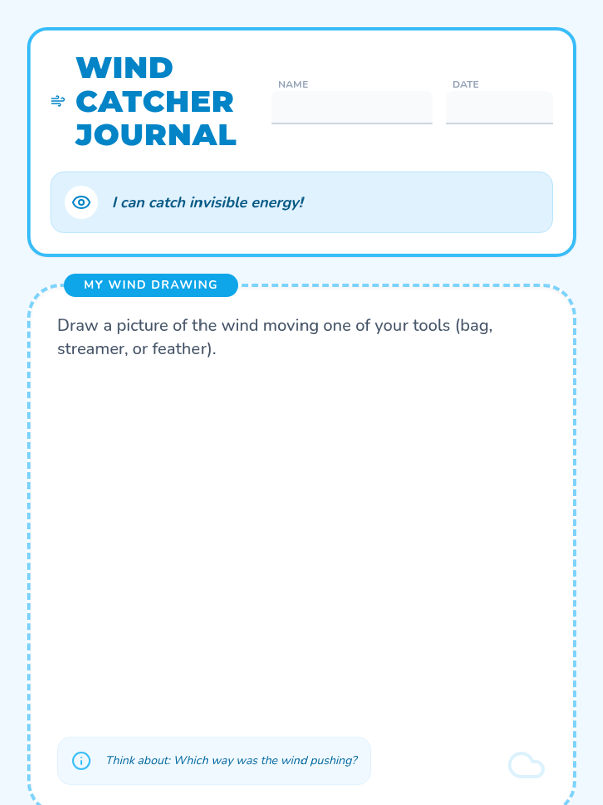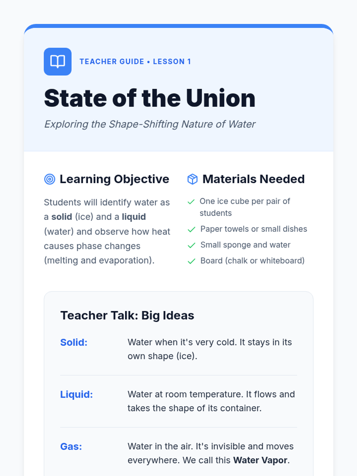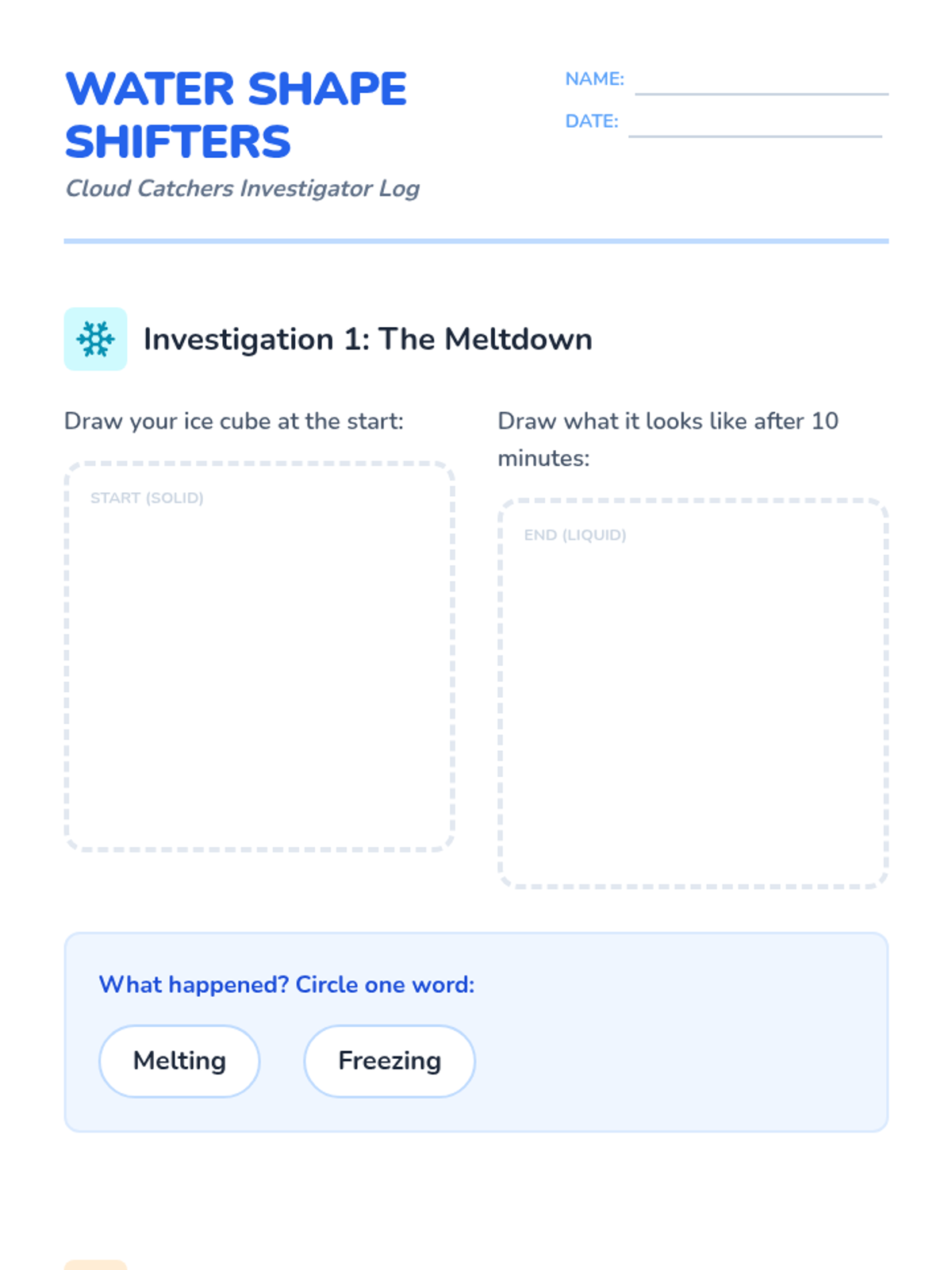 A hands-on investigation into the life of a water drop. Students explore states of matter, simulate cloud formation, categorize precipitation, and trace the water cycle journey from puddles to the sky and back.