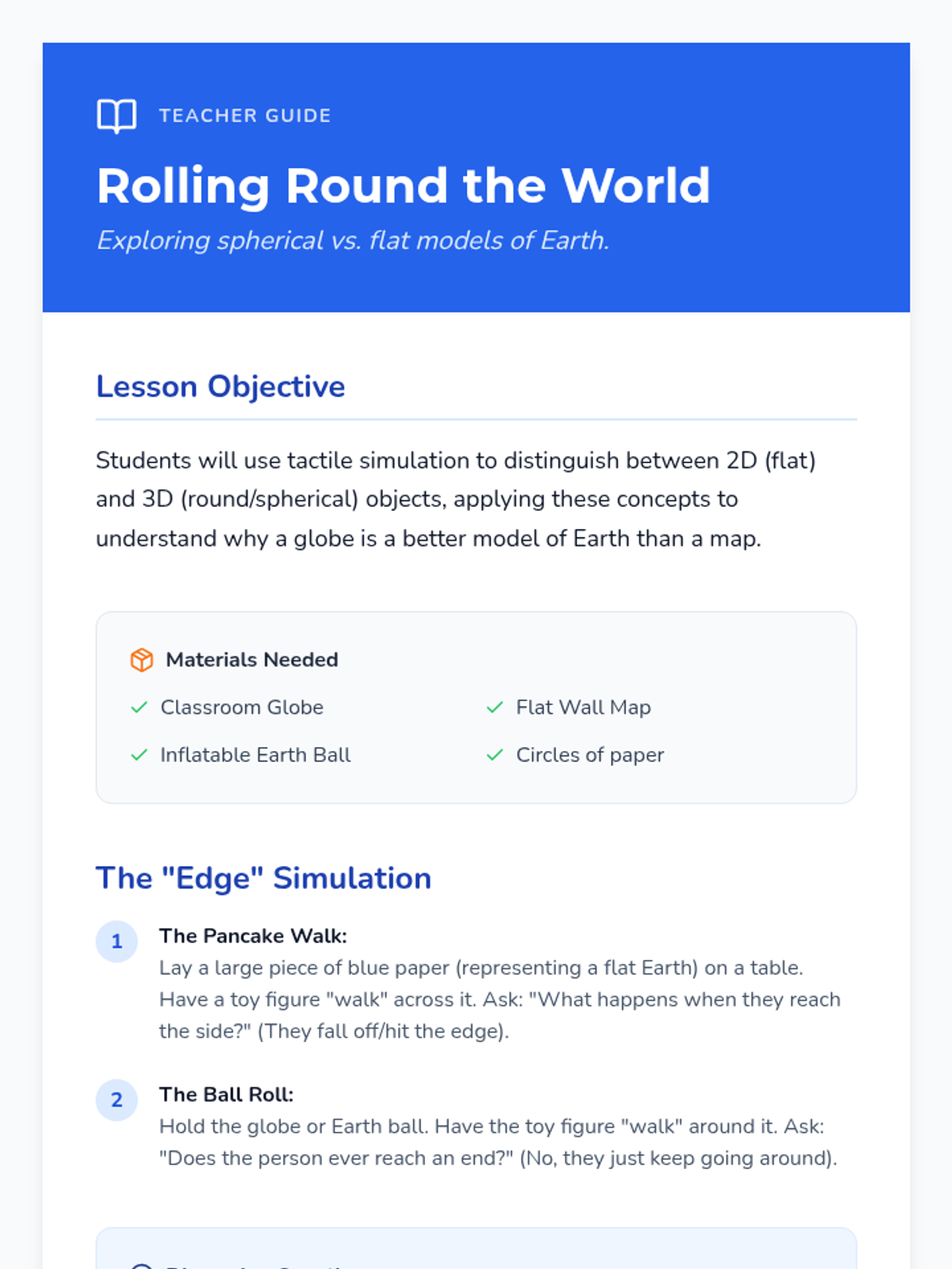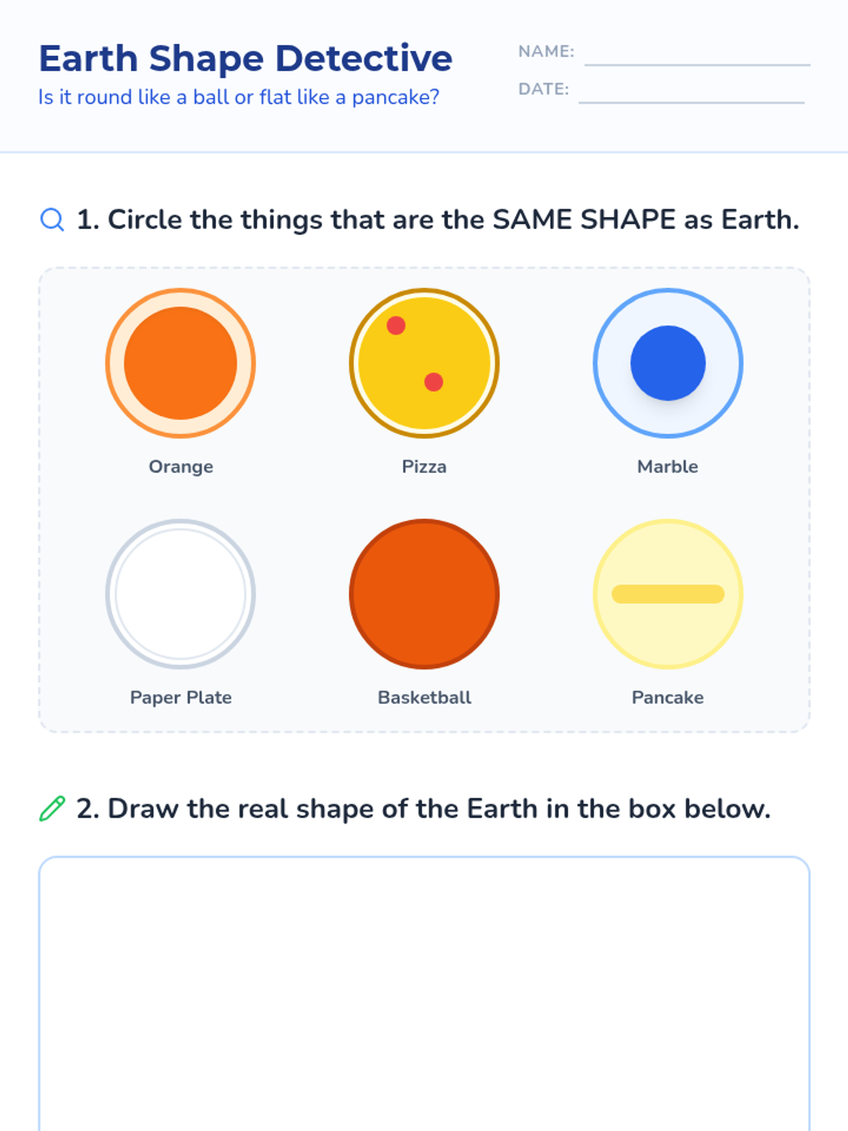A Kindergarten sequence exploring Earth's spherical shape and the basic concept of gravity ('earth pull'). Students use models, physical play, and artistic representation to understand our planet's place in space.