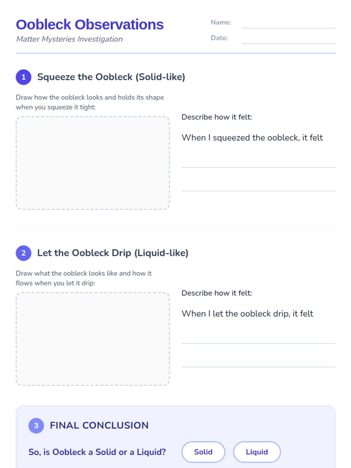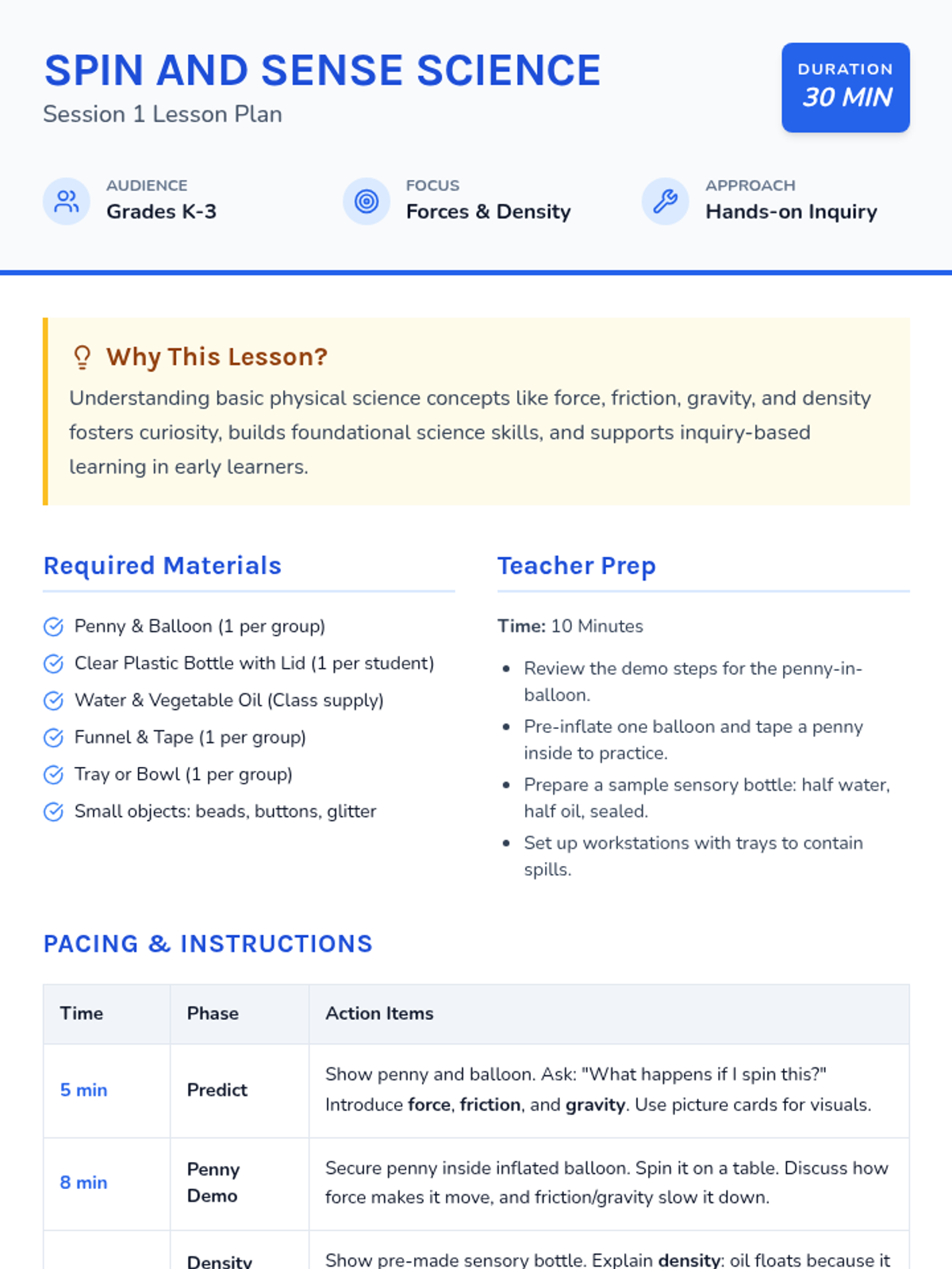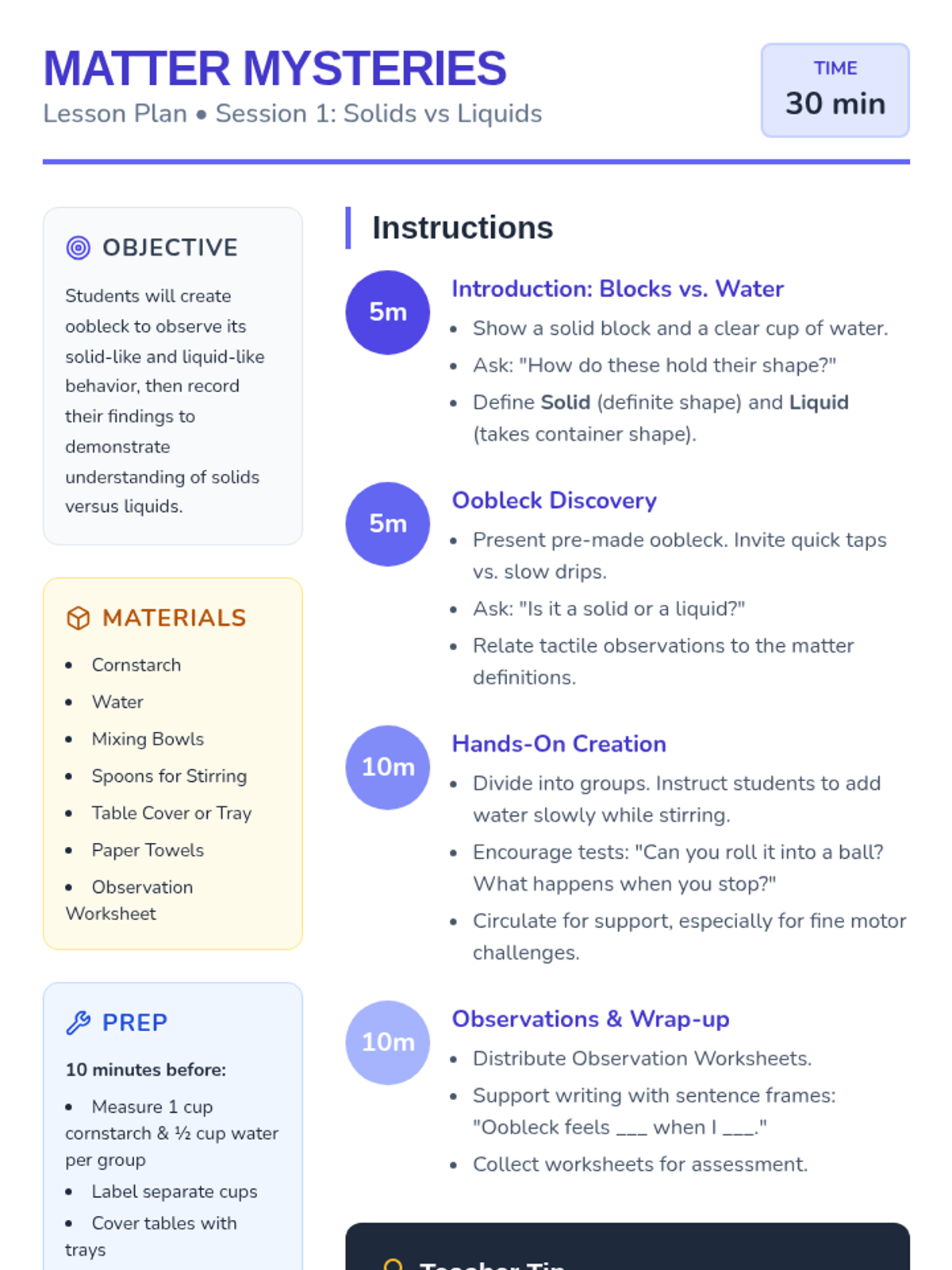 A 2-session science sequence for K-3 students exploring the properties of matter through oobleck and the mechanics of force through a tug-of-war challenge. Students engage in tactile, sensory-rich experiments to build foundational scientific concepts.