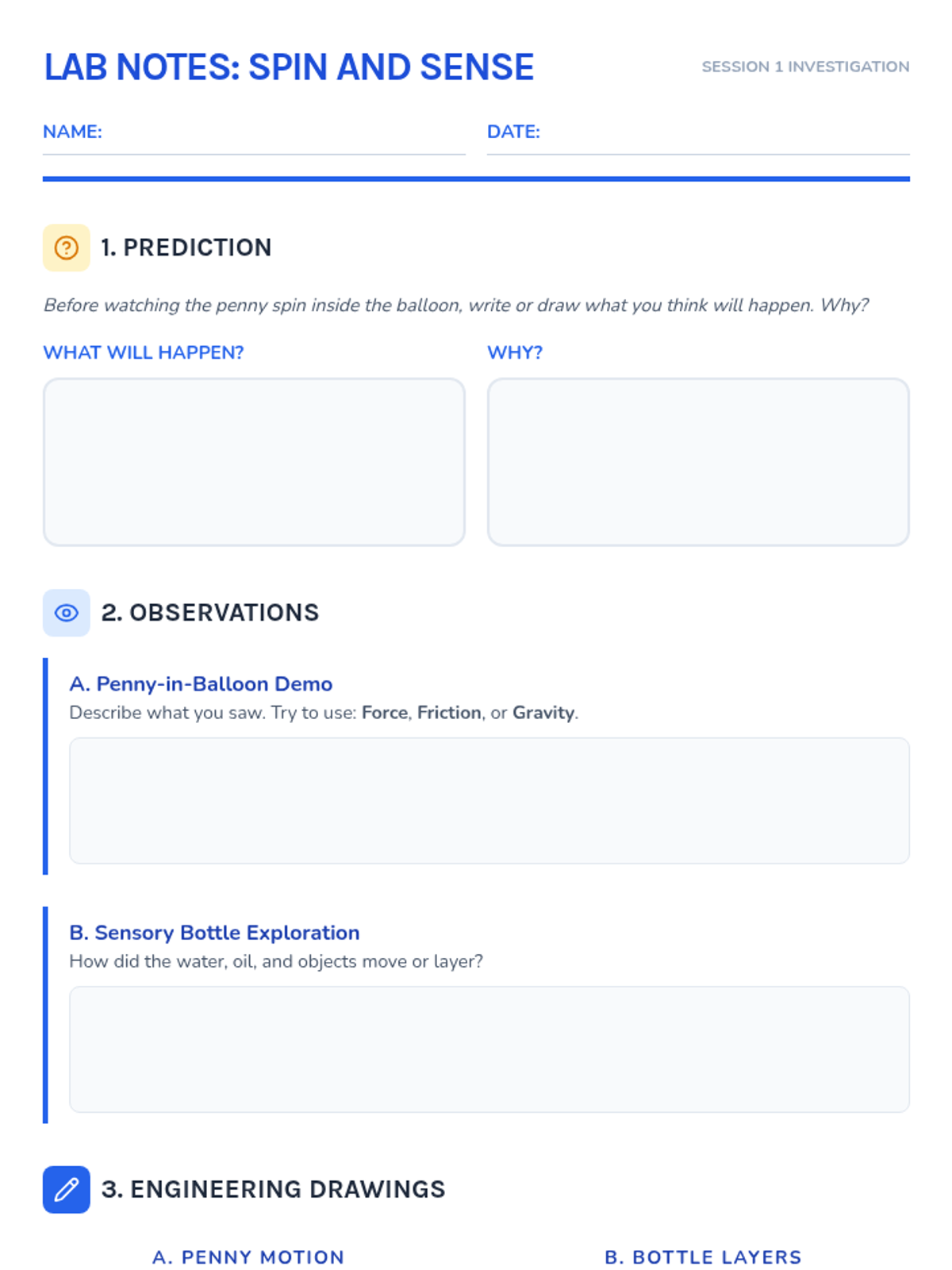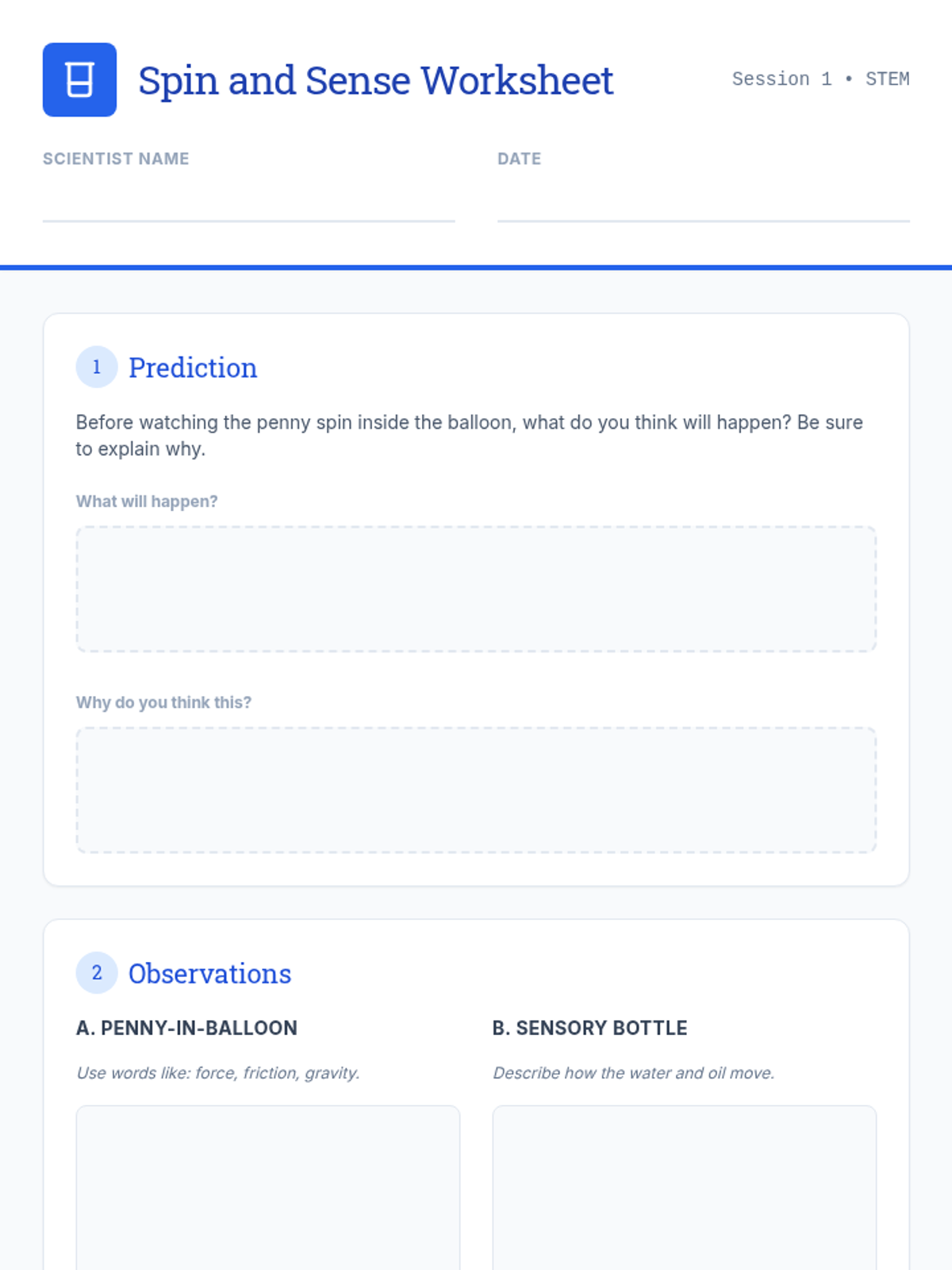 A 4-session STEM series for K-3 students focusing on physics and engineering. Students explore forces, density, action-reaction, and structural stability through hands-on builds including sensory bottles, balloon rockets, and marshmallow towers.