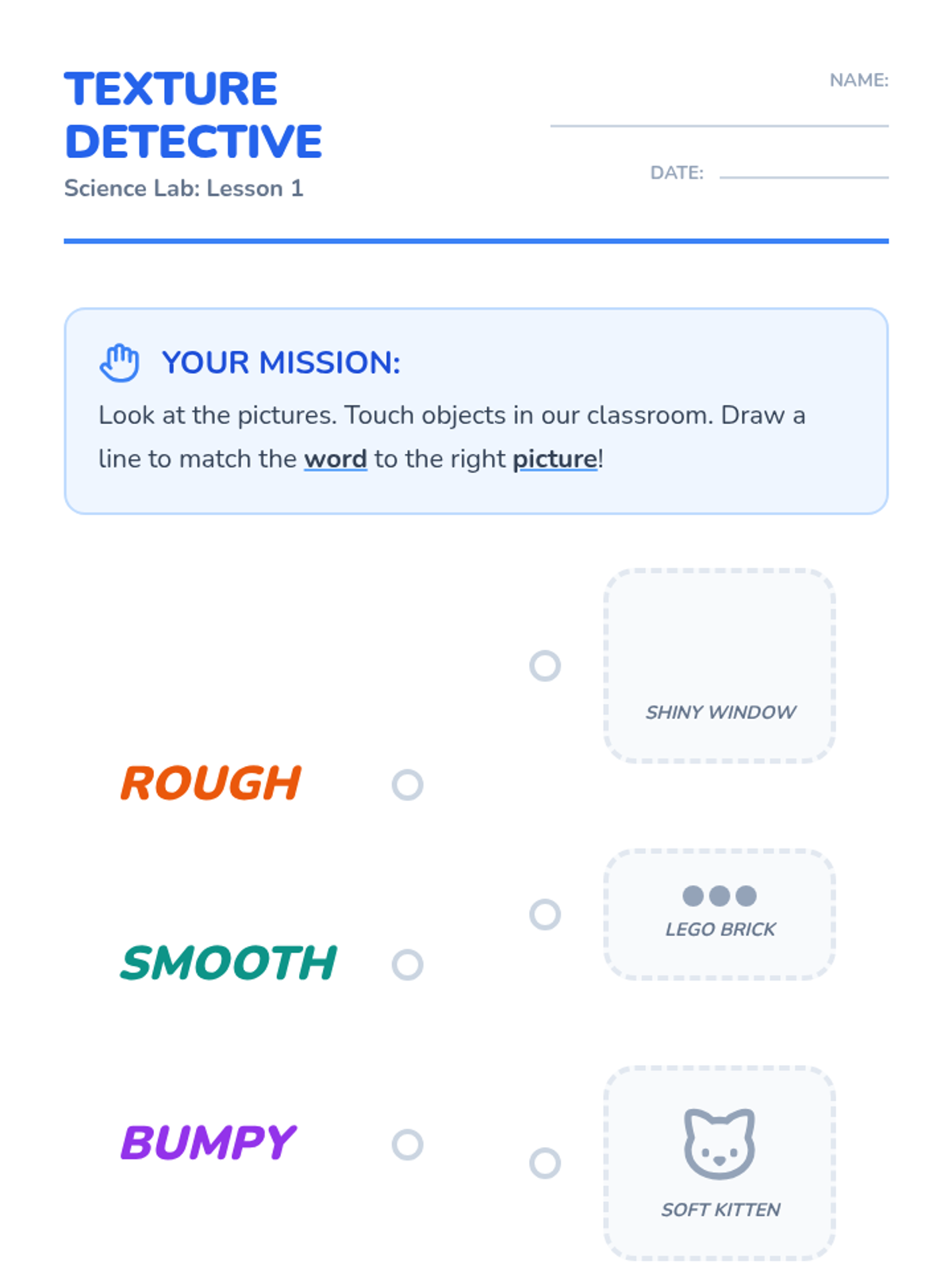 A Kindergarten science sequence exploring the tactile properties of materials (texture, hardness, flexibility) through sensory observation, classification, and inquiry-based challenges.