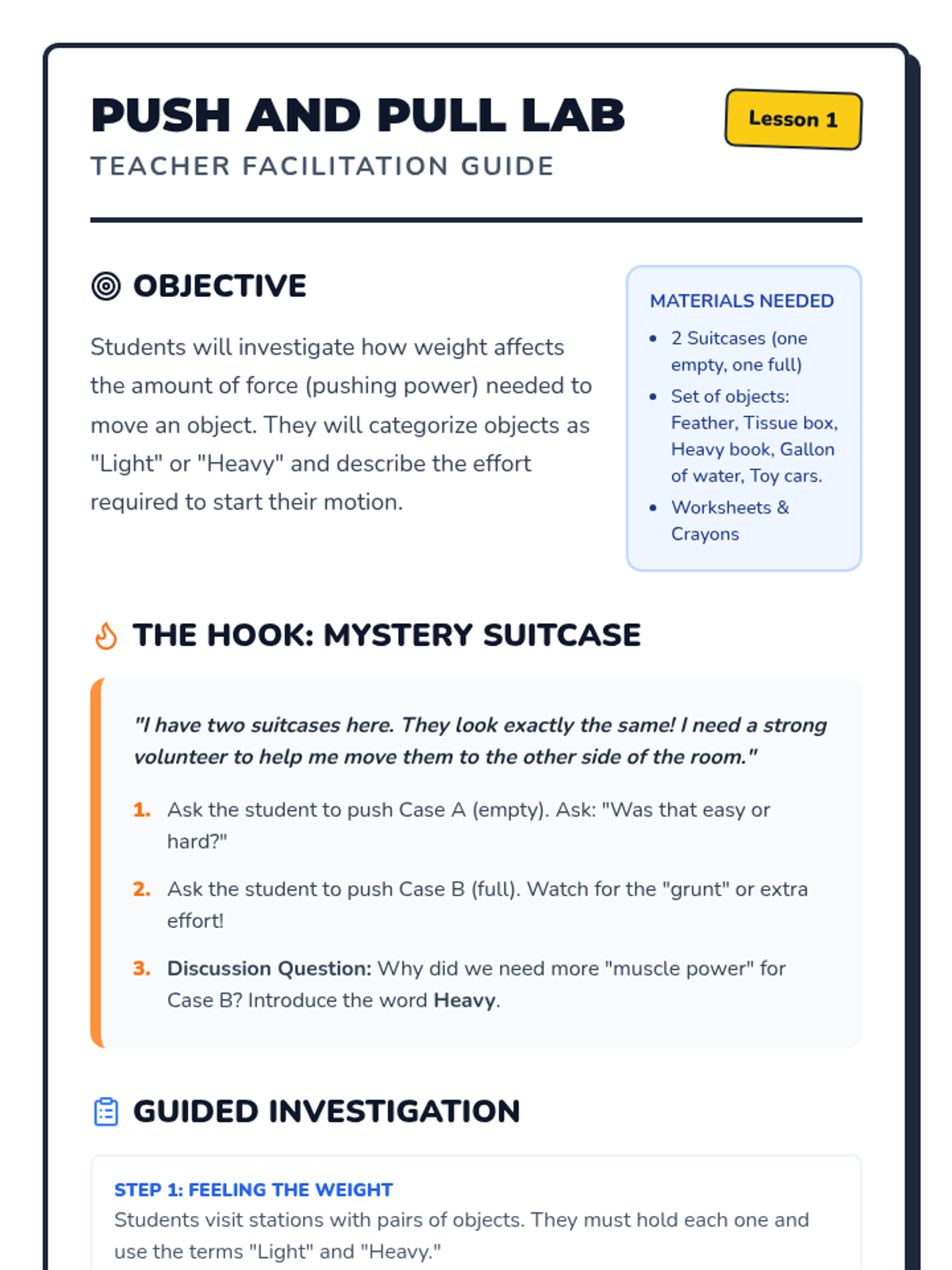 A hands-on introductory sequence for early elementary students to explore the mechanics of levers and fulcrums using everyday classroom objects.