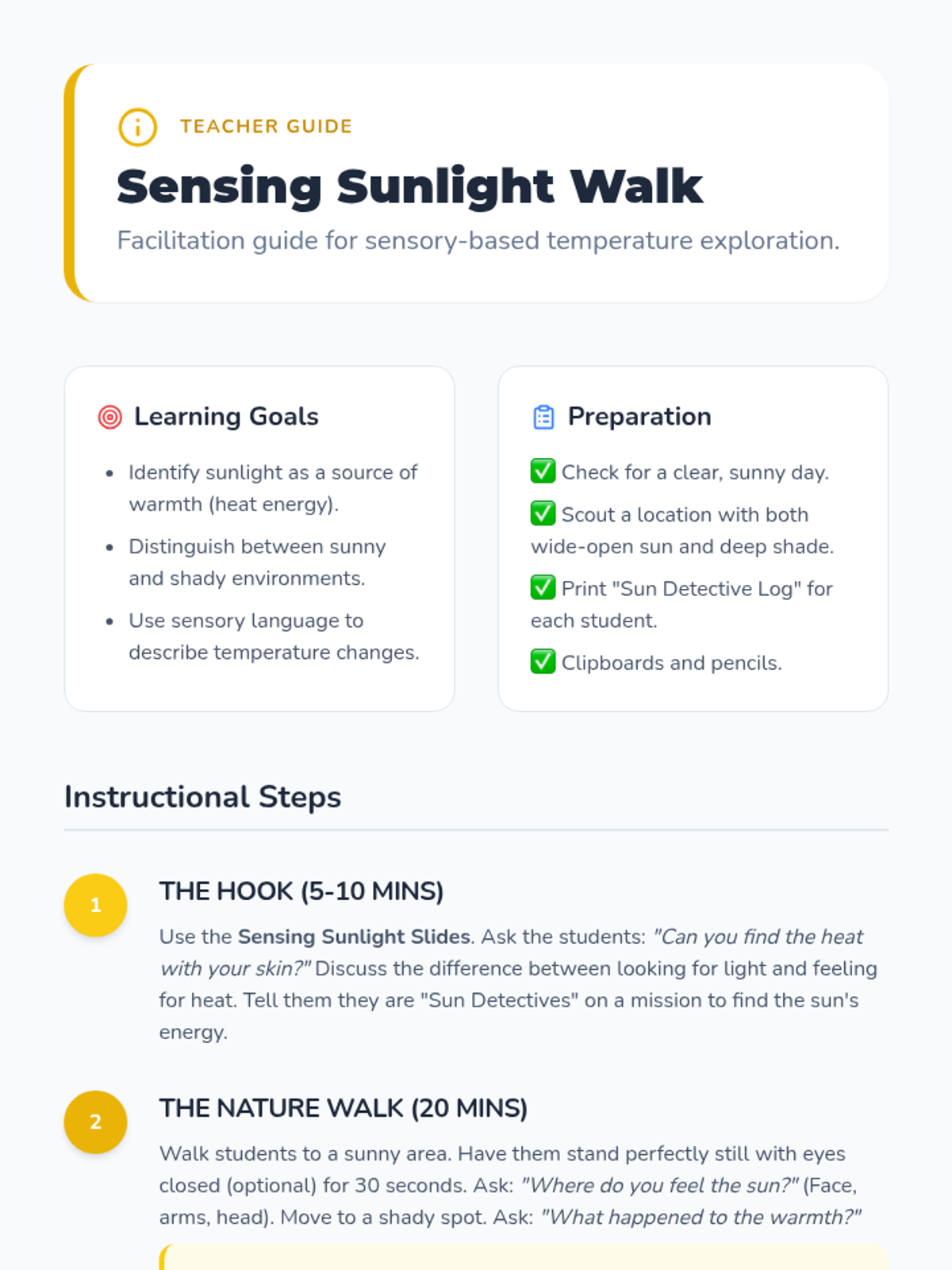 A Kindergarten science sequence where students explore sunlight as a source of heat and energy through sensory walks, ice-melting experiments, color absorption tests, and engineering shade structures.