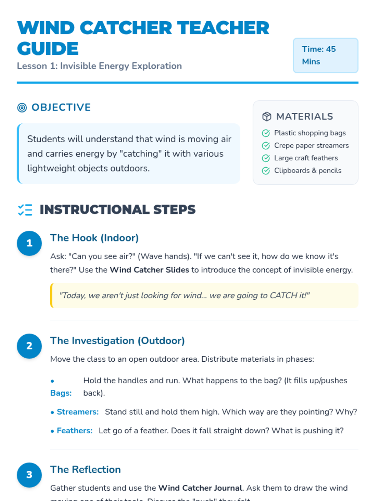 A Kindergarten science sequence where students investigate renewable energy by building devices that harness wind and water. Students explore invisible forces through hands-on experiments, building pinwheels, water wheels, and sailboats.