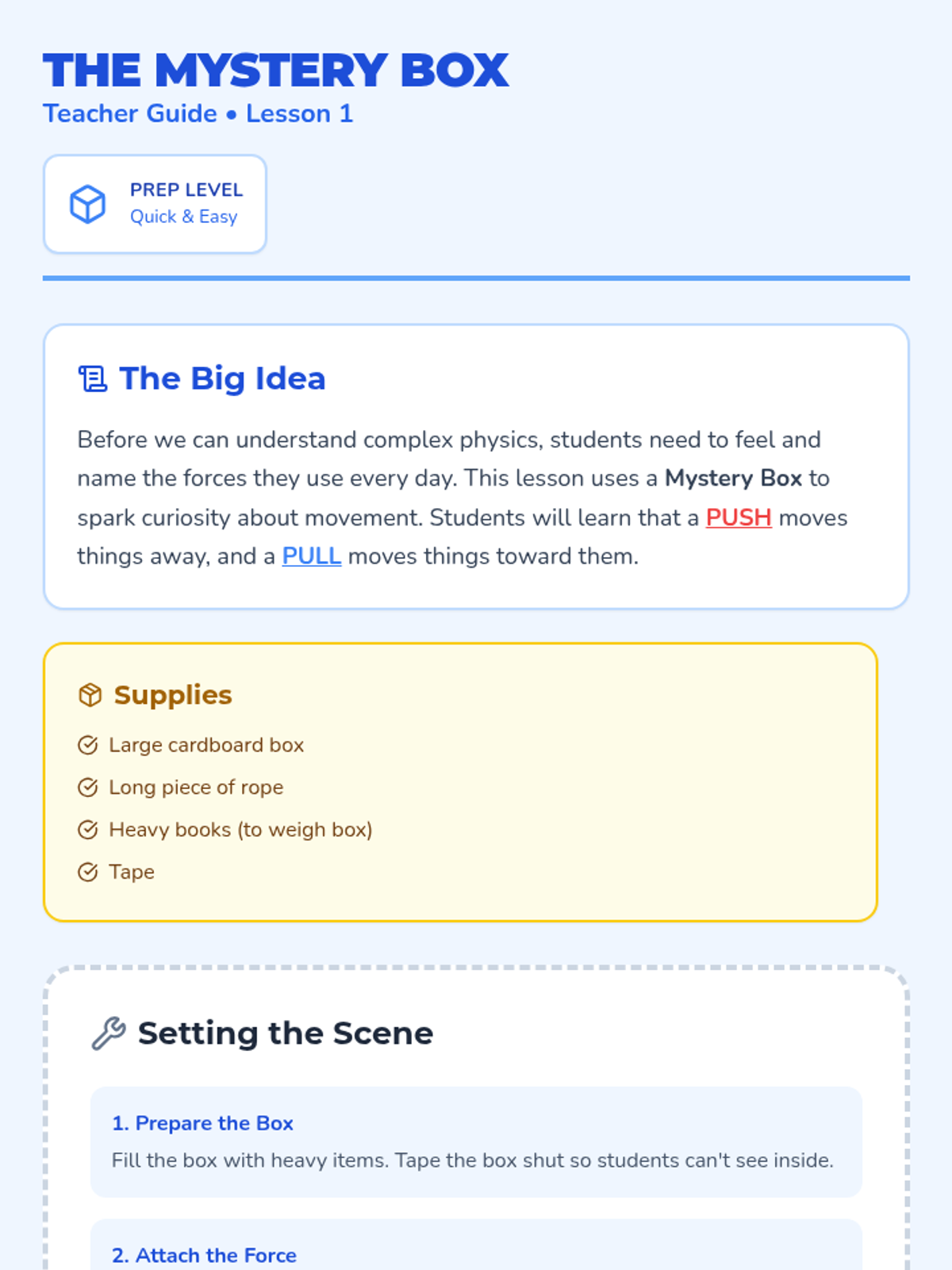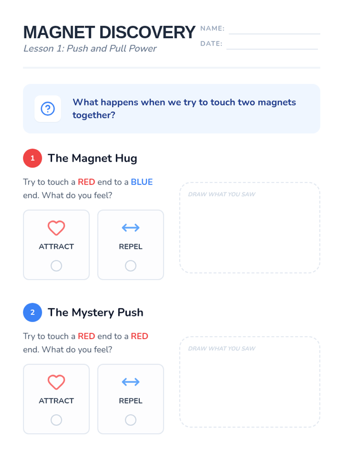 A kindergarten physics sequence exploring the invisible forces of magnetism, polarity, and how magnets can move objects without physical contact. Students engage in tactile, game-based learning to master the concepts of attract and repel.