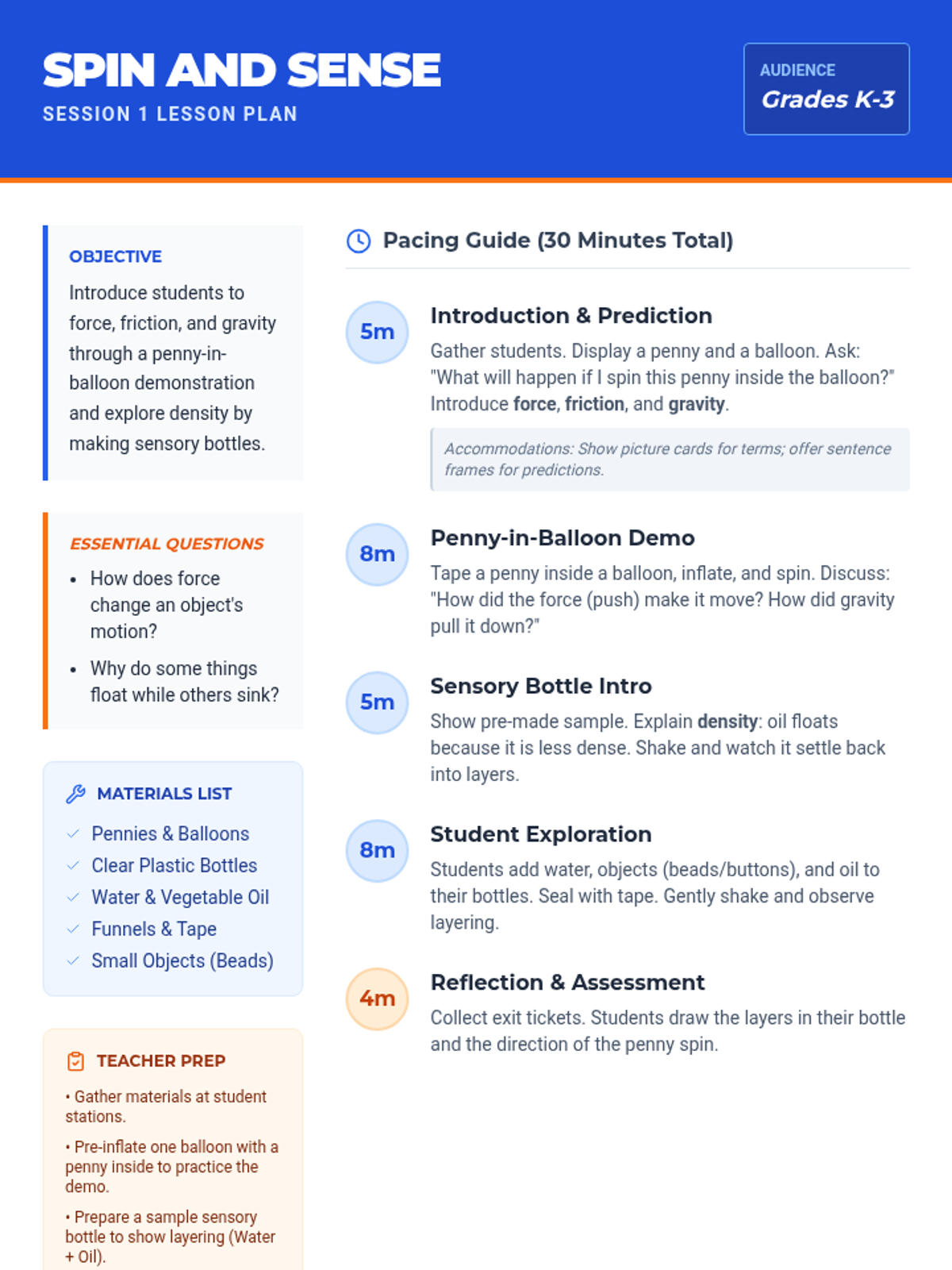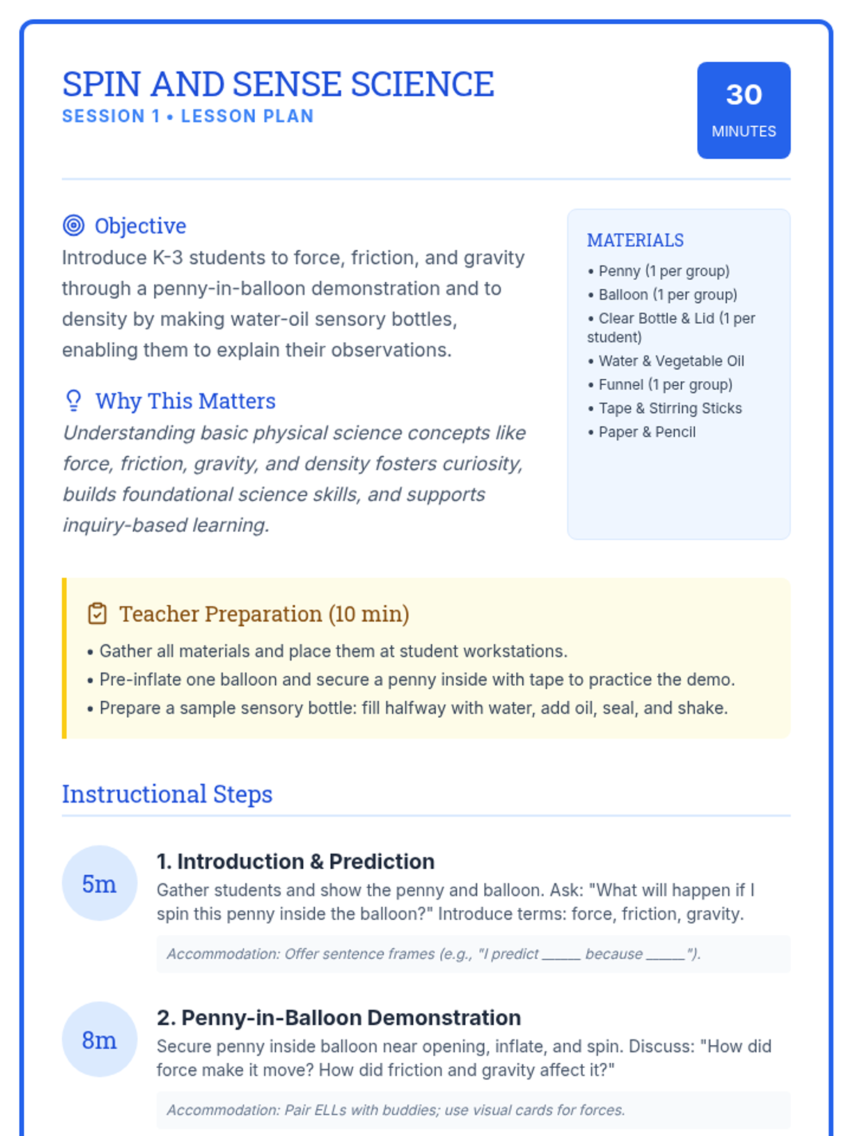 A 4-session K-3 STEM series where students explore forces, density, magnetism, and stability through hands-on challenges. Each 30-minute session builds inquiry, creativity, and foundational science skills through active experimentation and reflection.