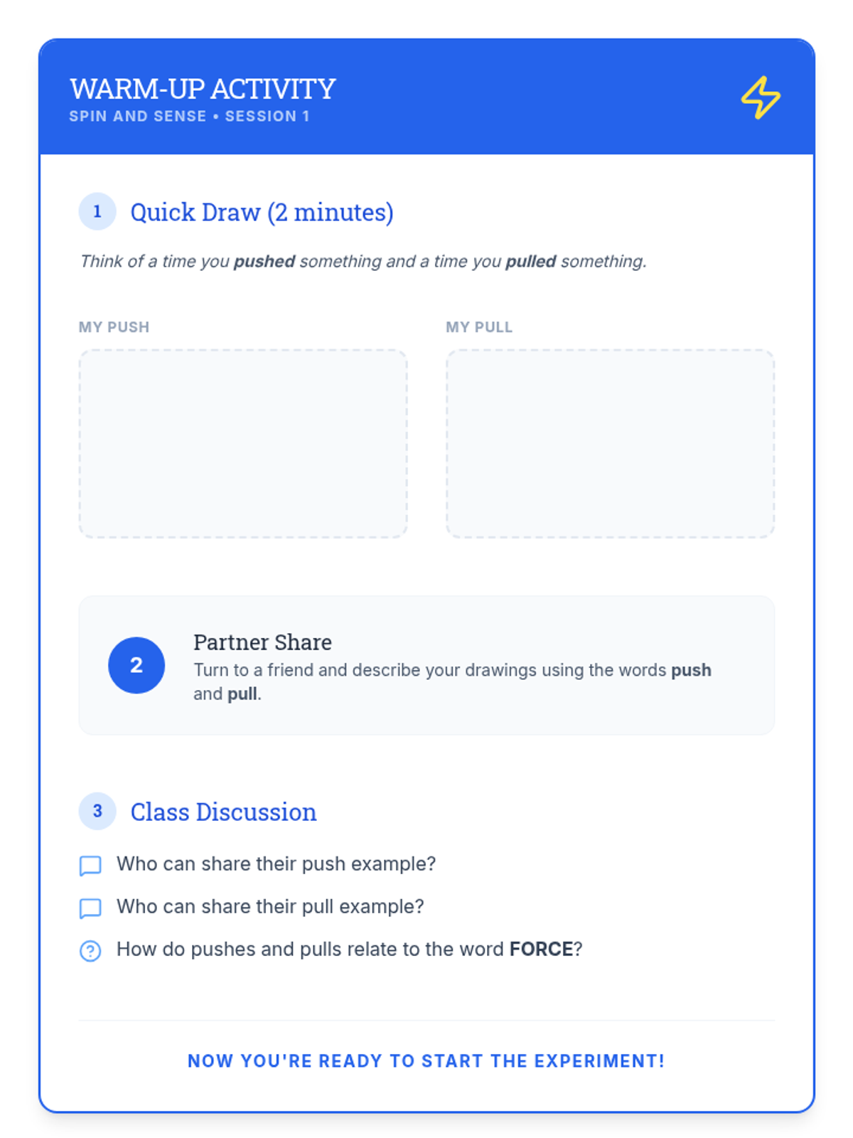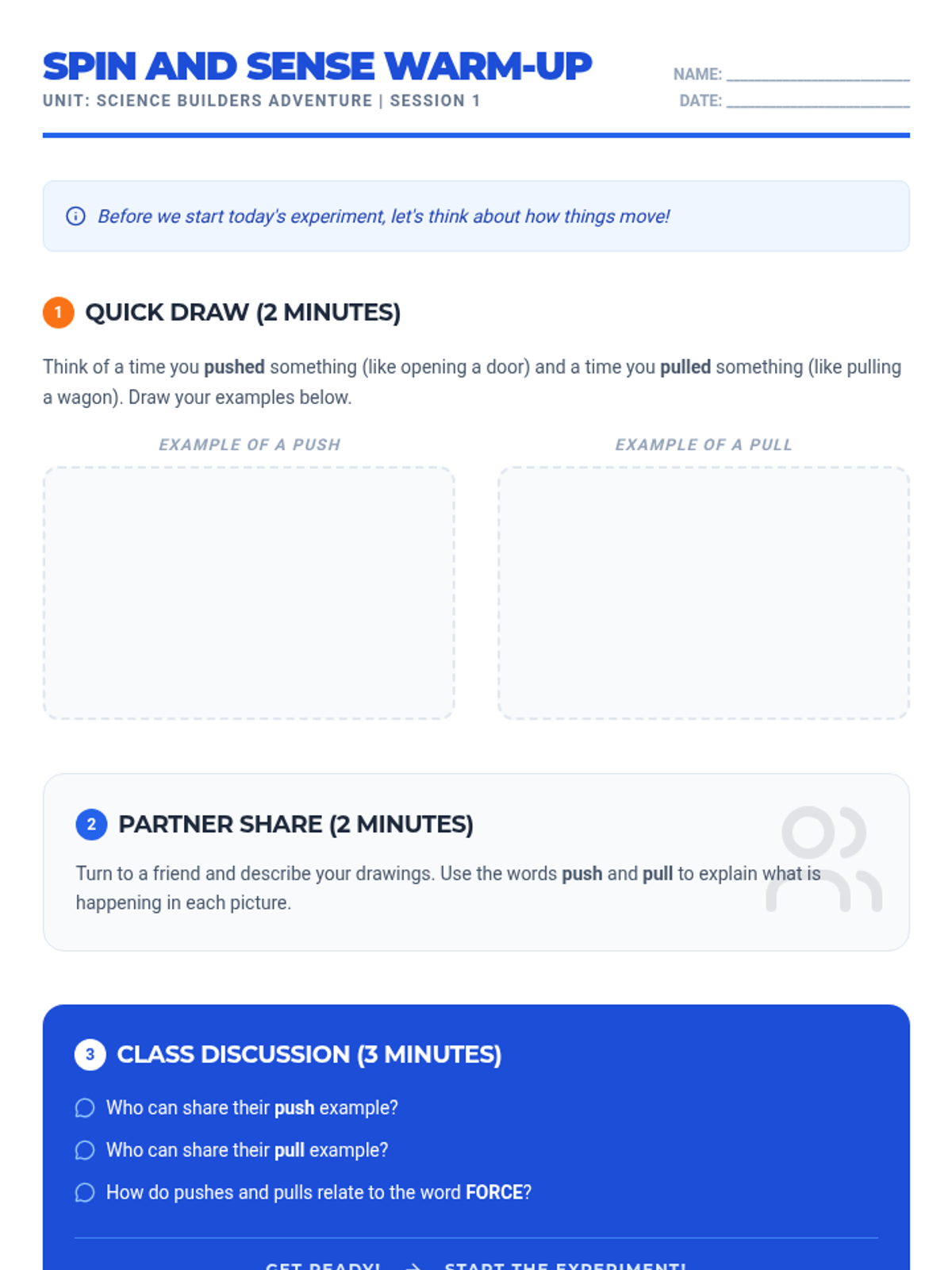 A Kindergarten sequence exploring pushes, pulls, force strength, and direction through play-based inquiry and physical experimentation.