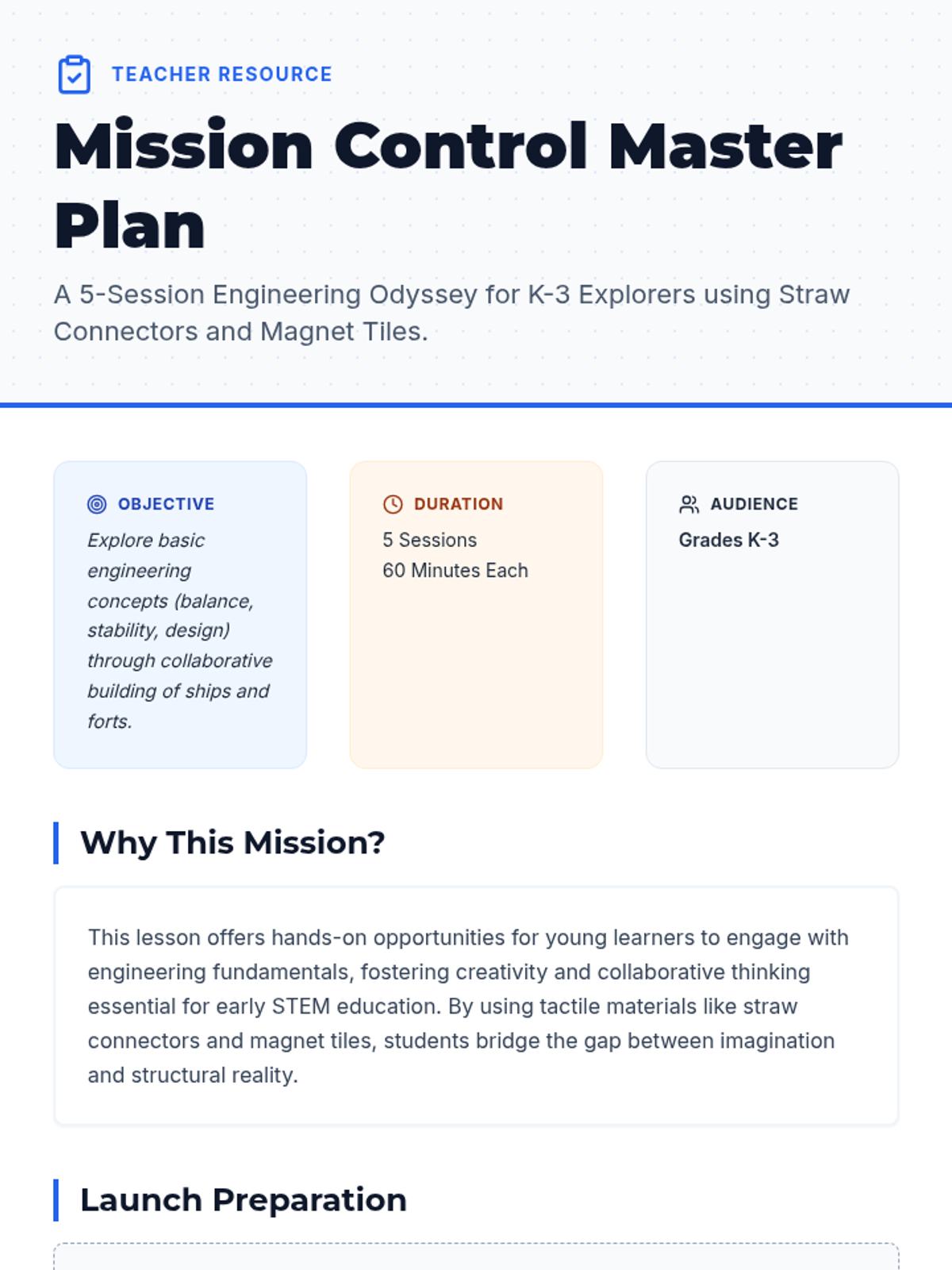 A 5-session engineering sequence for K-3 students using straw connectors and magnet tiles to build space ships, forts, and bridges. Students develop problem-solving, teamwork, and basic engineering skills through hands-on challenges and games.