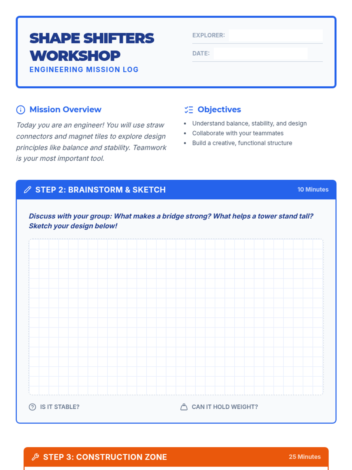 A Pre-K engineering sequence exploring shape composition, stability, and structural design through hands-on block play and spatial reasoning challenges.