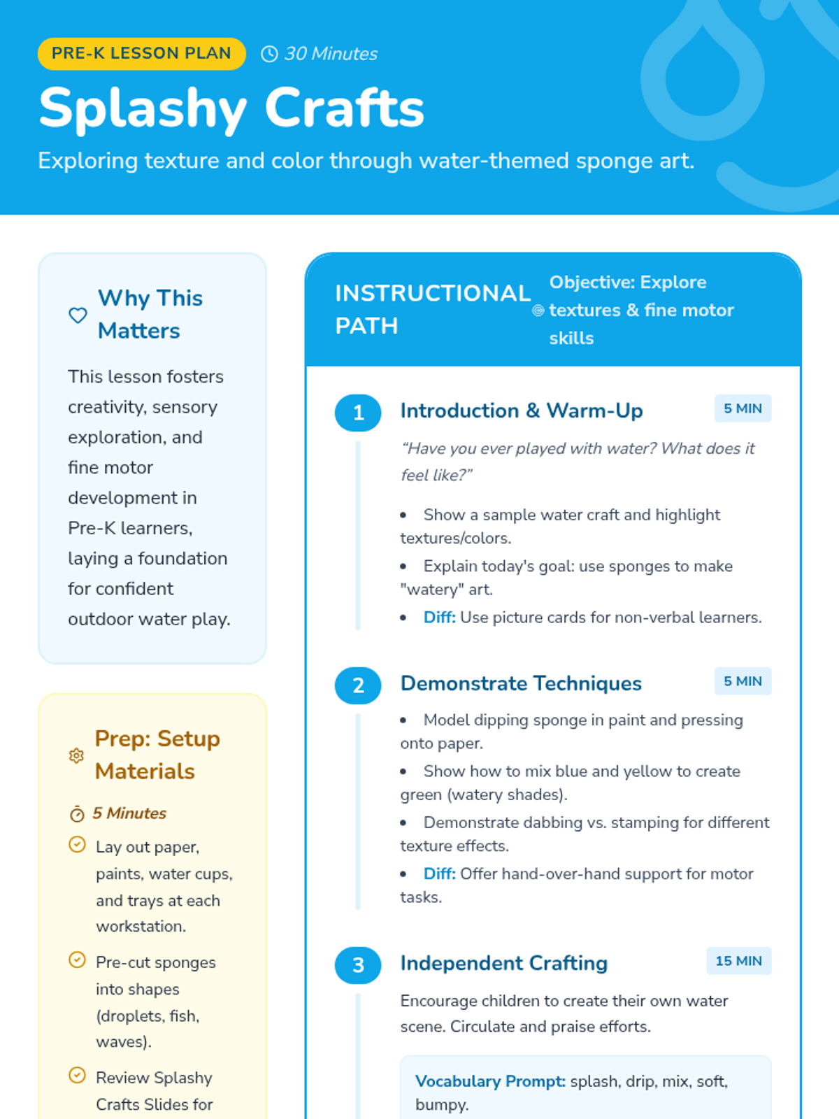 A sensory-rich Pre-K unit where students explore the properties of water through hands-on crafting, nature exploration, engineering, and dramatic play. This sequence fosters fine motor skills, creative expression, and early scientific inquiry.