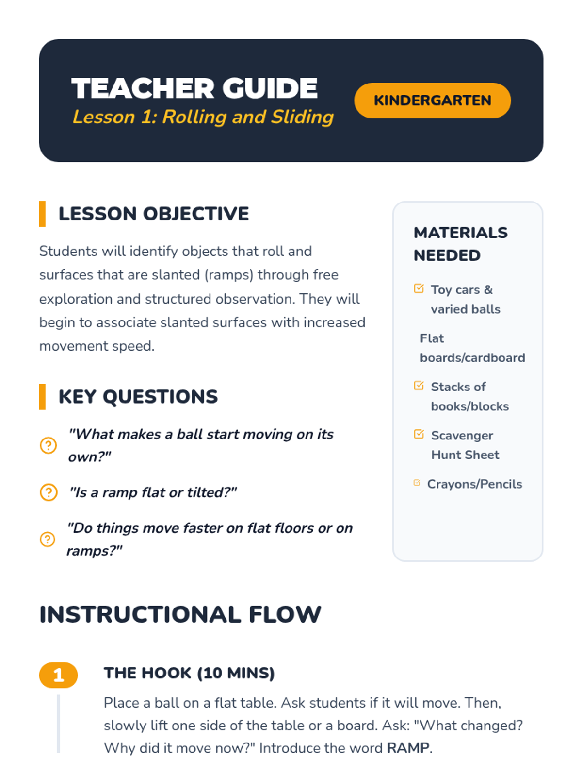 A Kindergarten science sequence exploring mechanical energy through ramps. Students investigate how height, surface texture, and weight affect the speed and distance of rolling objects, culminating in an engineering design challenge.