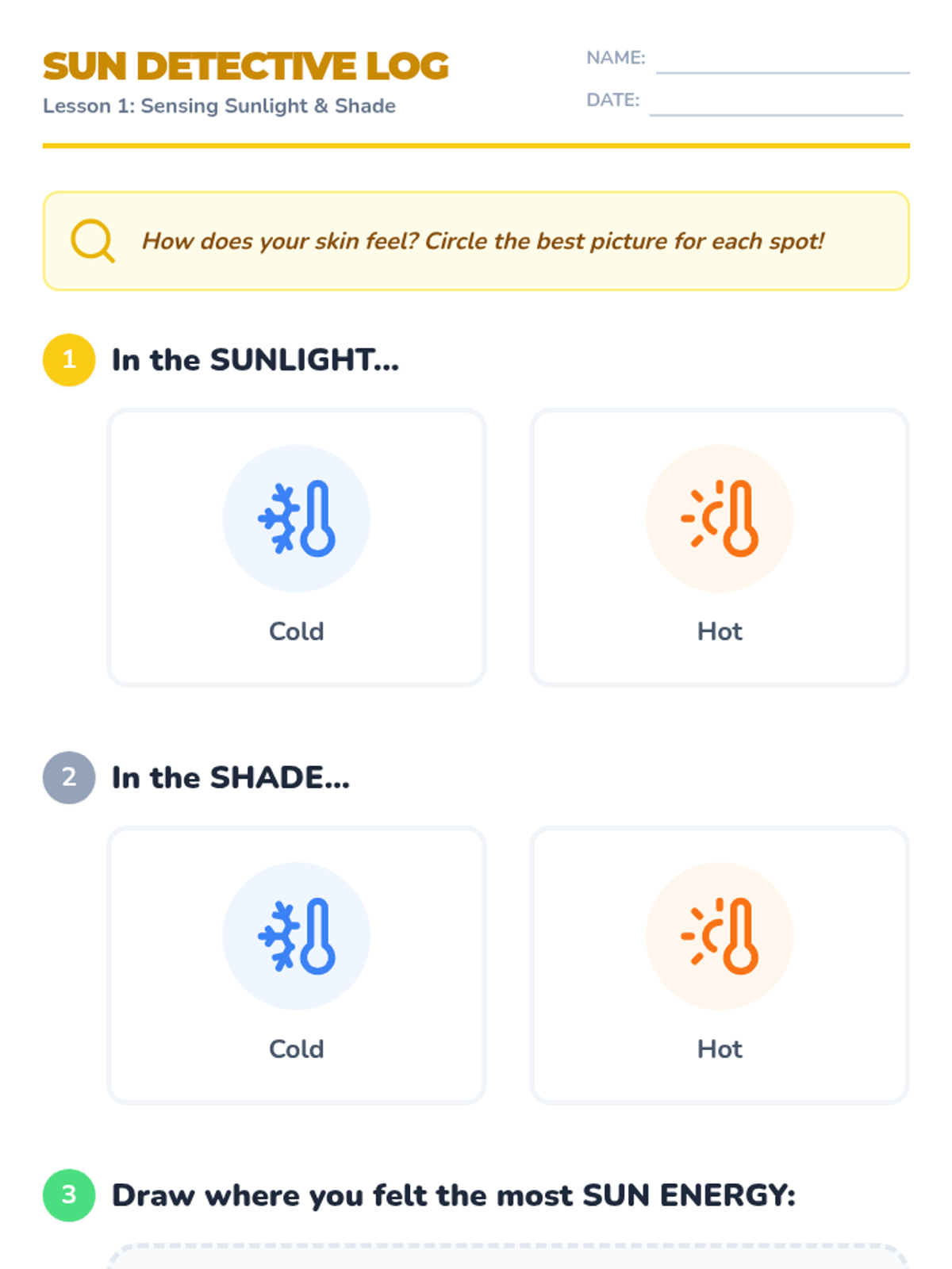 A project-based sequence for Kindergarten where students explore the sun's heat and use engineering design to build shade structures that protect ice cubes from melting. Students progress from sensory observations to data collection and finally to a hands-on construction challenge.