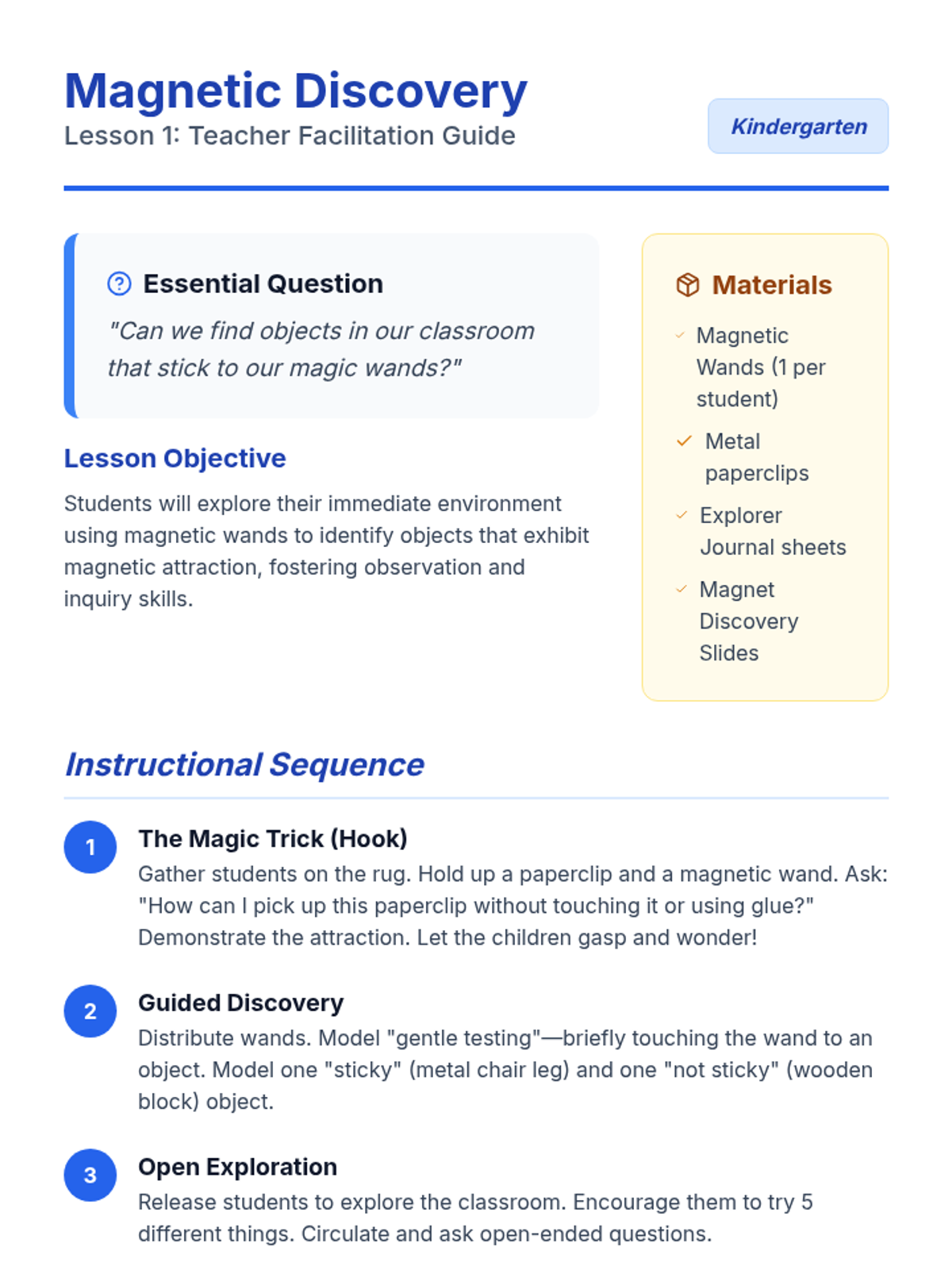 A Kindergarten sequence introducing the fundamentals of magnetism through hands-on exploration, prediction, and classification. Students progress from open discovery to understanding that magnets attract specific metals like iron and steel.