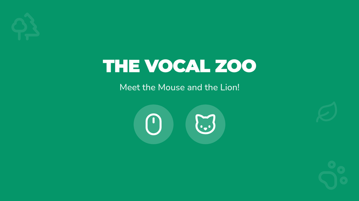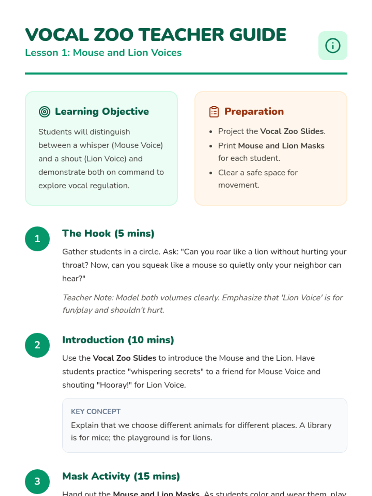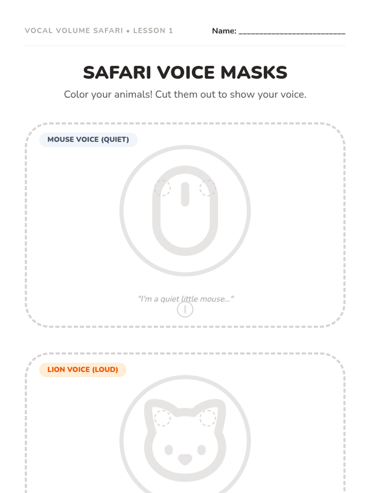 A game-based sequence using animal personas (Mouse, Lion, Puppy) to help Pre-K students regulate their vocal volume and understand social context for different voice levels.