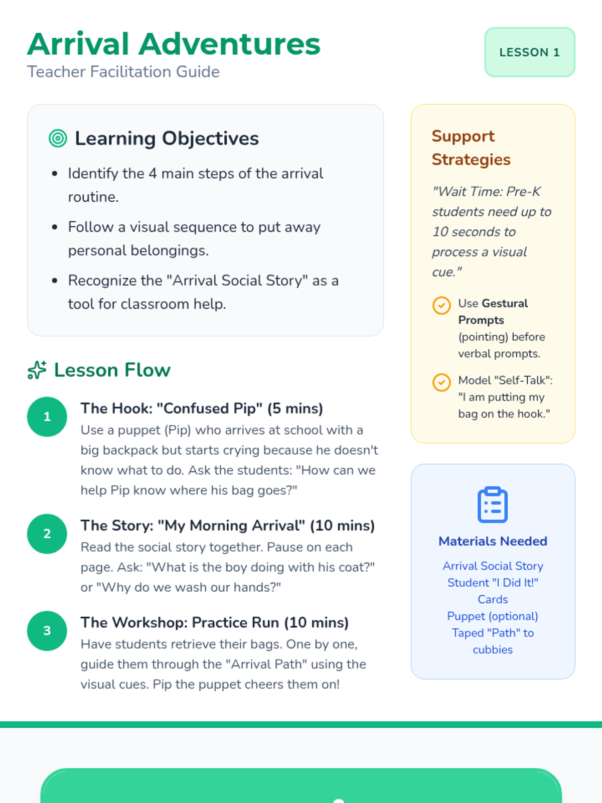 A comprehensive sequence designed to teach preschoolers essential classroom routines (Morning, Snack, and Cleanup) through stories, games, and visual aids.