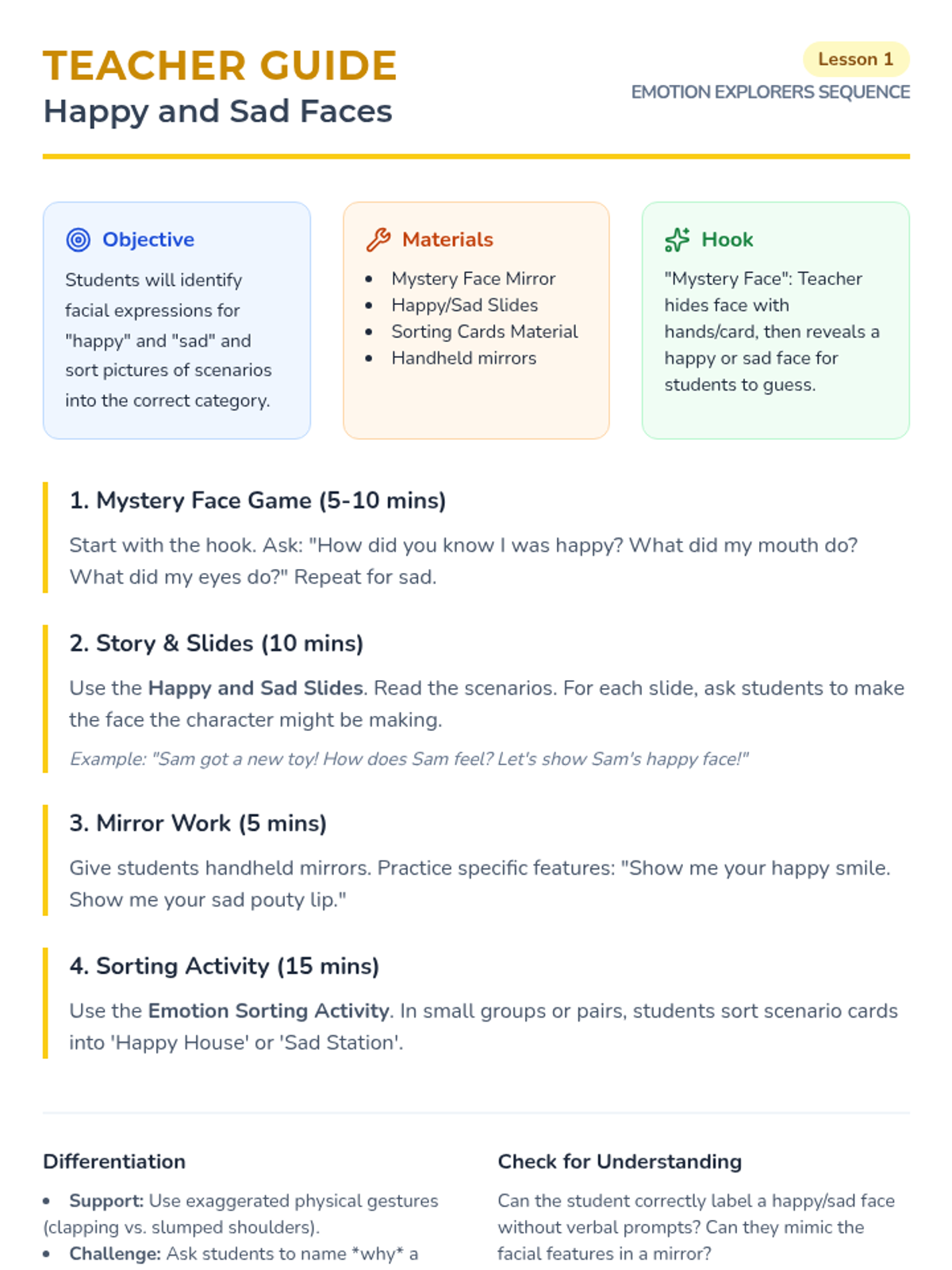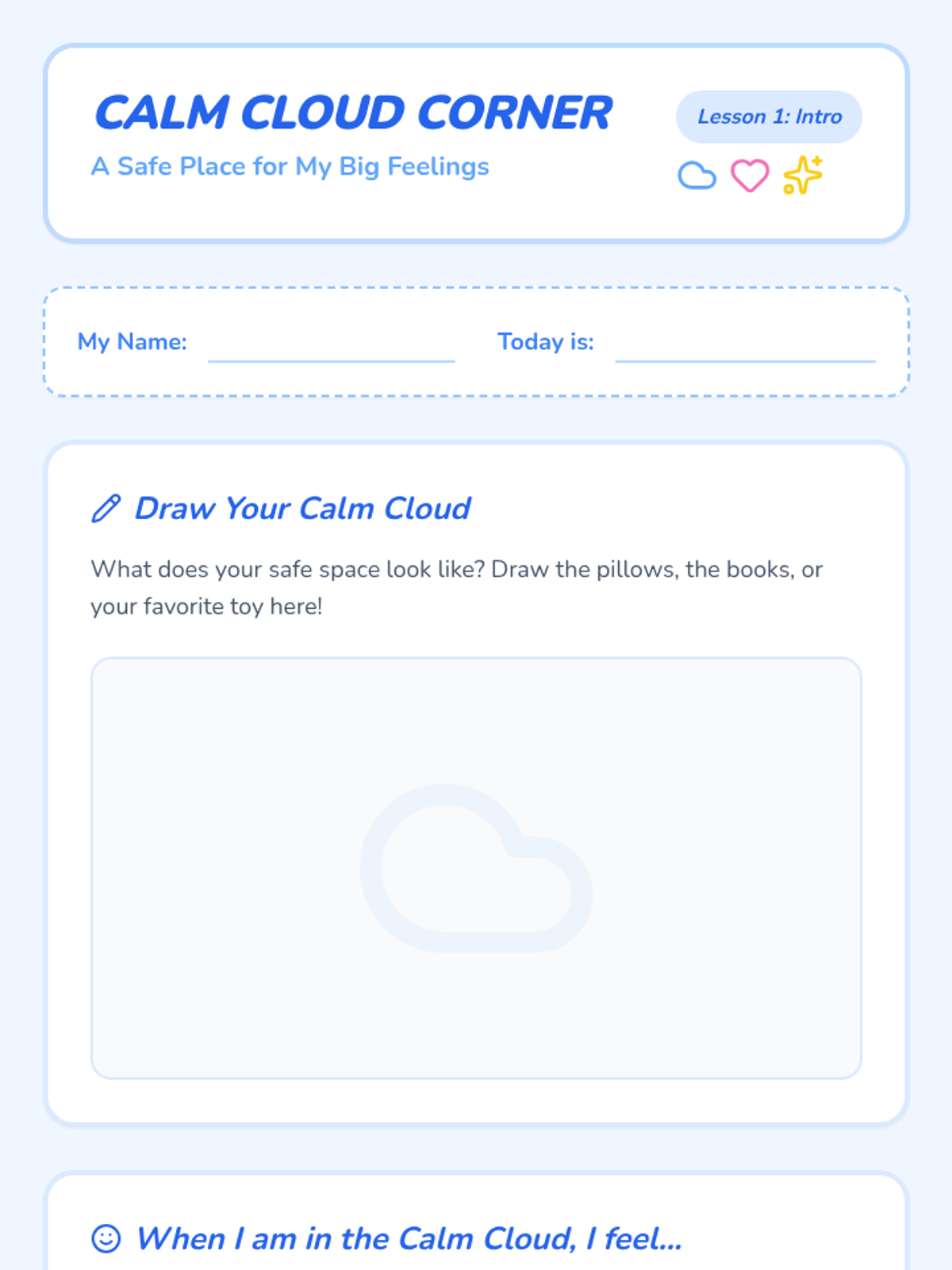 A foundational emotional intelligence unit designed for 4-year-olds to help them identify basic emotions and learn concrete self-regulation strategies. The resources use simple visuals and clear prompts to build self-awareness and provide tools for managing big feelings.
