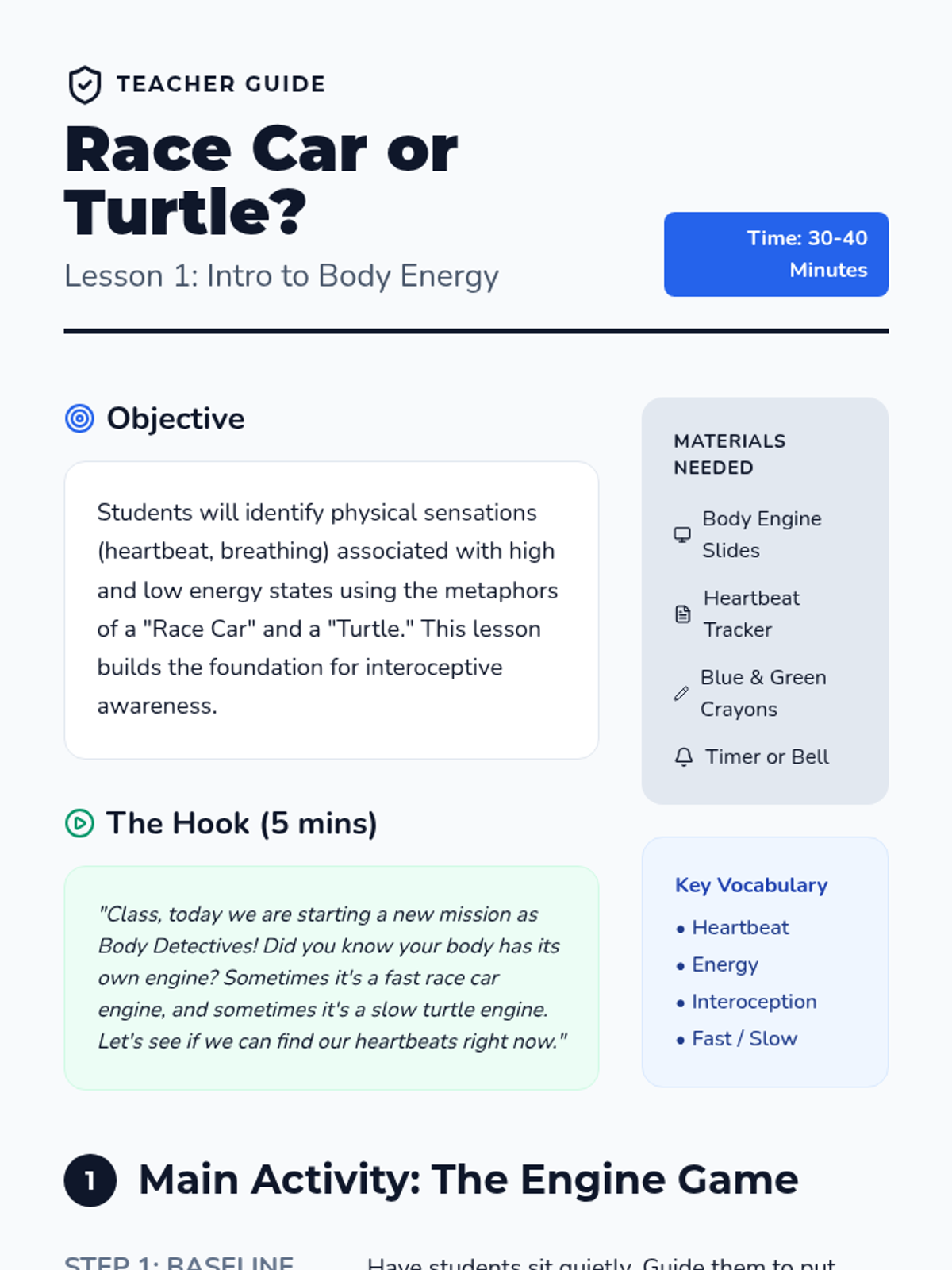 A 5-lesson unit for Kindergarten students to develop interoception and identify physical body signals associated with emotional dysregulation. Students use playful metaphors like engines, robots, and soda bottles to recognize when their bodies are moving toward a 'high energy' or 'tense' state.
