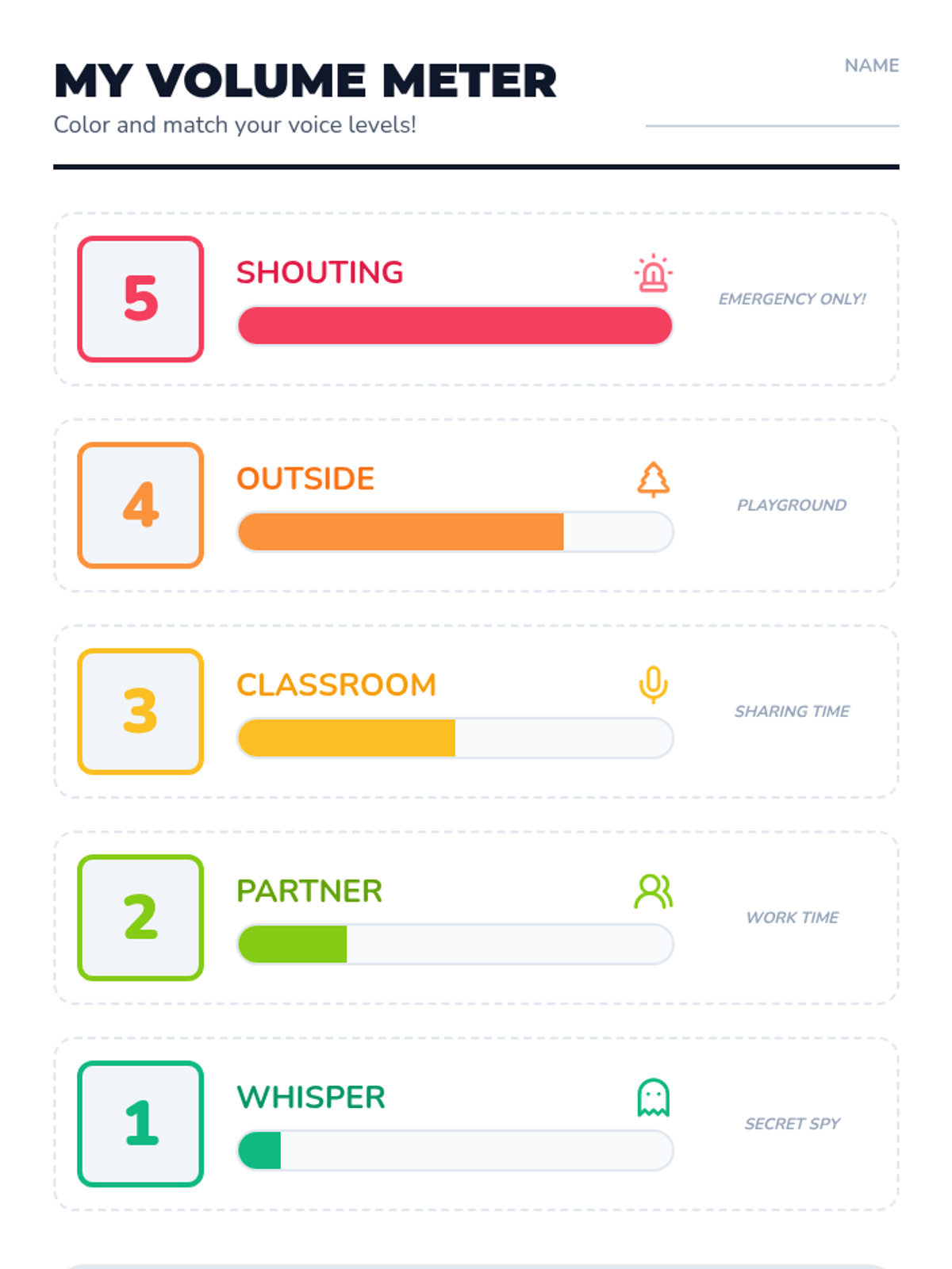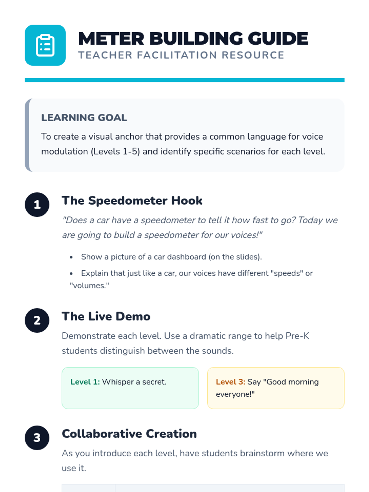 A comprehensive sequence for Pre-K students focusing on visual supports for voice modulation. Students learn to use a 5-level volume meter to match their voices to various classroom activities through play-based and mastery-focused workshops.