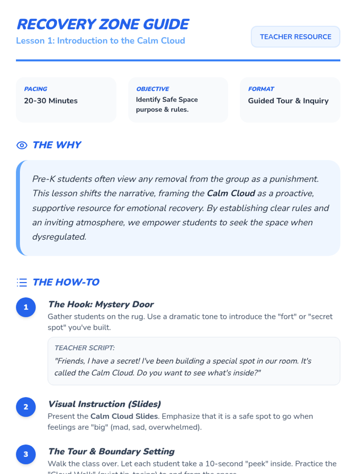 A sequence focused on environmental modifications and sensory tools to support Pre-K students in recovering from emotional dysregulation. Students explore calm-down areas and various sensory inputs to build a personal repertoire of self-regulation strategies.