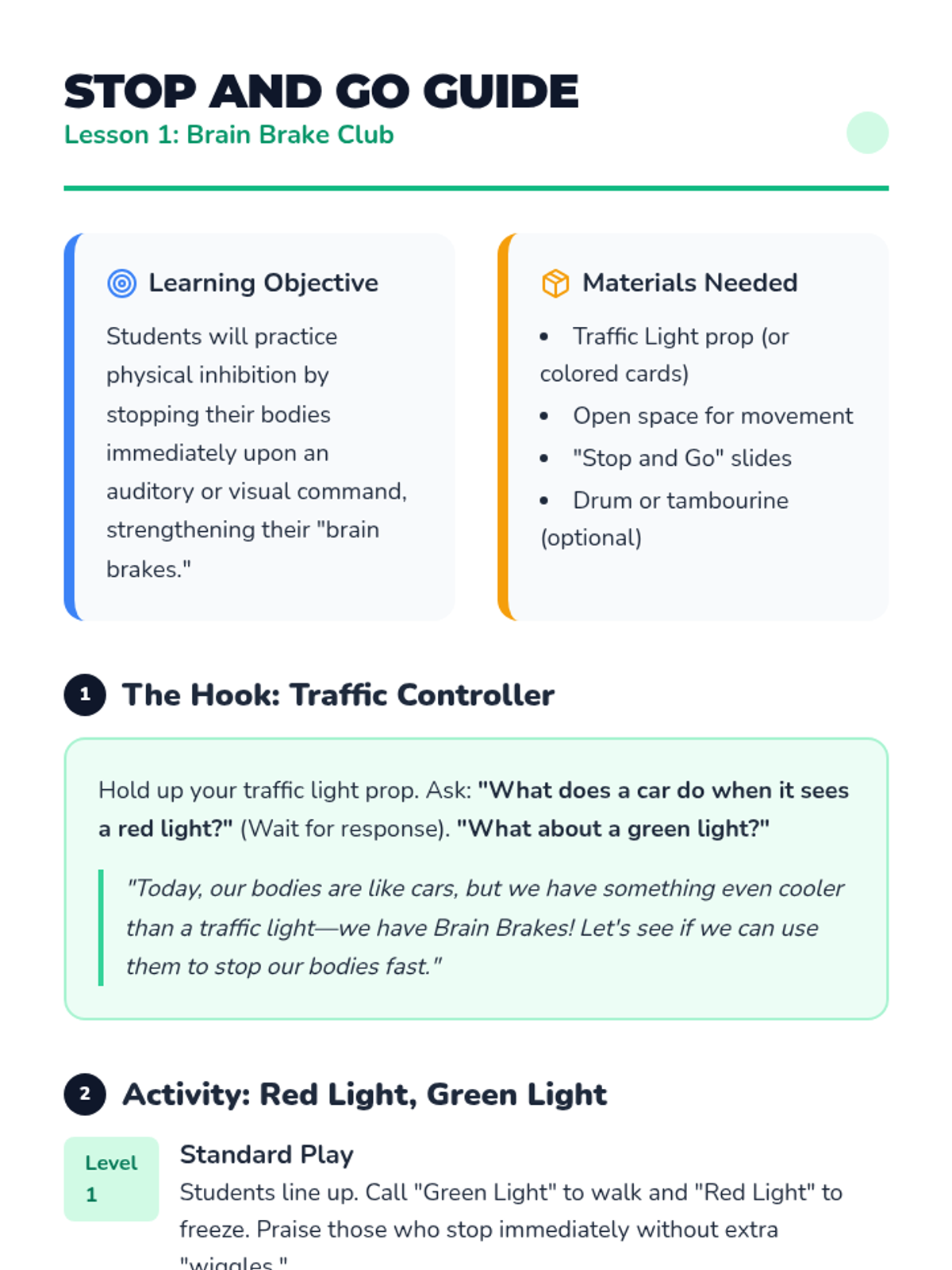 A 5-lesson sequence for Pre-K students focused on developing impulse control, self-regulation, and waiting skills through structured play and physical inhibition games.