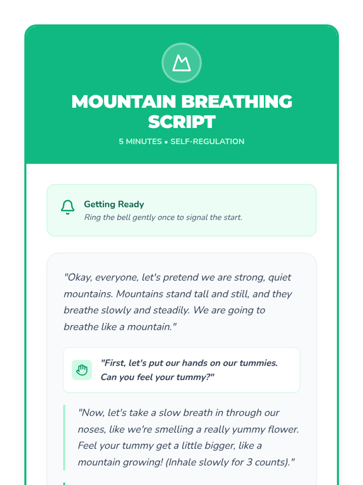 This sequence introduces Pre-K students to safe place visualization through four nature-based archetypes: the burrow, the tree, the cloud, and the stream. Each lesson focuses on a specific aspect of emotional regulation, such as protection, grounding, lightness, and flow, helping children build a mental library of calming images.