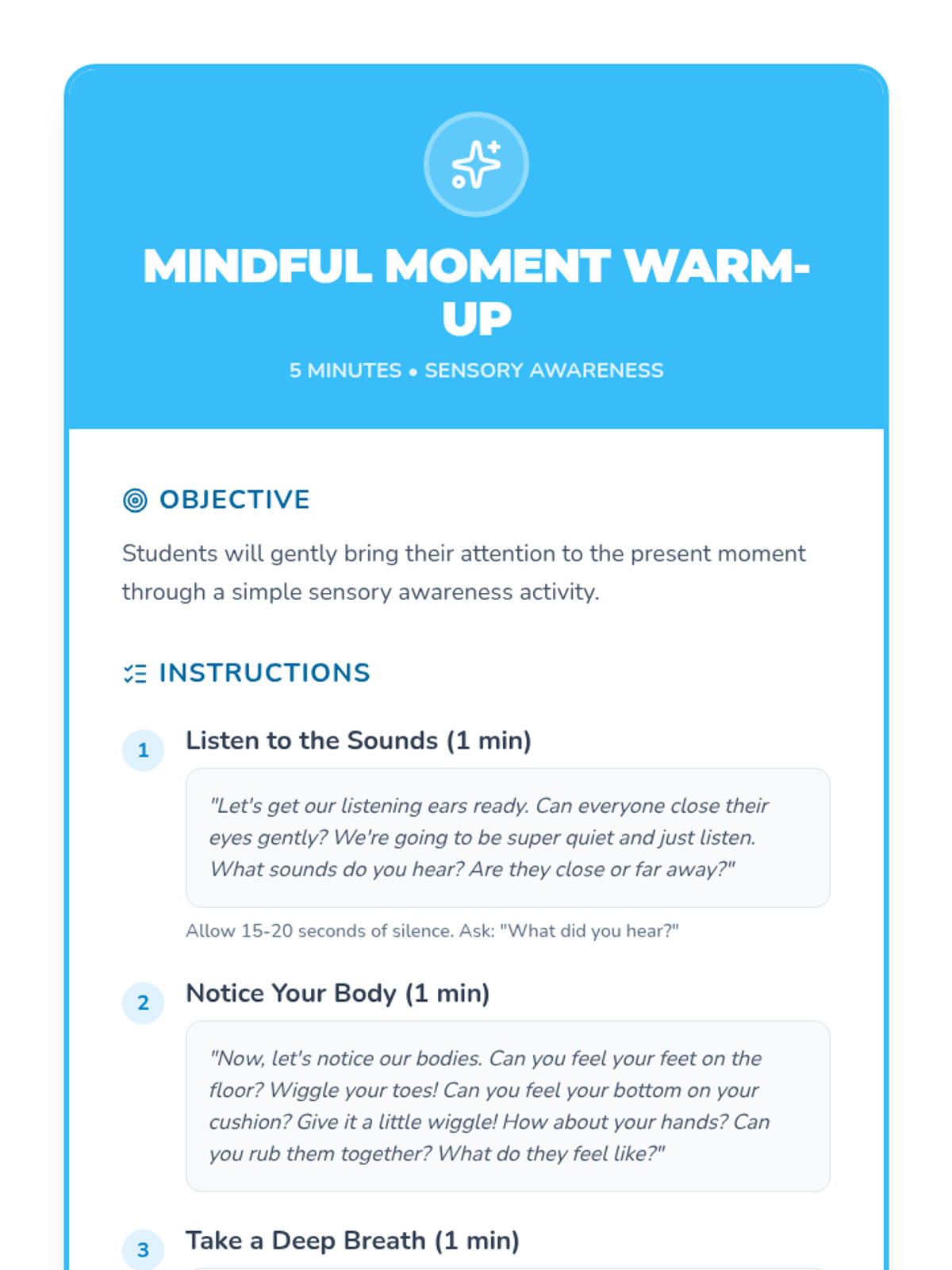 A 5-lesson sequence for Pre-K students to develop present-moment awareness through sensory exploration, auditory focus, tactile grounding, and breath work. Students learn to use their senses as tools for emotional regulation and staying anchored in the 'right now'.