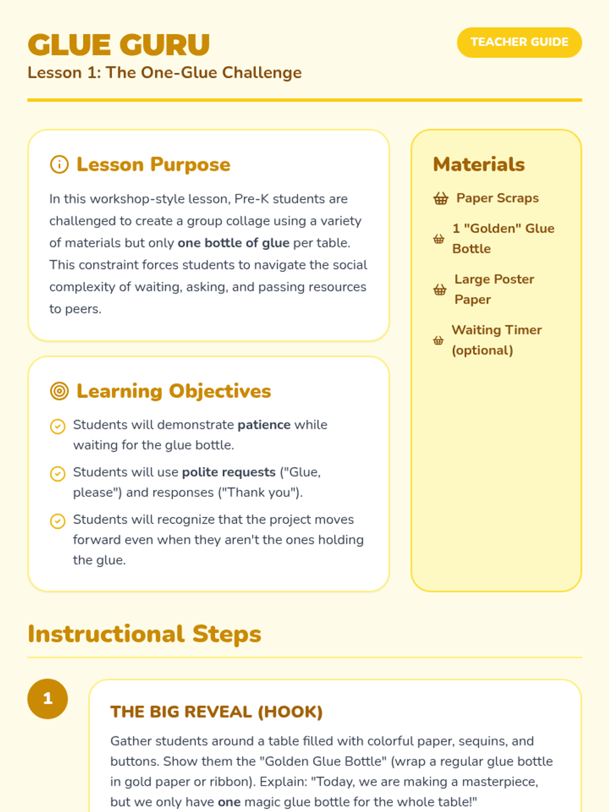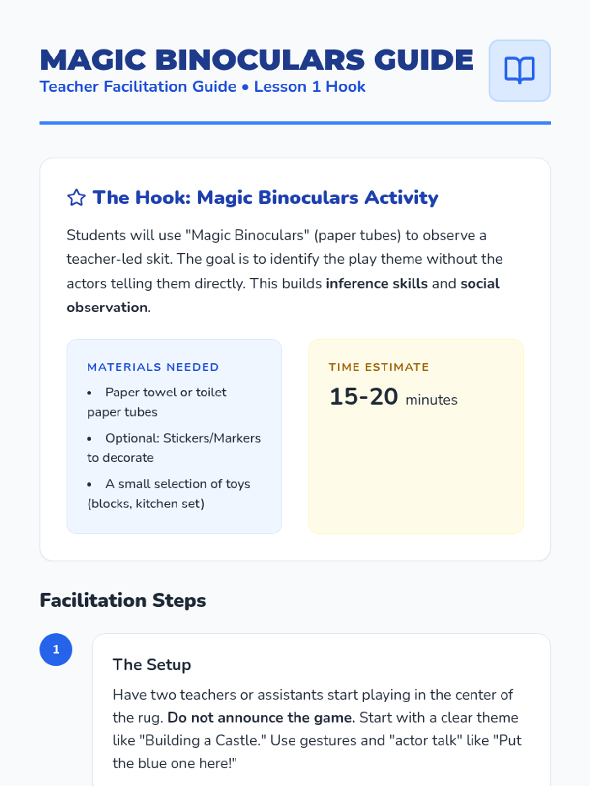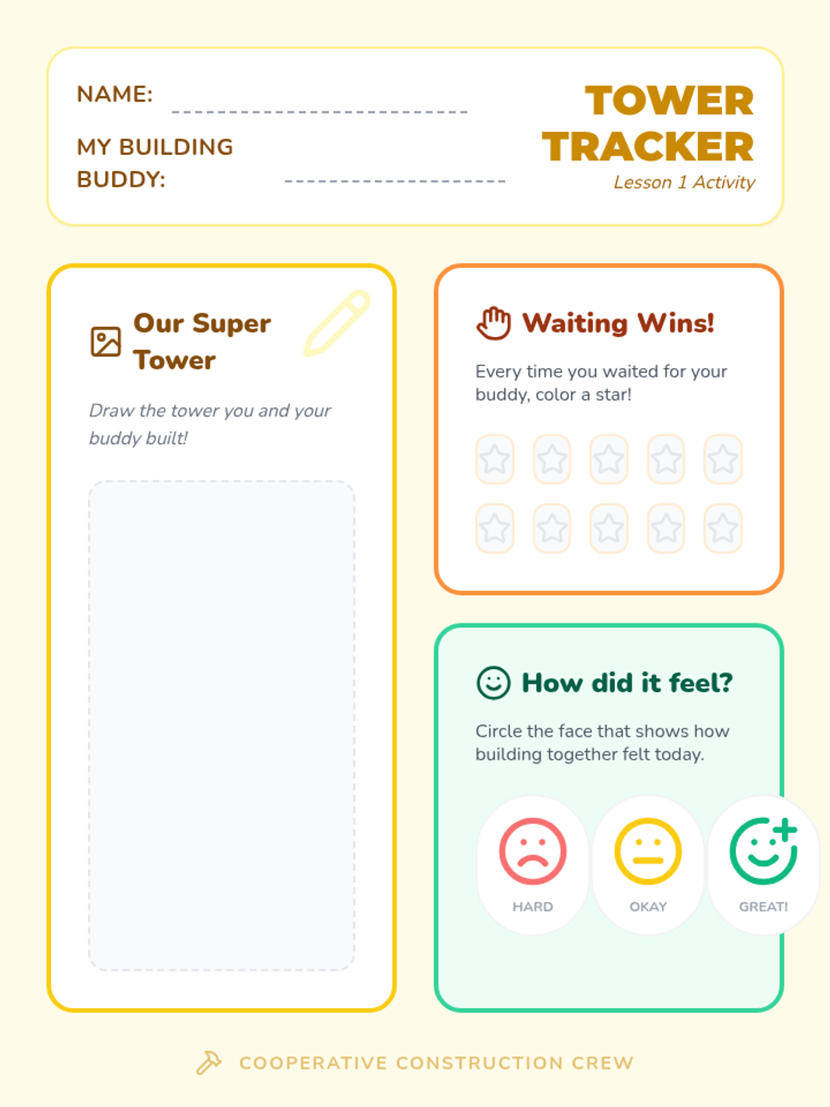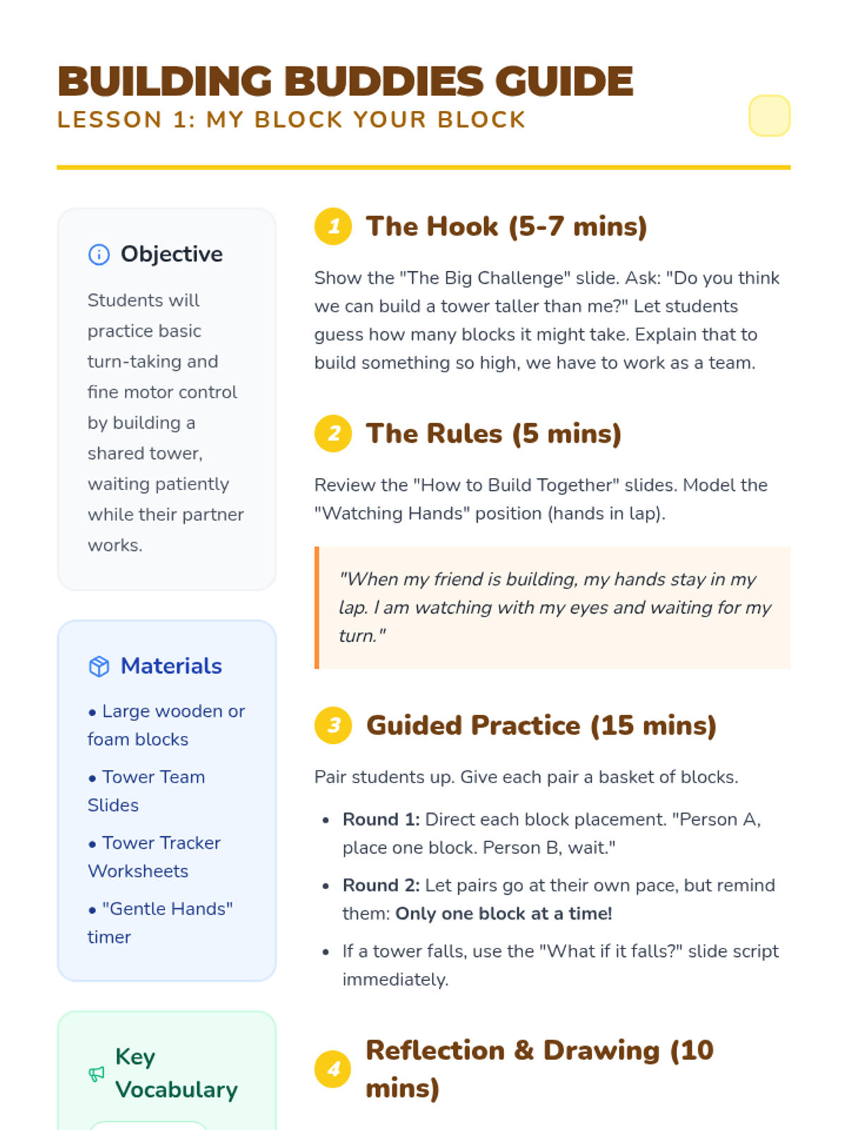 A sequence designed for Pre-K students to master the art of turn-taking and sharing through collaborative building and role-play projects. Students progress from simple turn-taking to joint planning and conflict resolution.