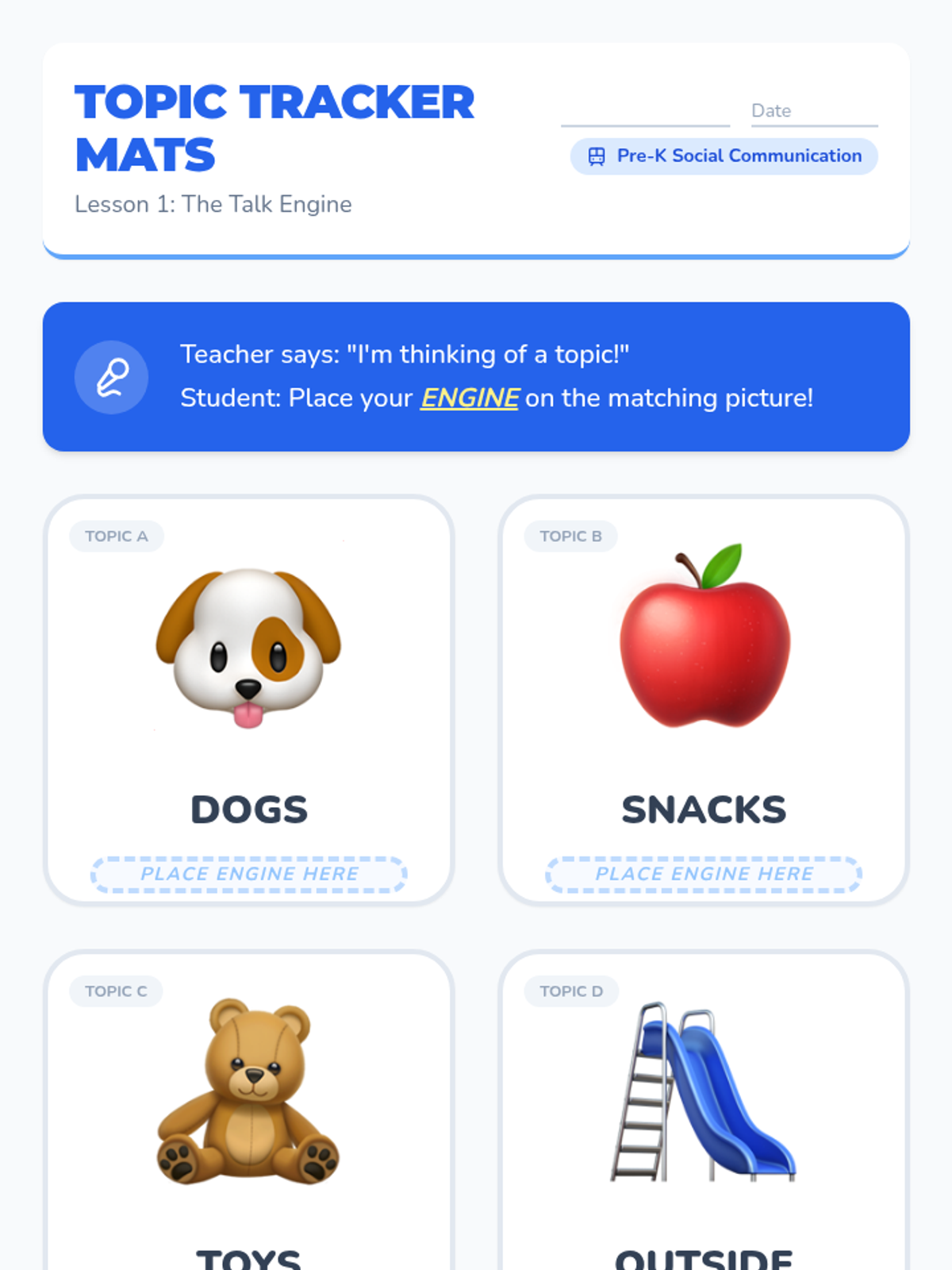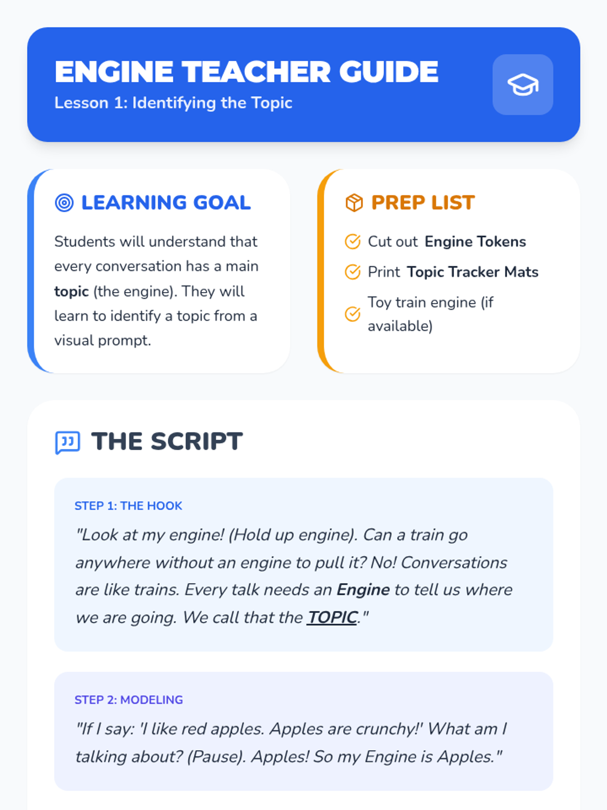 This sequence uses a train metaphor to teach Pre-K students how to maintain a conversation topic. Through concrete visual aids like engines, tracks, and parking lots, students learn to identify topics, add relevant comments, and manage off-topic thoughts.