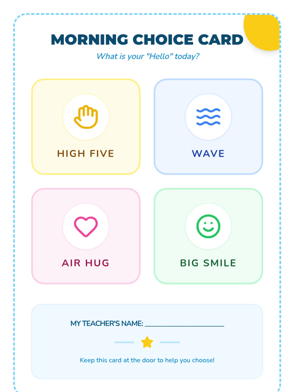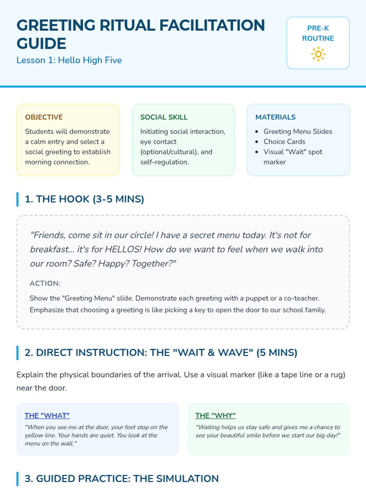 A comprehensive sequence designed to teach Pre-K students the autonomous arrival routine, focusing on greeting rituals, managing personal belongings, and the daily check-in process. This sequence builds independence and reduces morning anxiety through clear, visual steps.