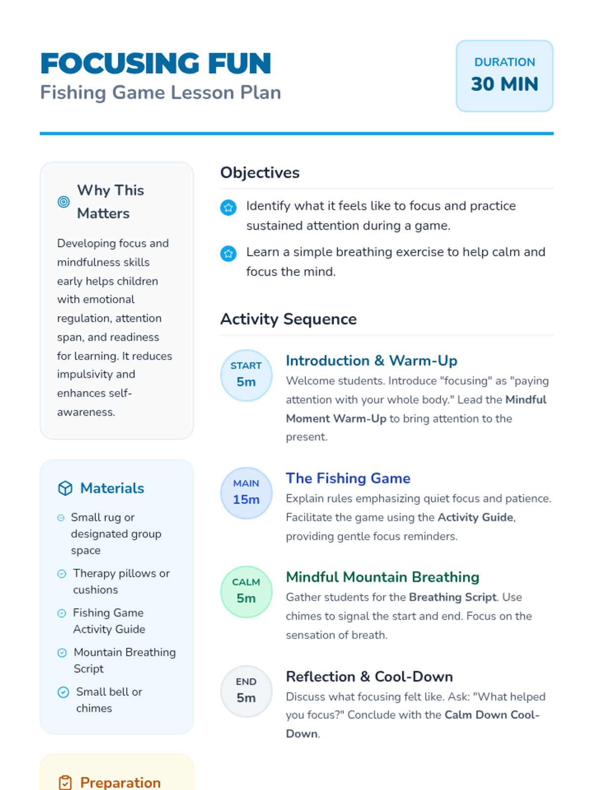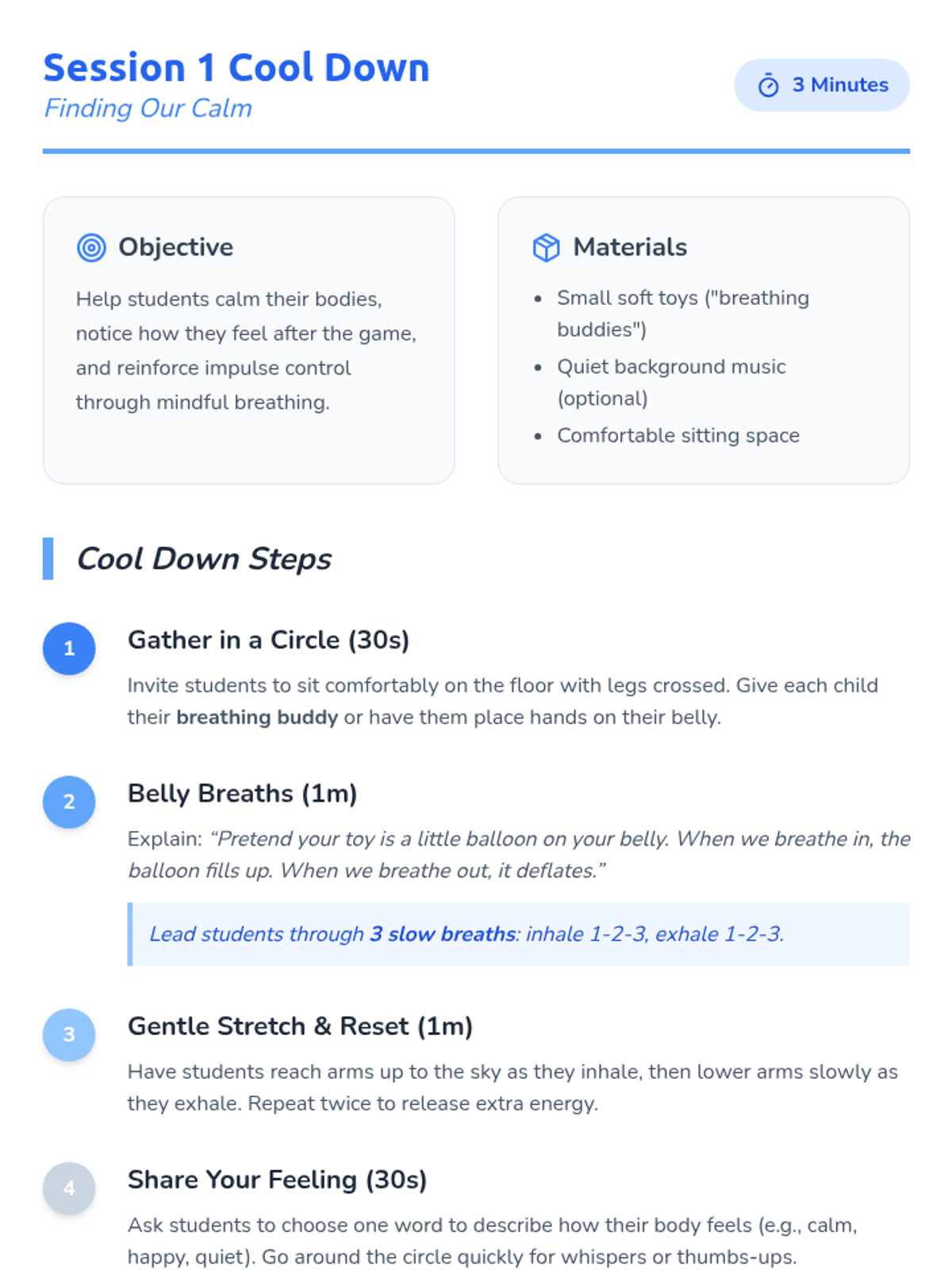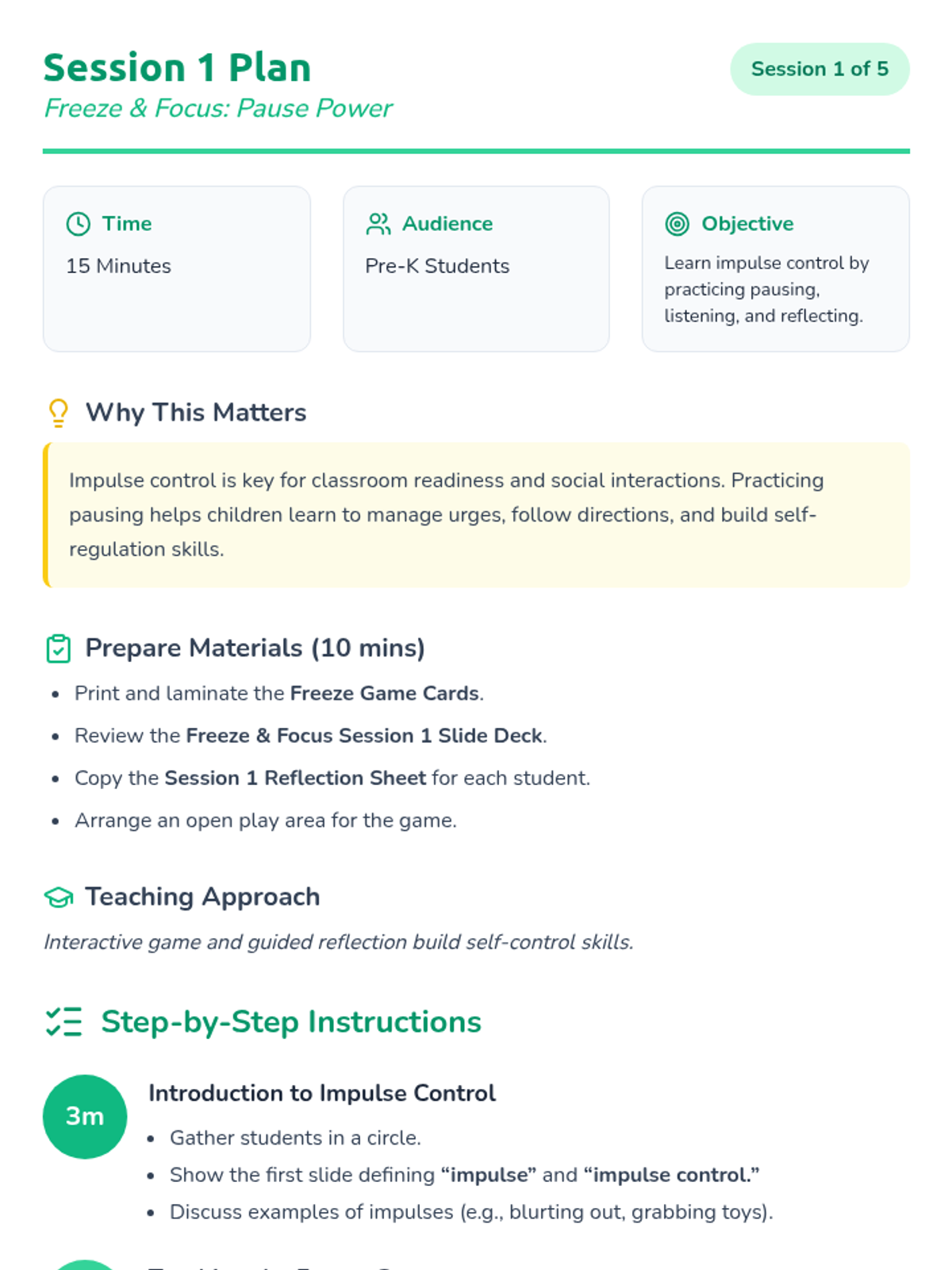 This 5-session pre-K series helps young learners develop impulse control by practicing pausing, listening, and making mindful choices. Each 15-minute session includes interactive games, visual cues, and reflections to build self-regulation skills.