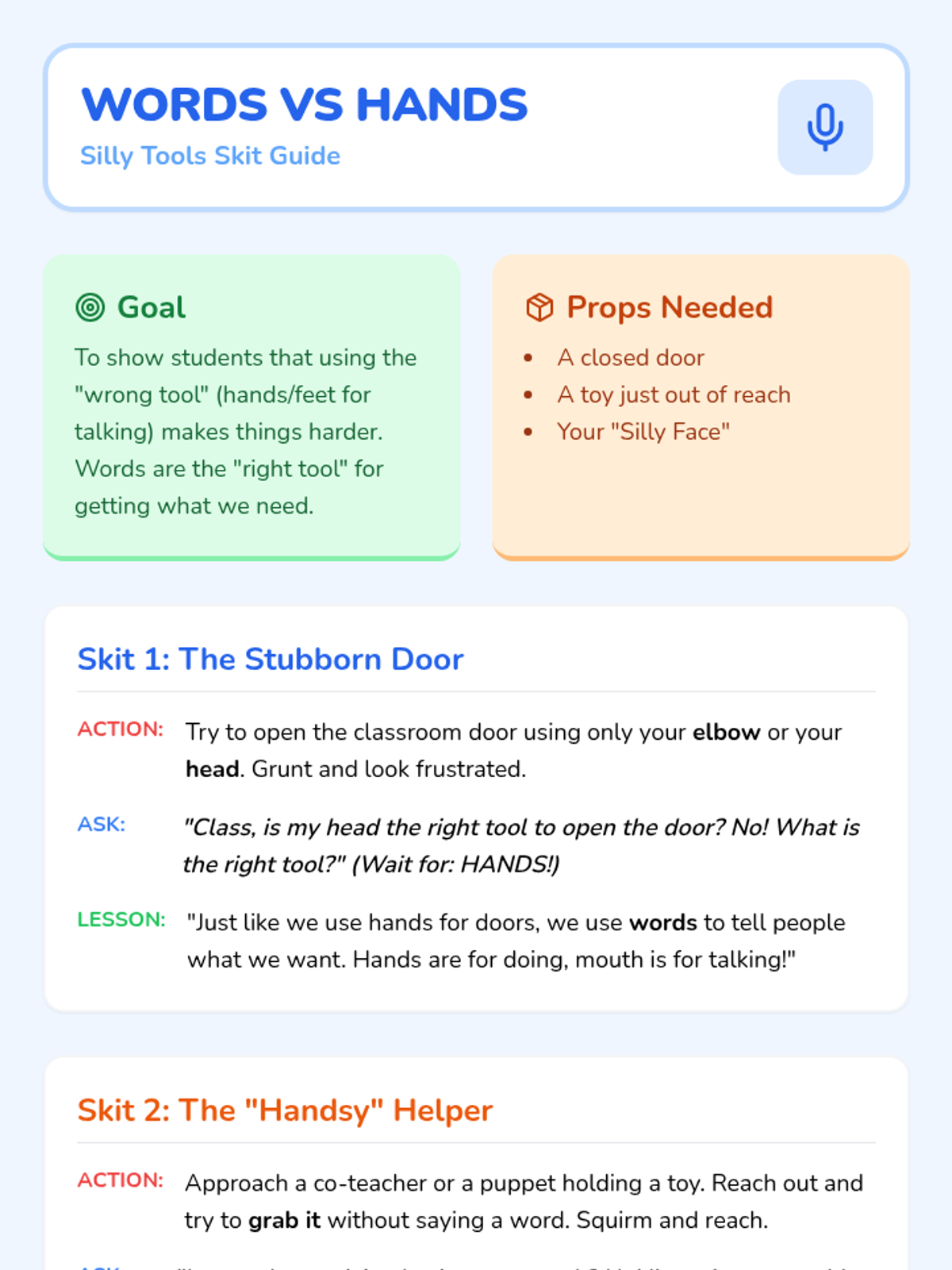 A Pre-K sequence focused on teaching children how to use verbal communication to replace physical outbursts, helping them express needs, set boundaries, and resolve conflicts using positive language.