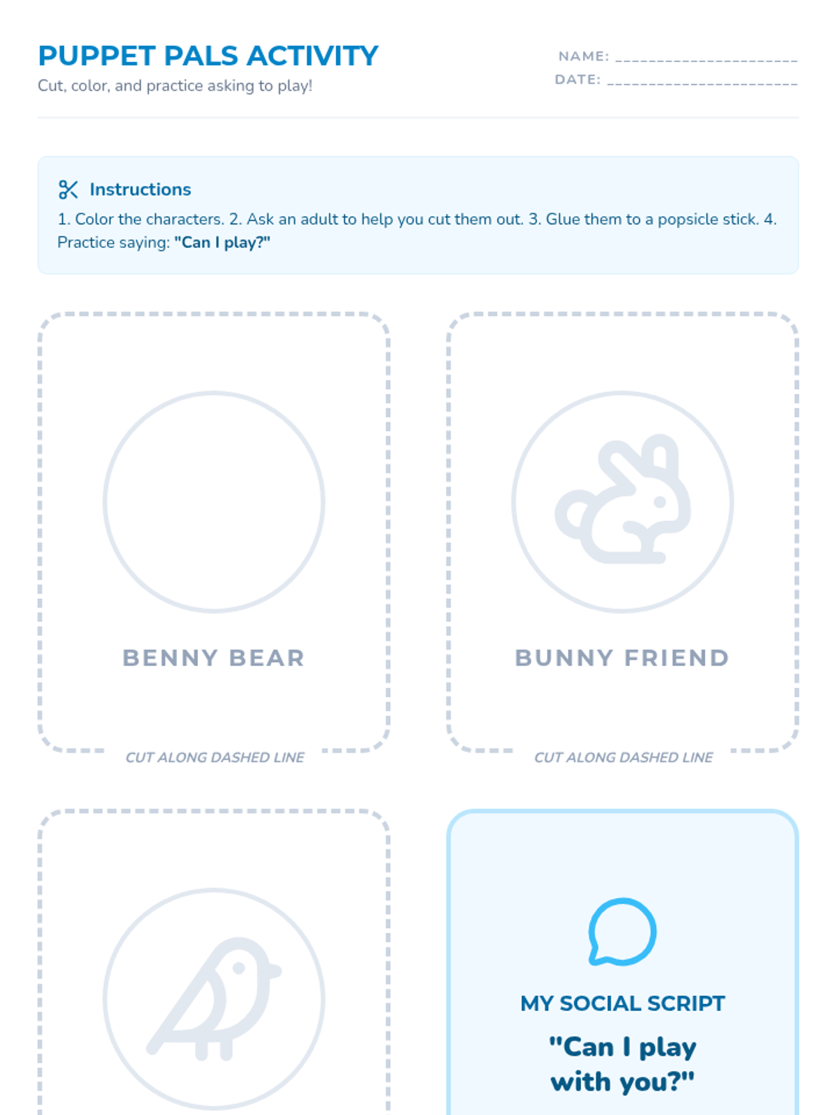 A Pre-K sequence focused on teaching social scripts through puppets and role-play to help students navigate sharing, waiting, and responding to 'no' during play.