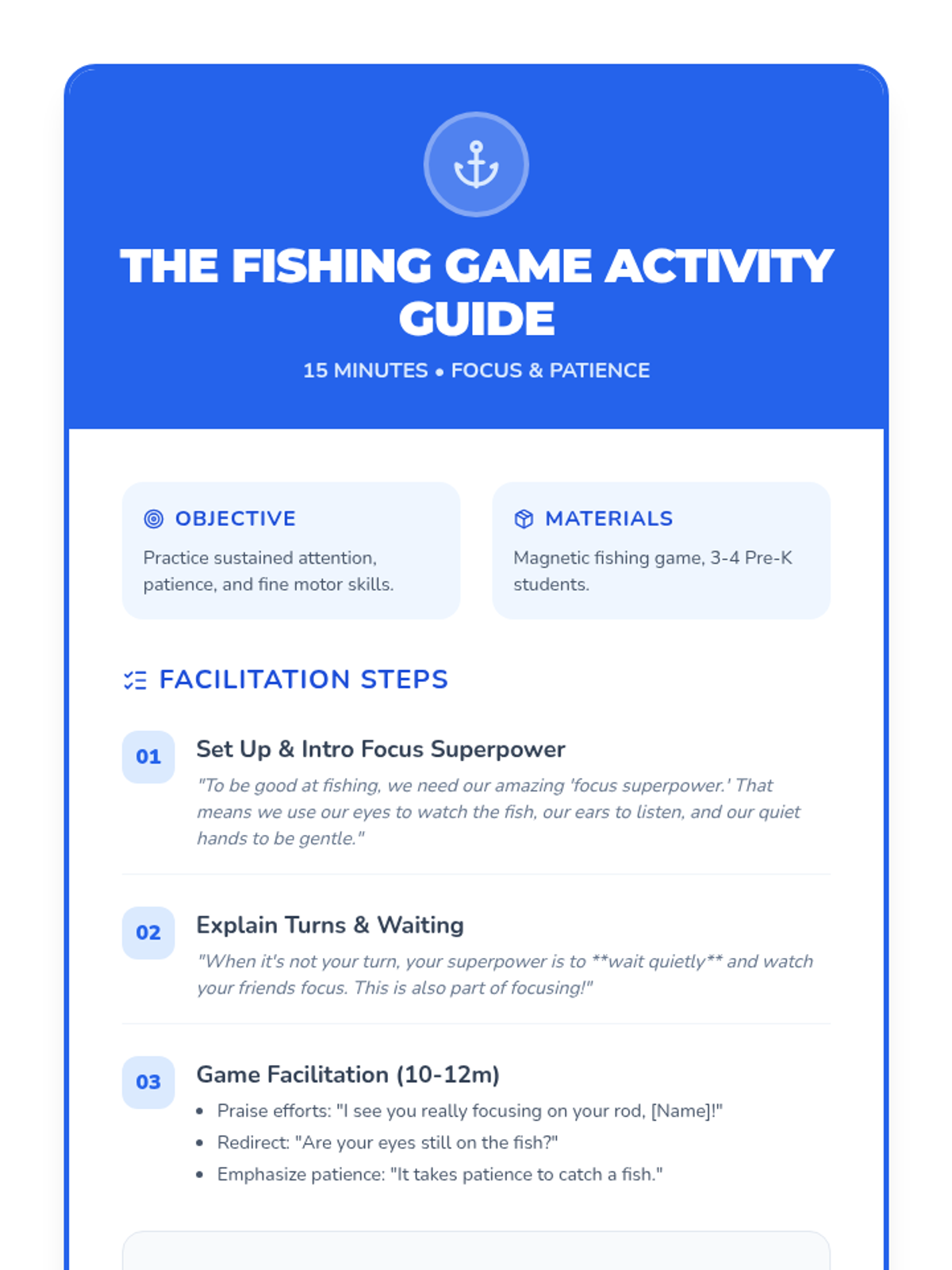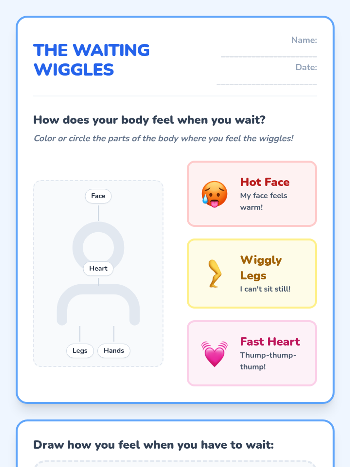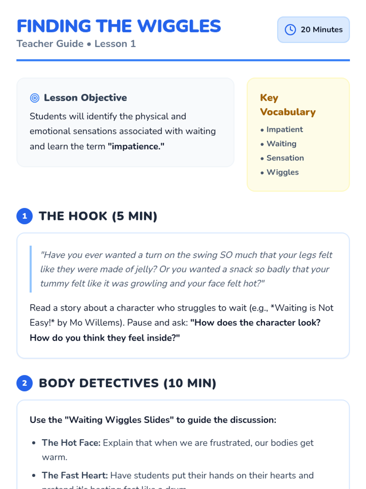 A Pre-K sequence focused on emotional regulation and waiting skills, helping children identify the physical feelings of impatience and build a 'waiting toolkit' of coping strategies.