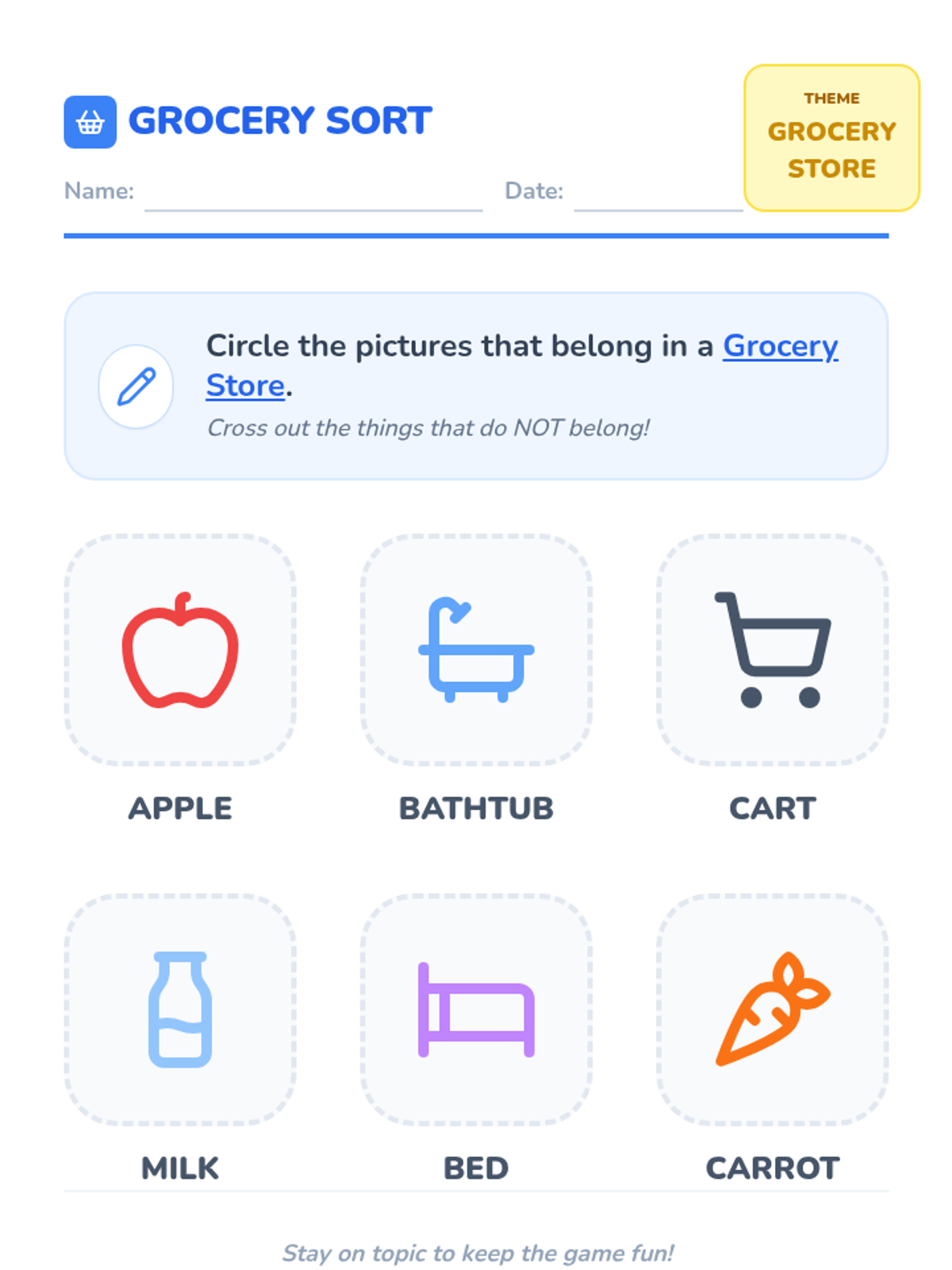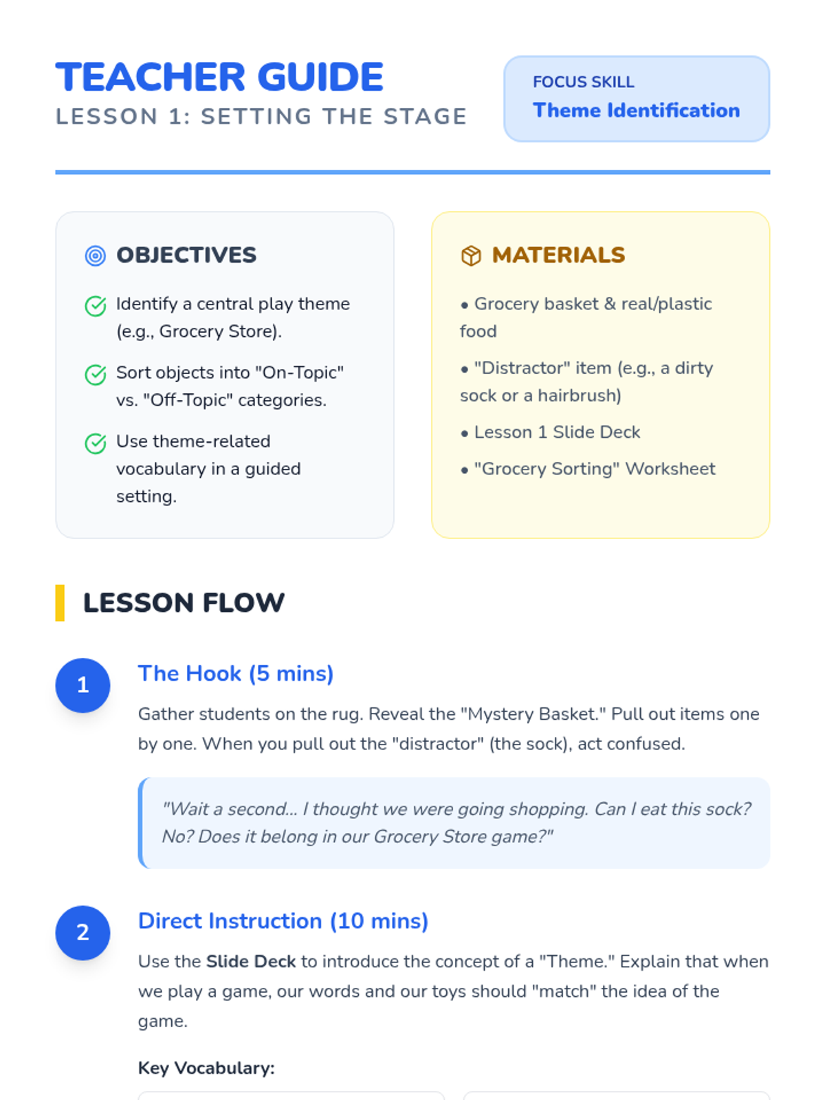A 5-lesson sequence for Pre-K students focusing on topic maintenance through the lens of dramatic play. Students learn to identify themes, stay in character, handle distractions, and transition between topics naturally.