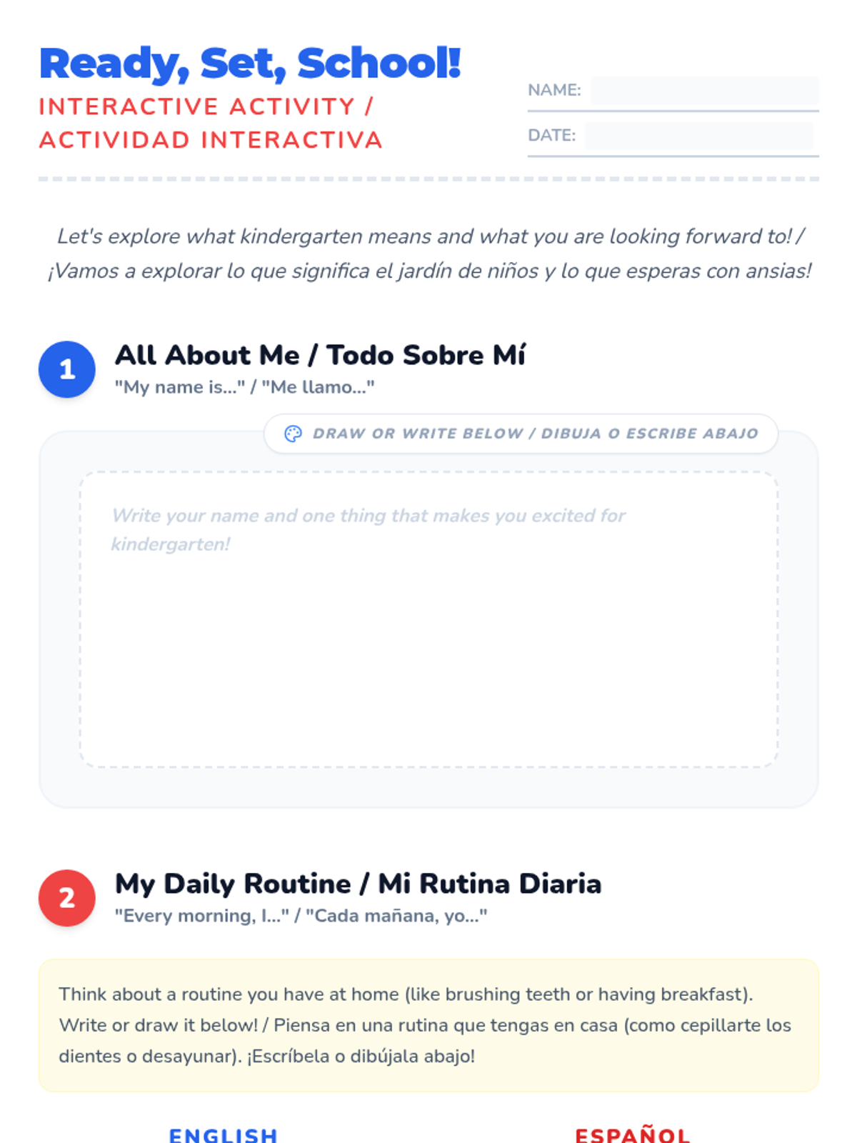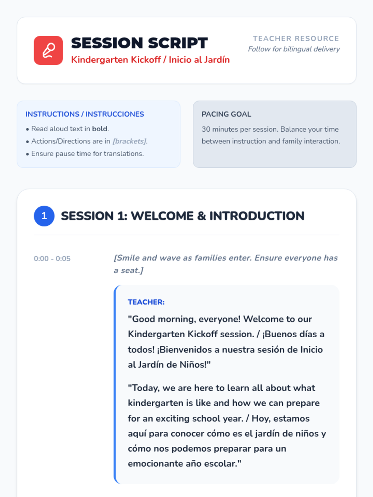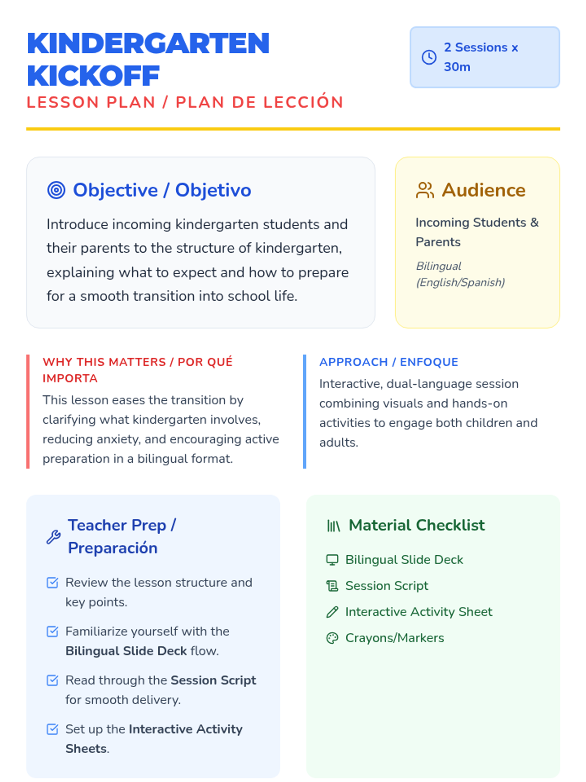 A comprehensive two-session program designed to help incoming kindergarteners and their families transition smoothly into school life through bilingual instruction and interactive activities.