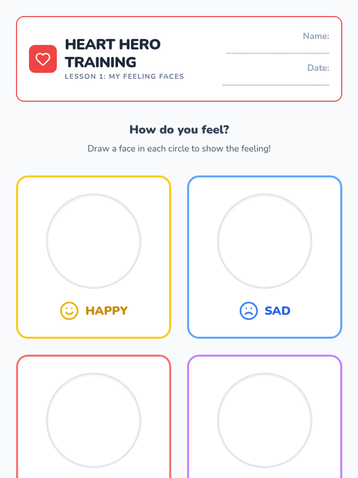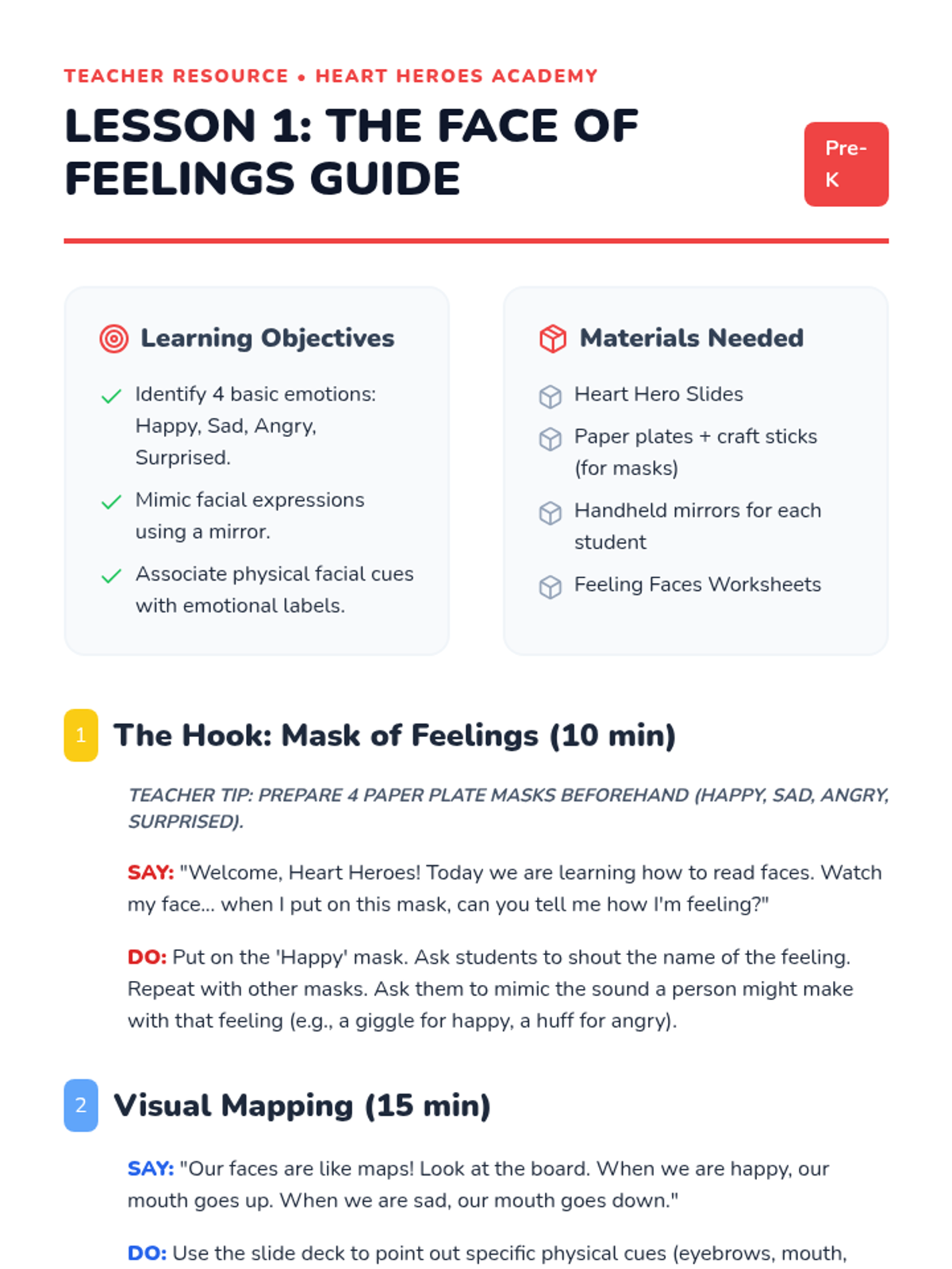 A 5-lesson unit for Pre-K students focused on emotional literacy, self-esteem, and regulation. Students move from identifying basic emotions to recognizing personal strengths and practicing calming strategies through a 'Heart Heroes' superhero theme.