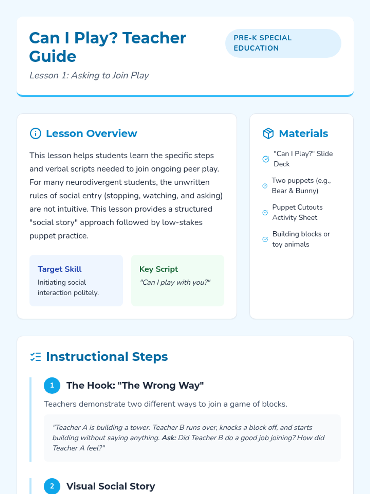 A Pre-K social communication sequence focused on observing, joining, and maintaining cooperative play. Students learn to evaluate play themes, use effective entry requests, identify roles, handle rejection, and sustain group activities.