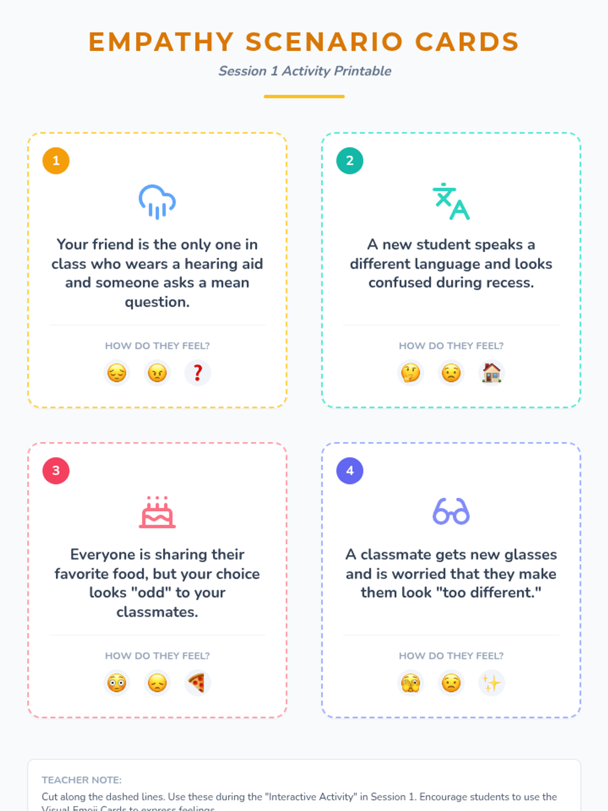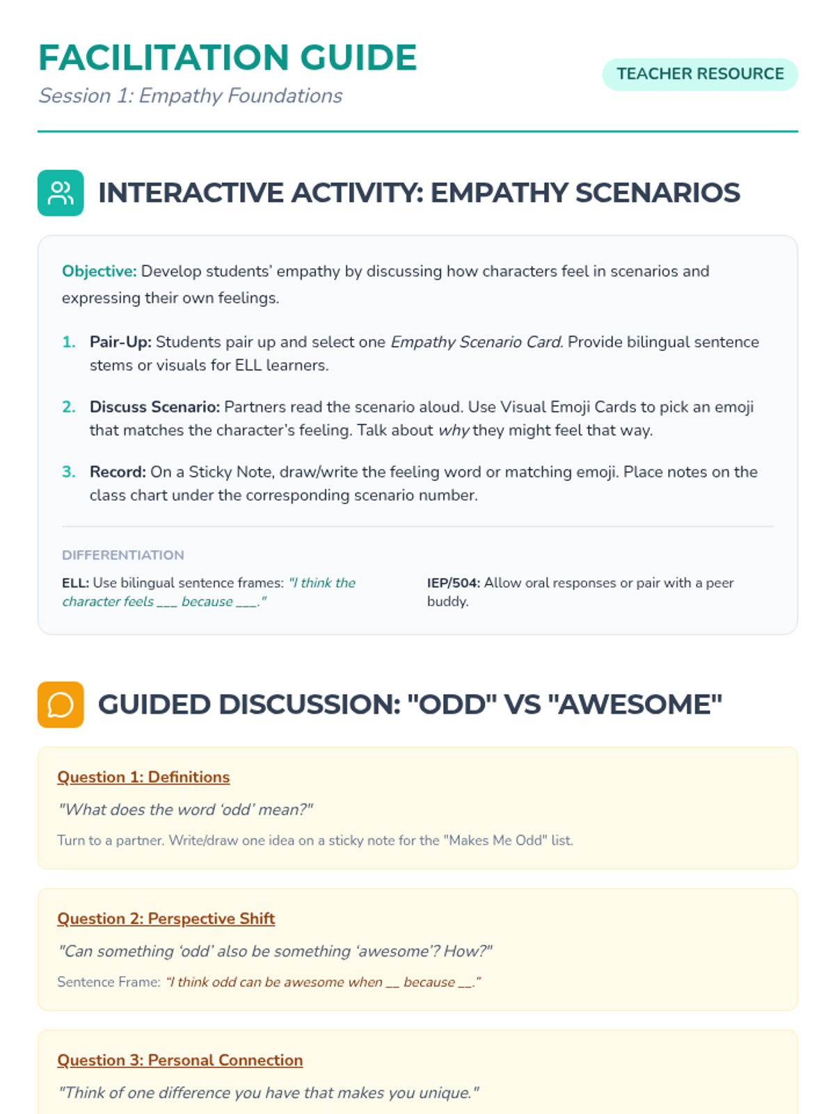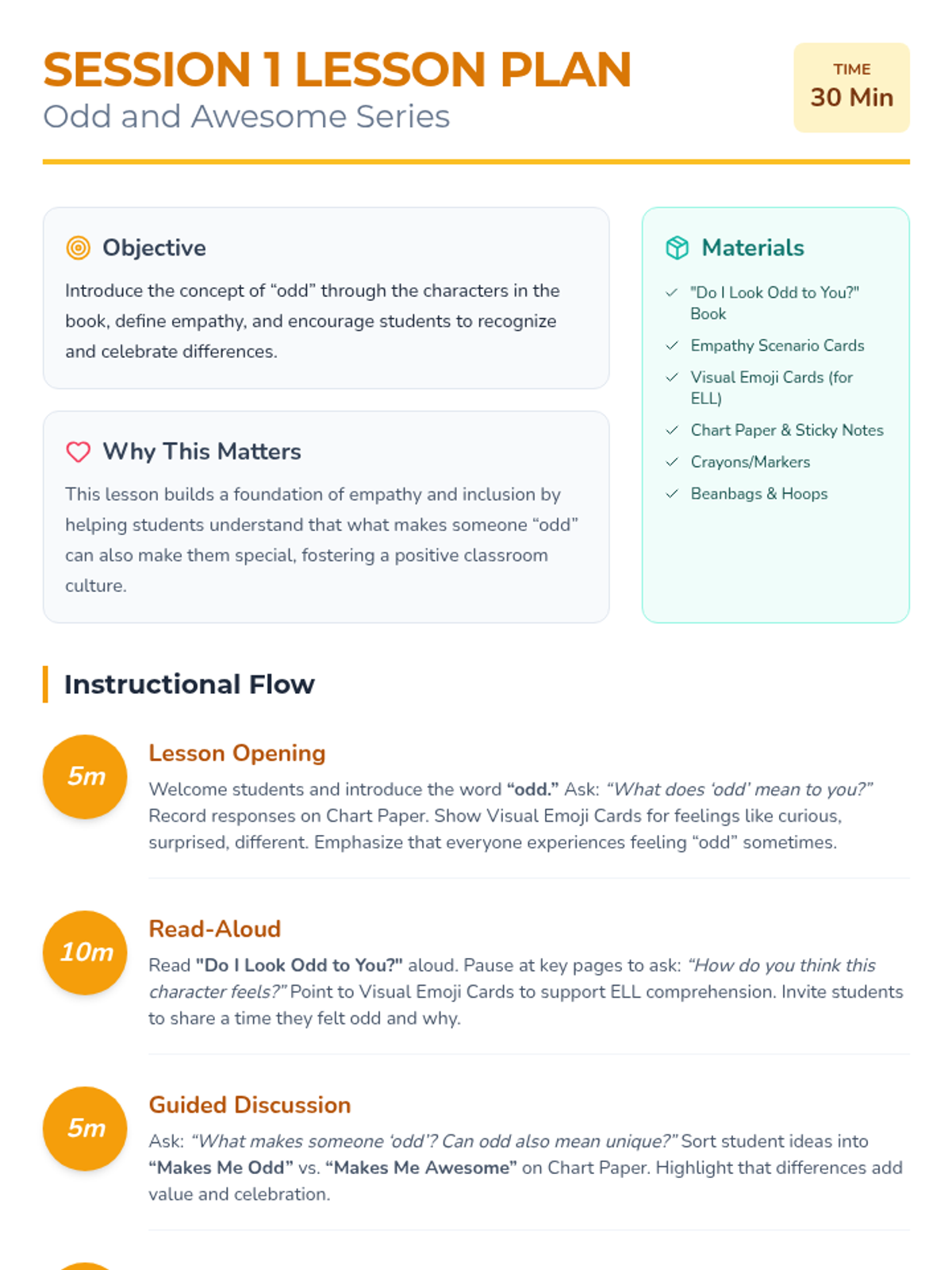 A 3-session empathy and inclusion series for PreK-5 students inspired by the book 'Do I Look Odd to You?'. Students explore what makes them unique, practice empathy through role-play, and celebrate differences through collaborative art and games.