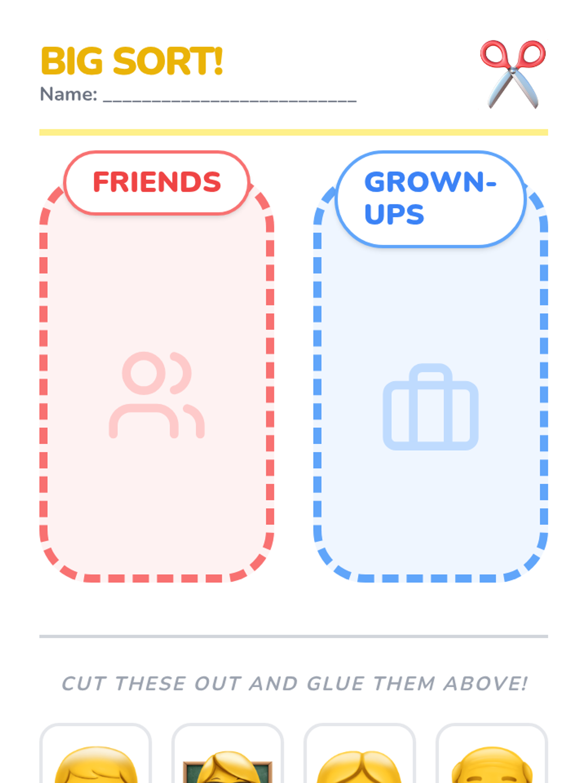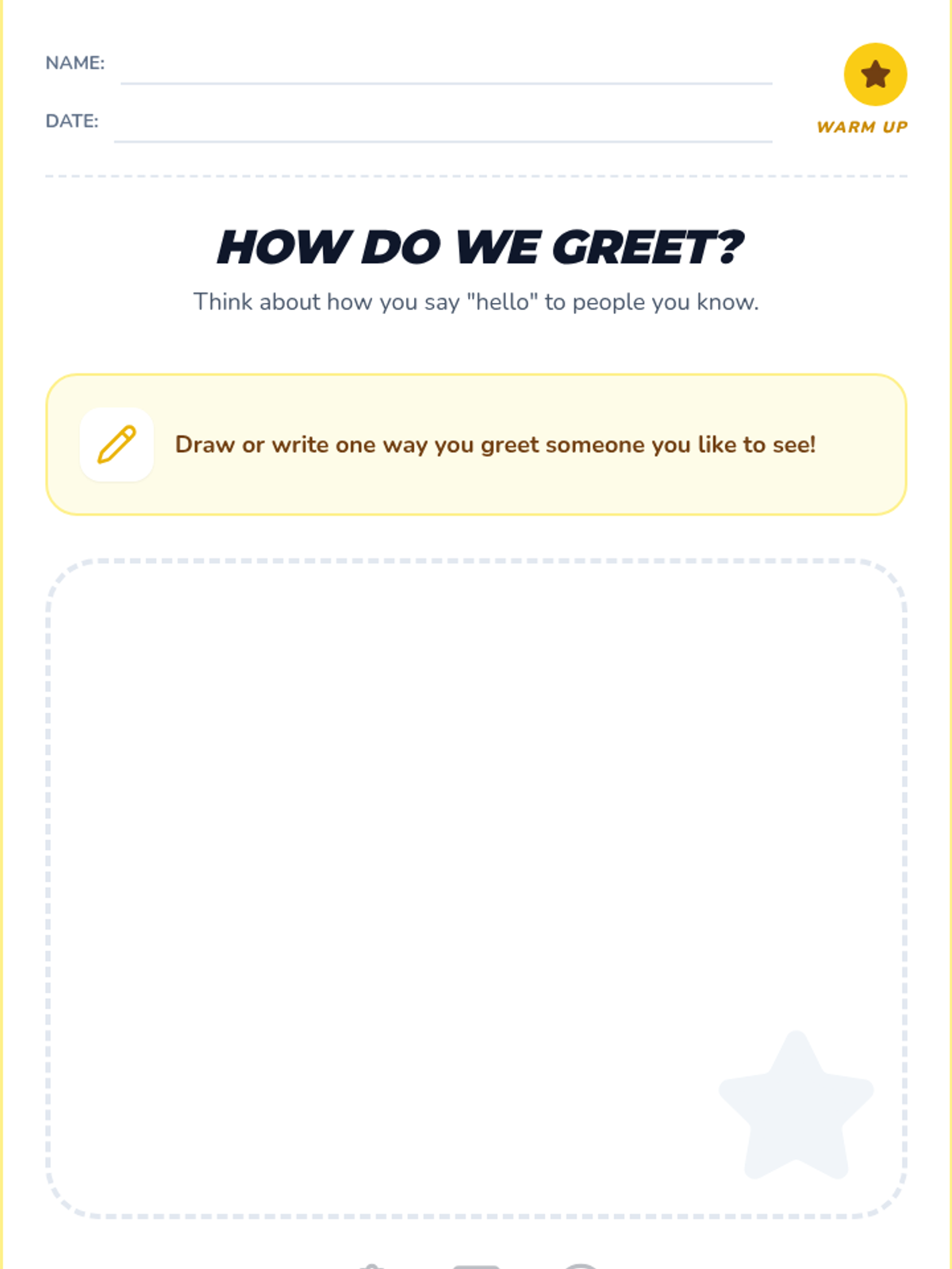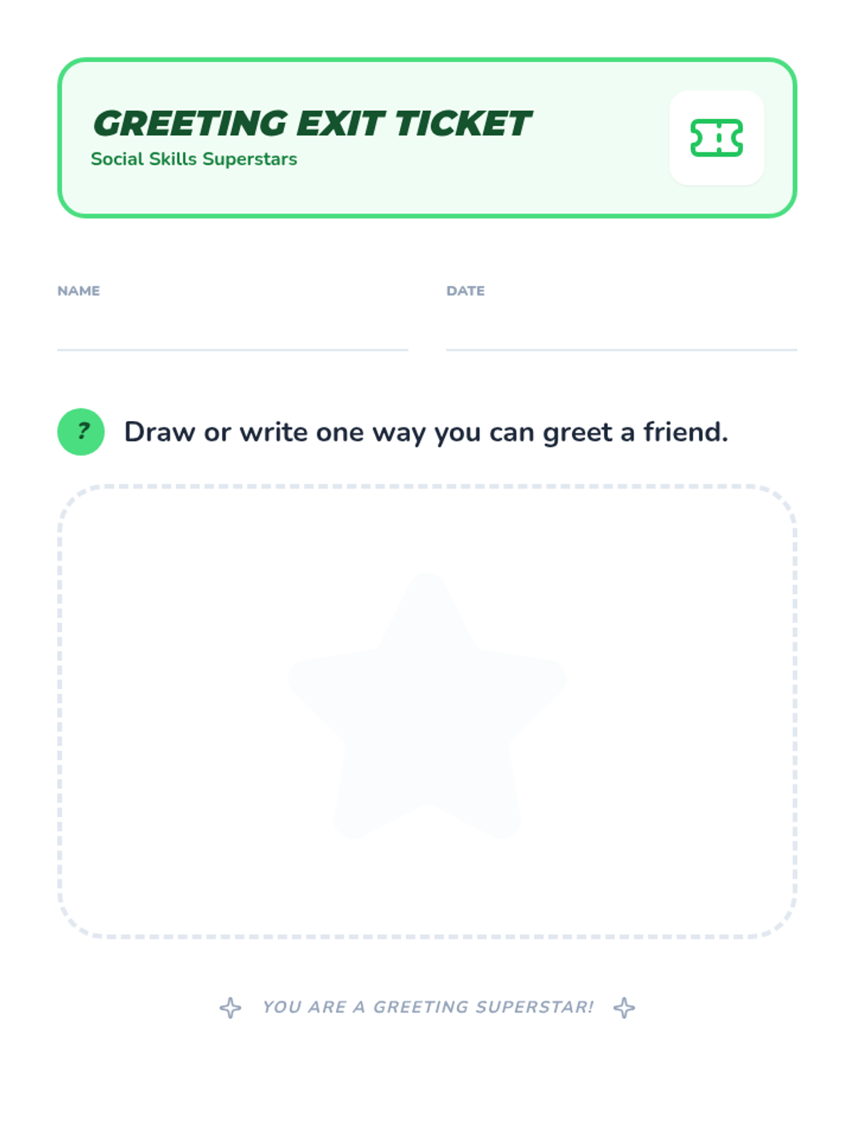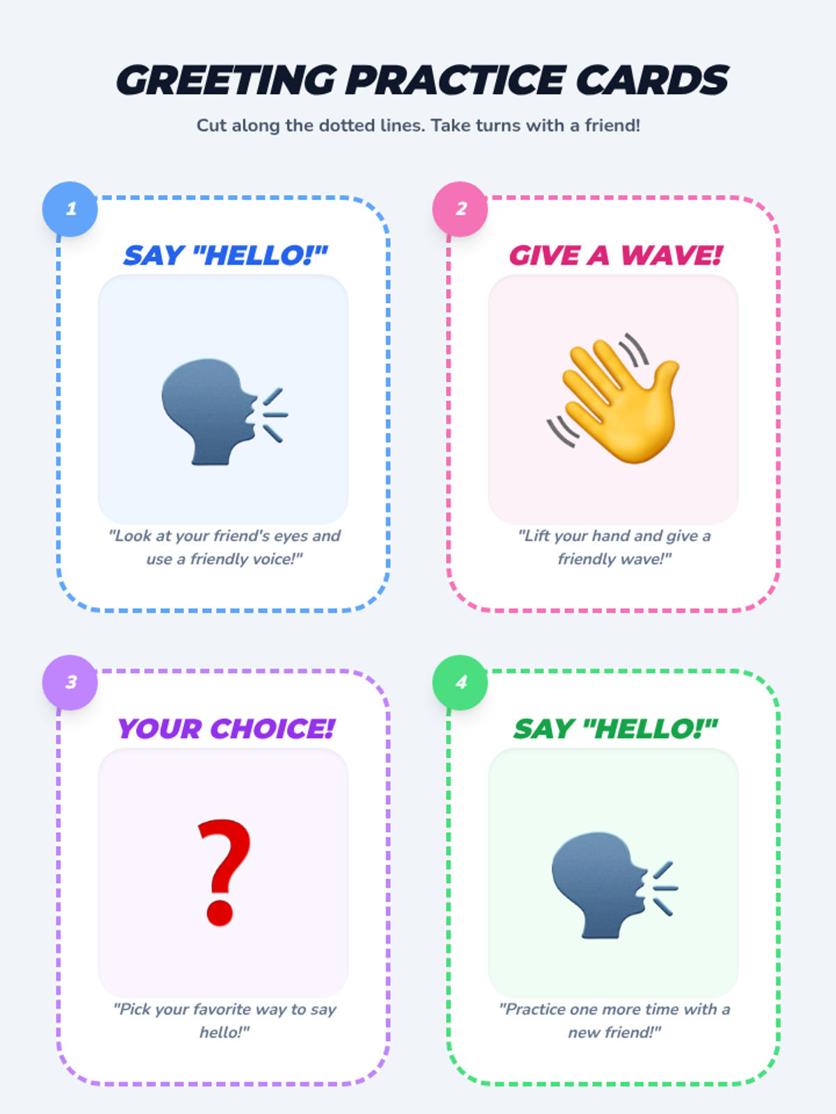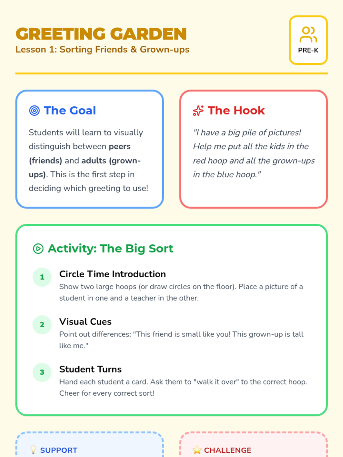 A game-based social communication sequence for Pre-K students to differentiate between greetings for peers (friends) and adults (teachers/parents). Through sorting, movement, and roleplay, students build the foundational skills needed for context-appropriate social interactions.