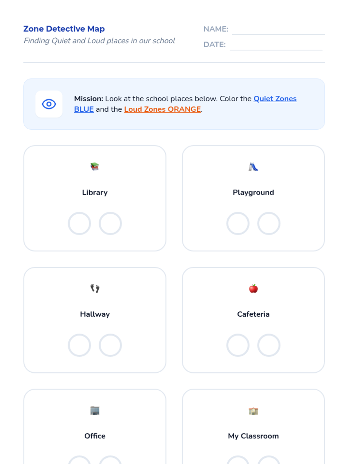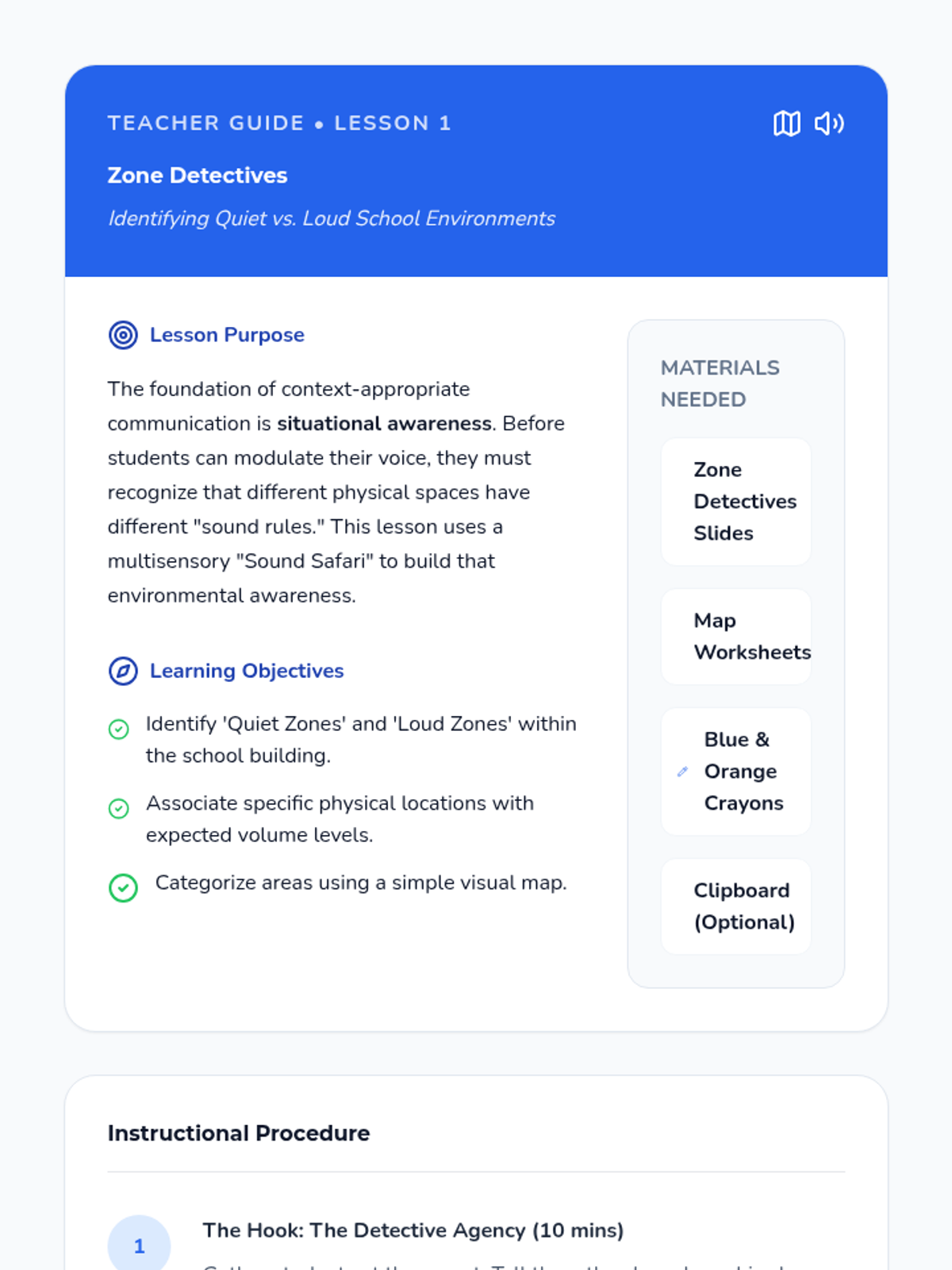 A 5-lesson sequence for Kindergarten students focusing on modulating greeting volume and style based on their physical location within a school. Students move from identifying 'Quiet' and 'Loud' zones to mastering silent greetings in hallways and energetic greetings on the playground.
