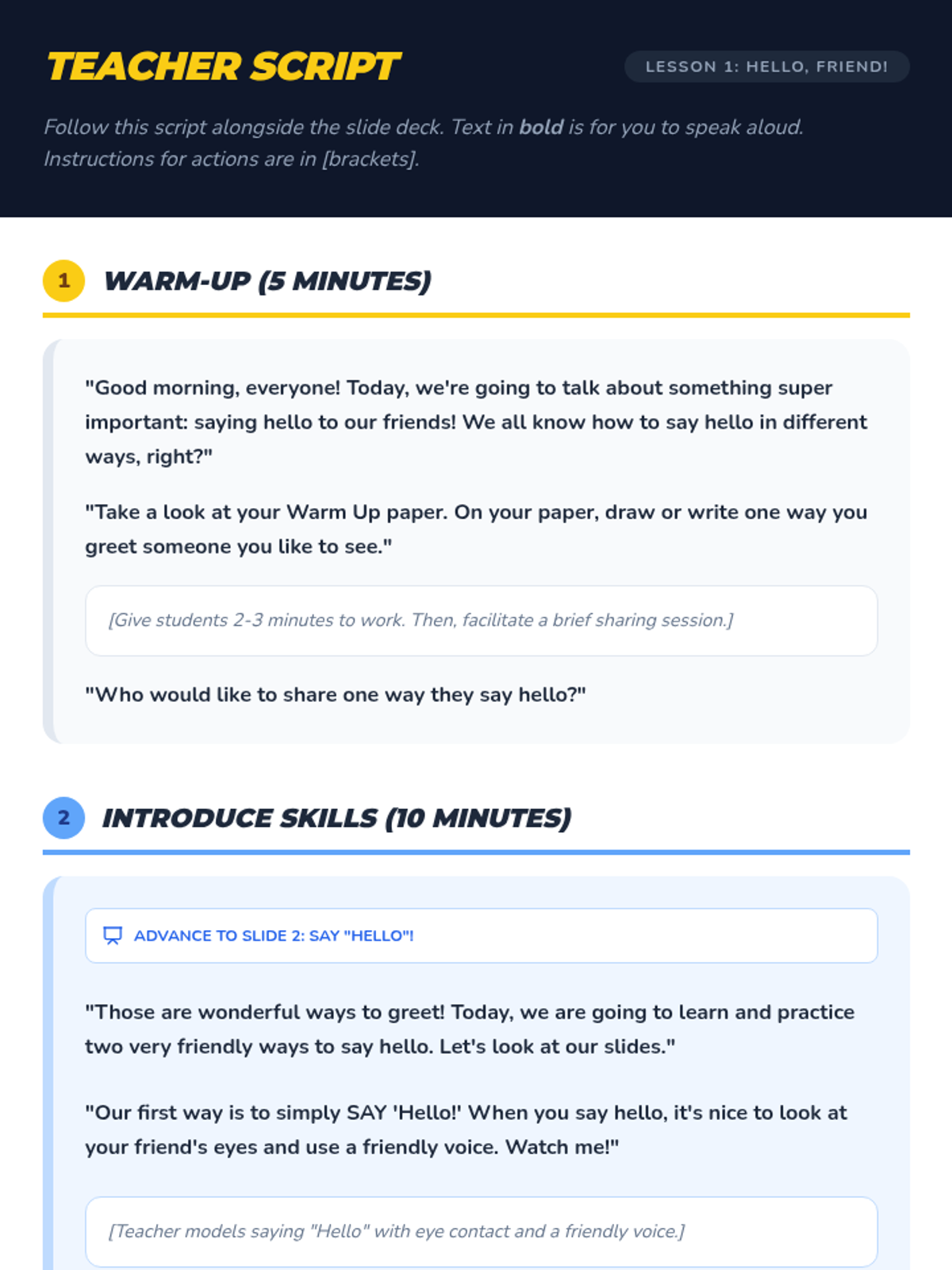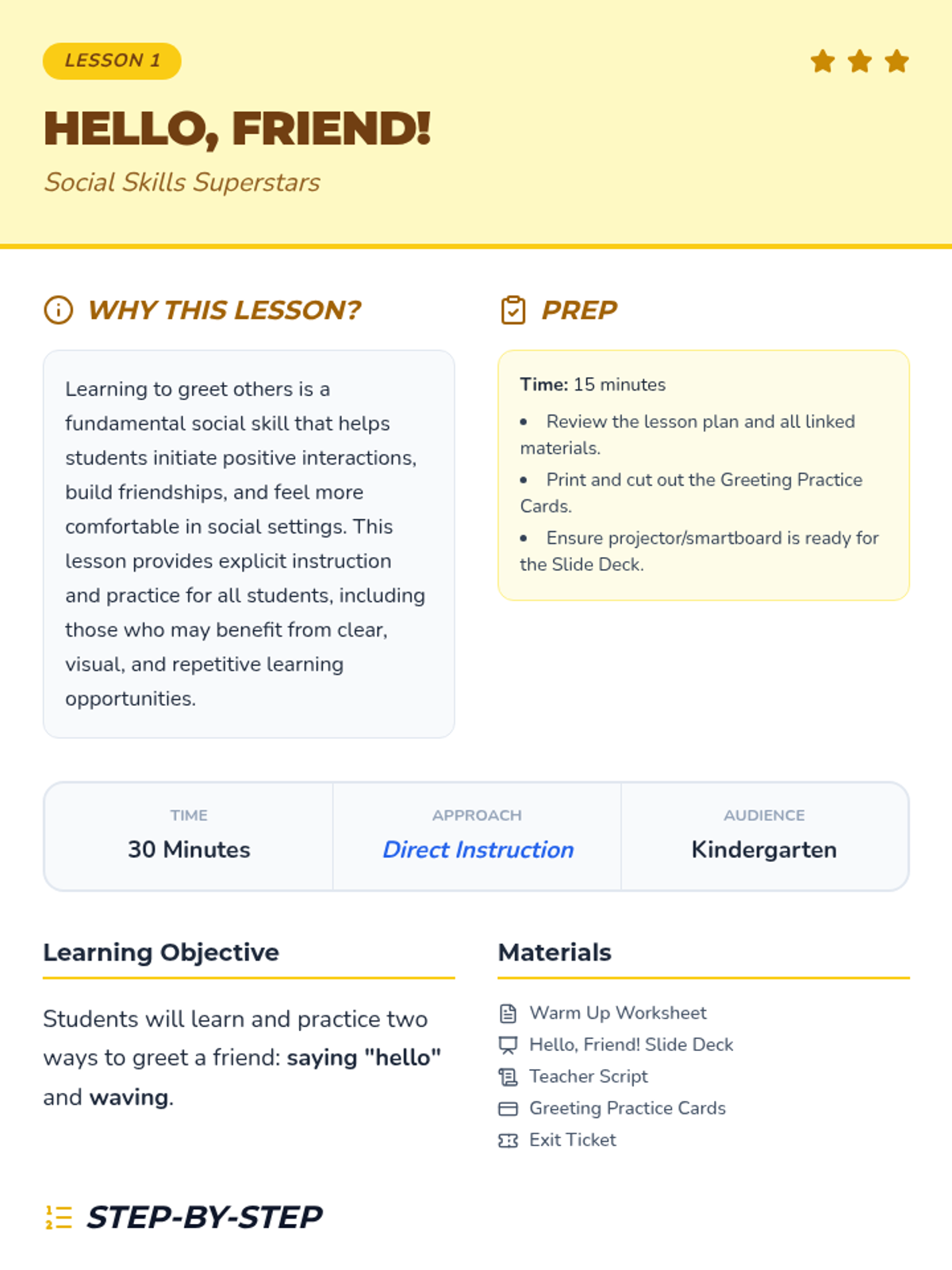 A sequence of four 30-minute lessons for Kindergarten students focused on foundational social skills: greeting, taking turns, sharing, and active listening. Designed to be inclusive of autistic learners with explicit instruction and visual supports.