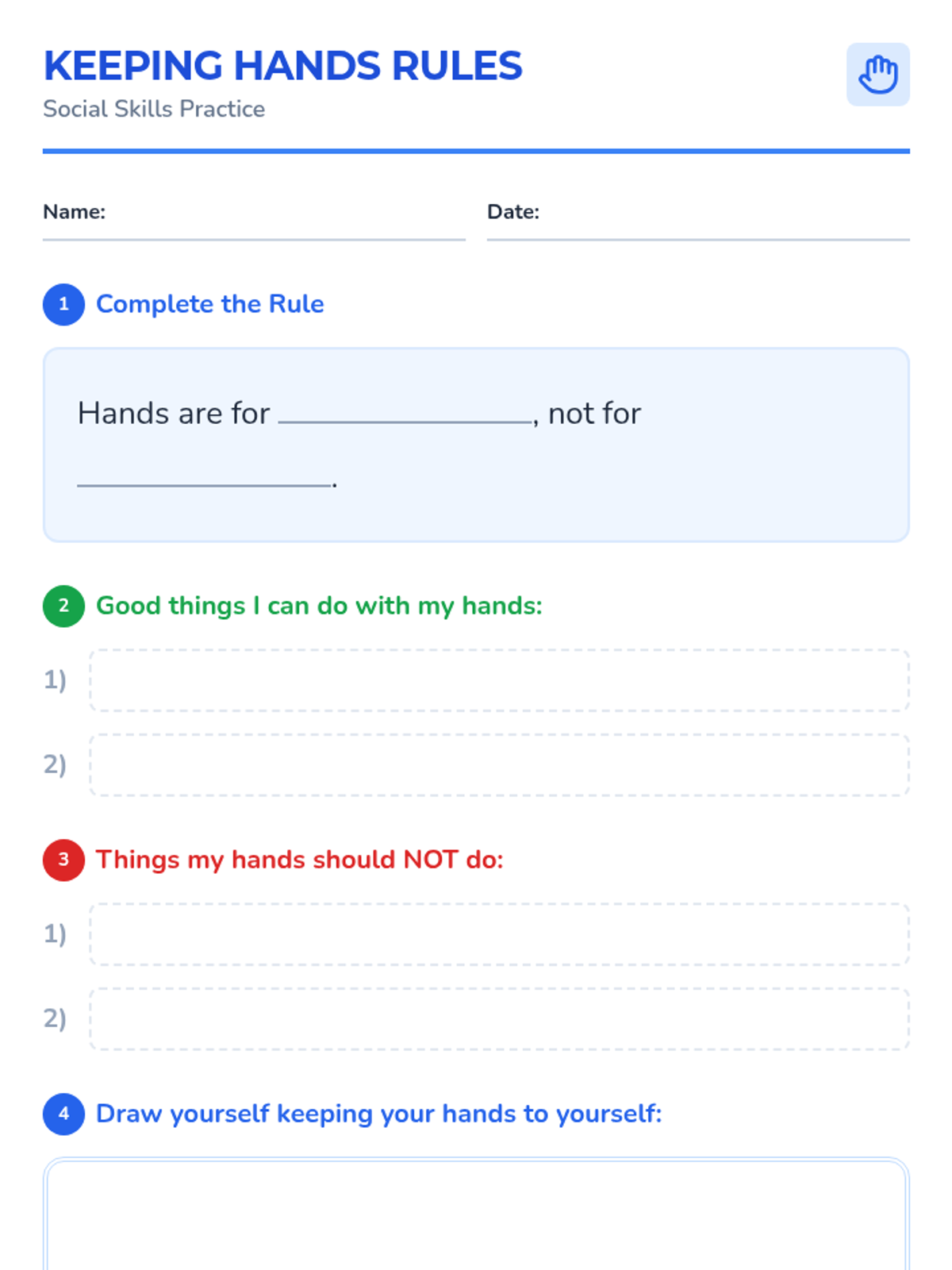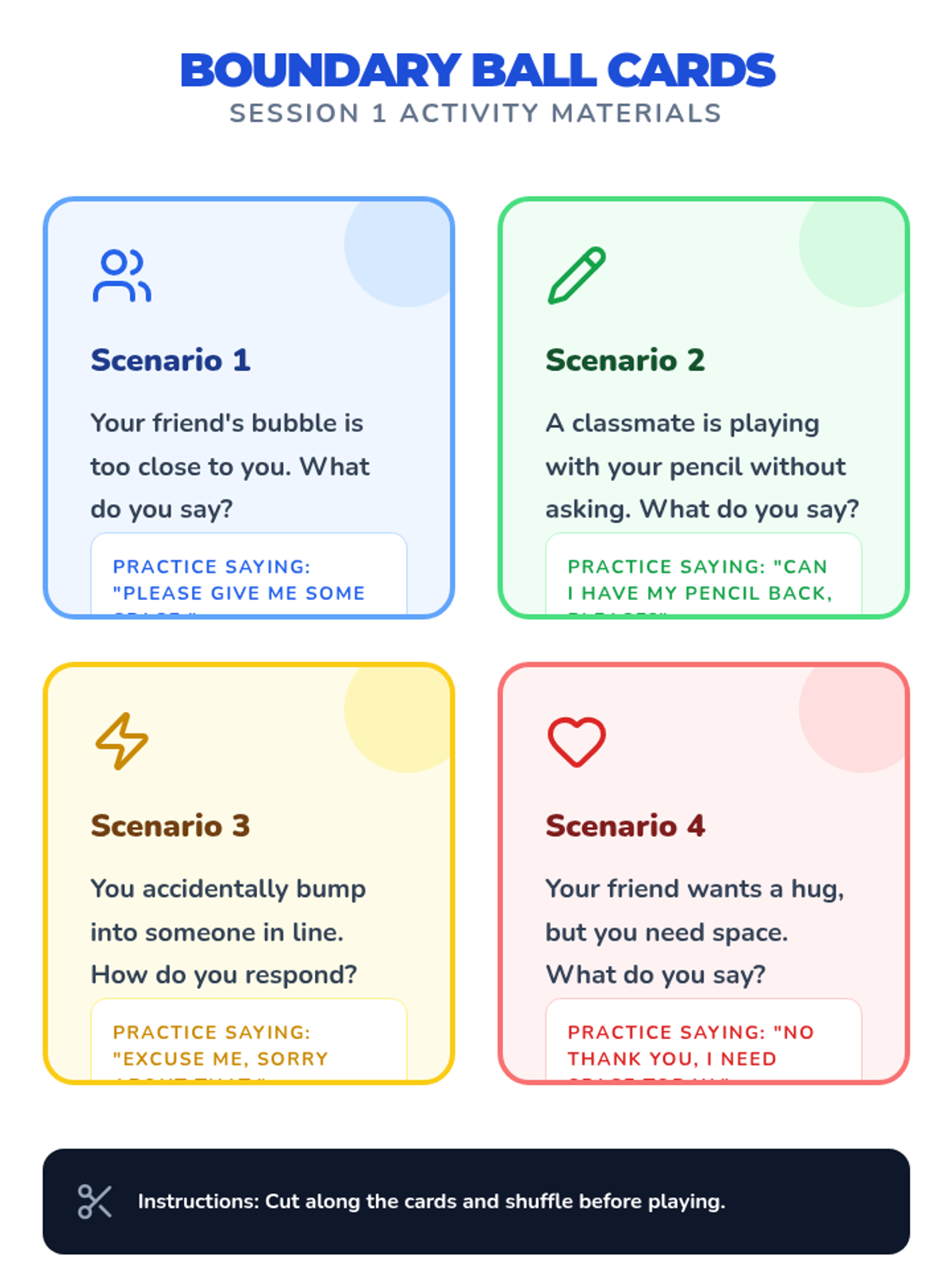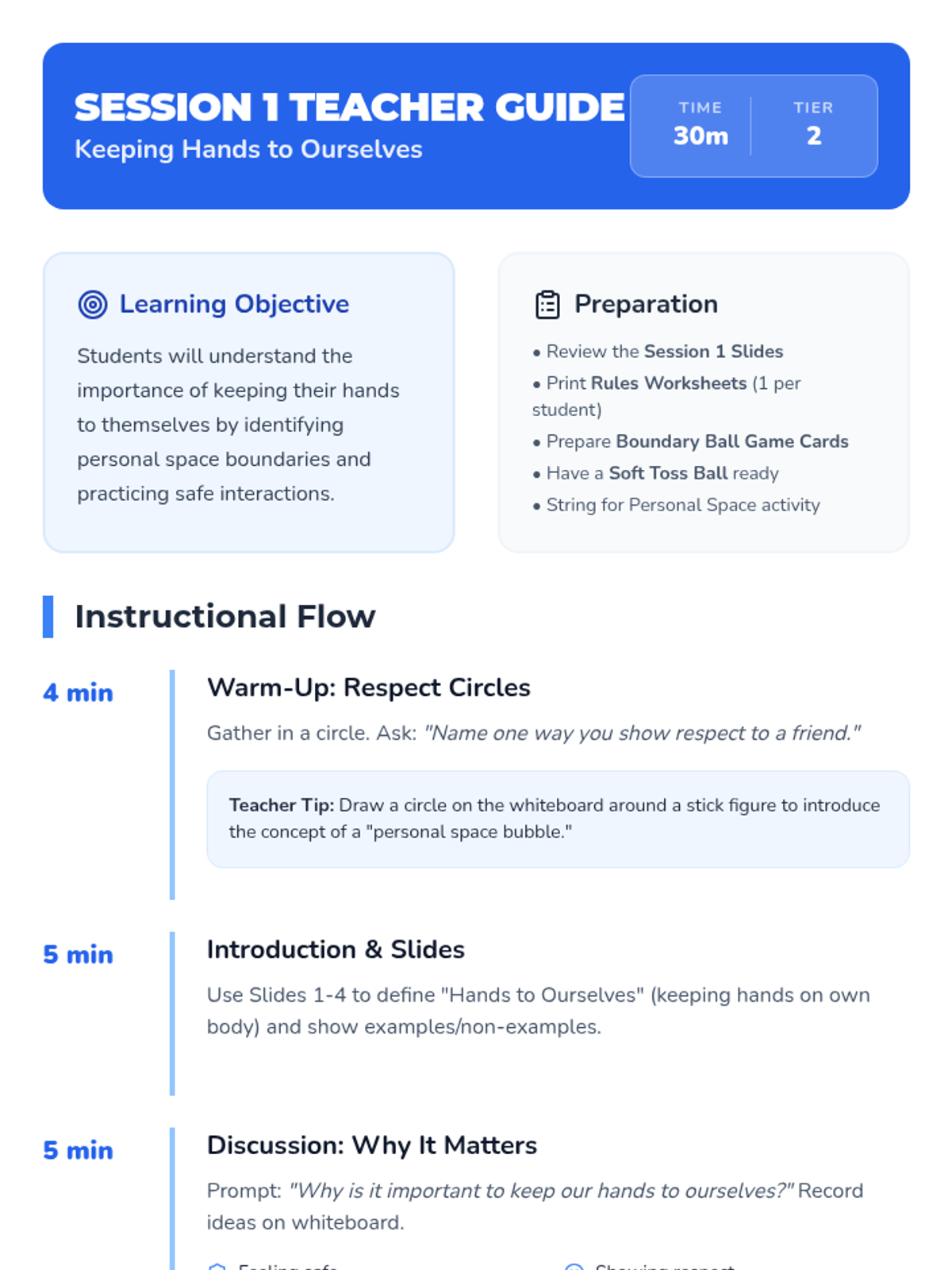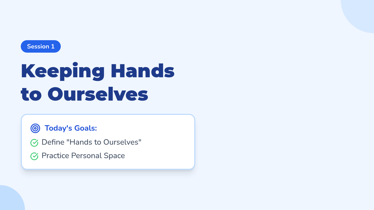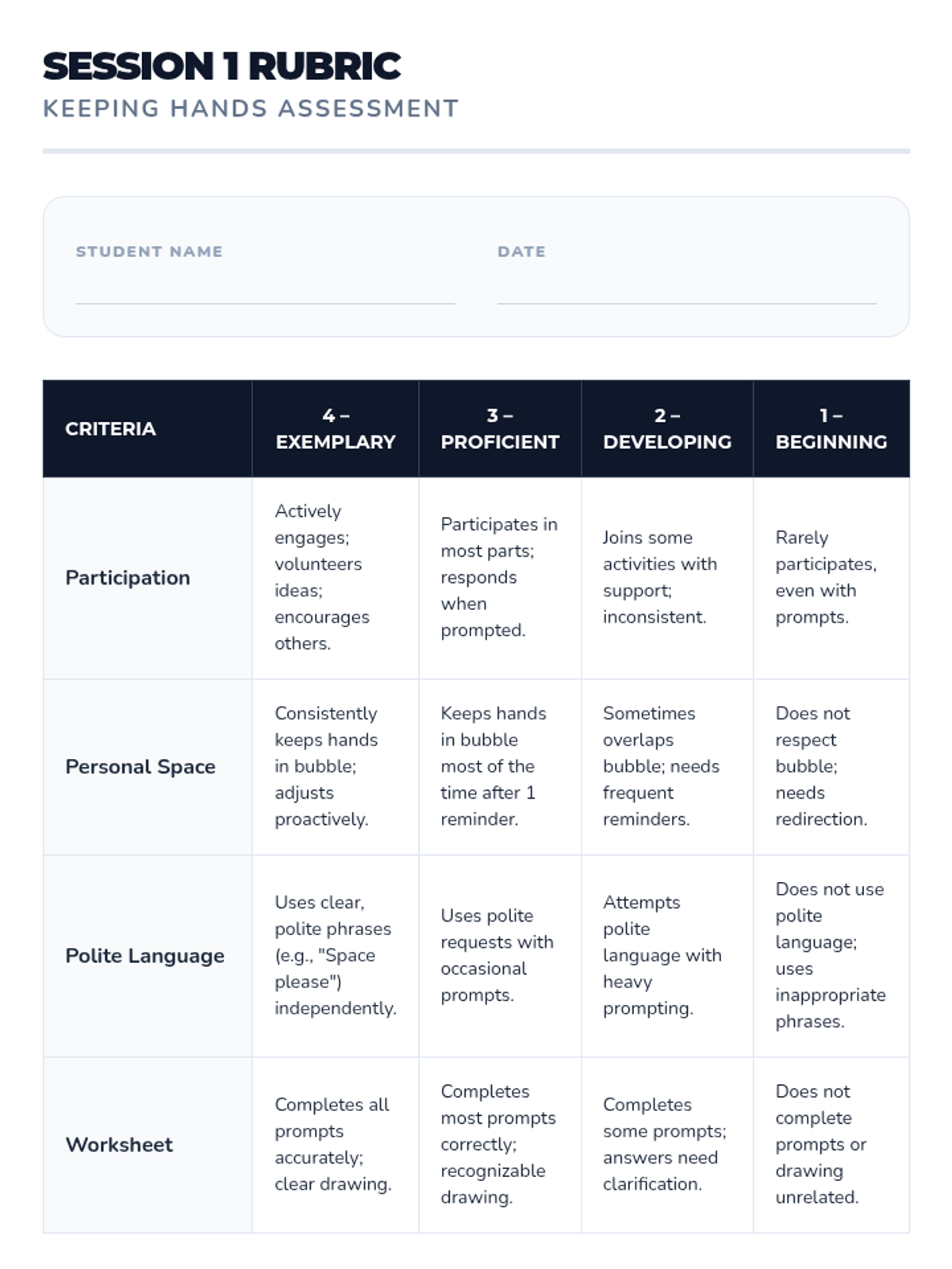A four-session Tier 2 social skills intervention designed for students with severe needs. The sequence focuses on teaching the importance of personal space, identifying safe versus unsafe touches, and practicing appropriate hand behaviors through interactive activities and direct instruction.