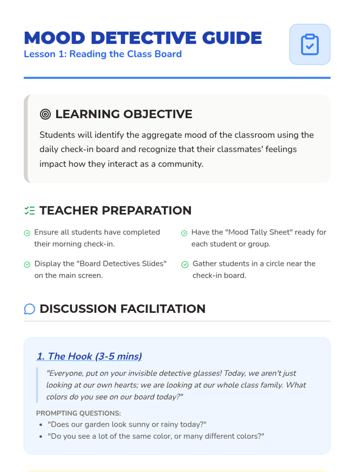 This sequence teaches Pre-K students how to use daily check-in data to foster empathy and social awareness. Students learn to observe how their peers are feeling and practice appropriate, regulated responses to support their classroom community.