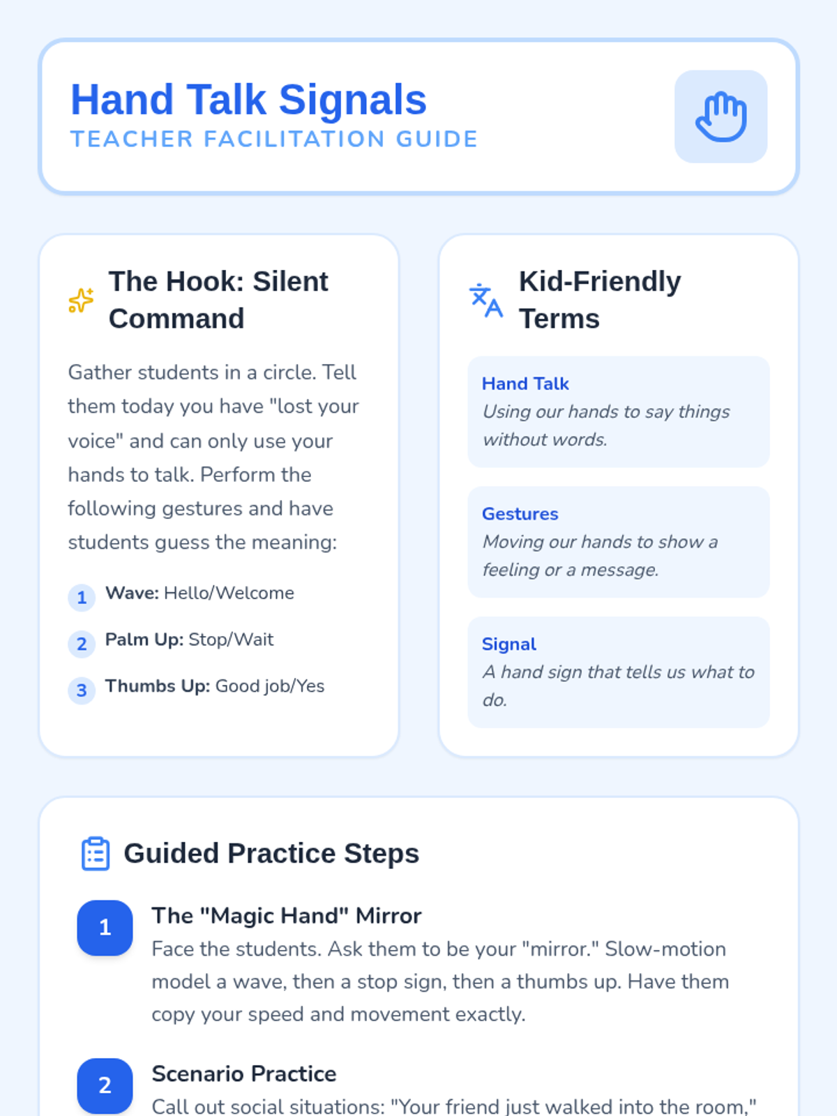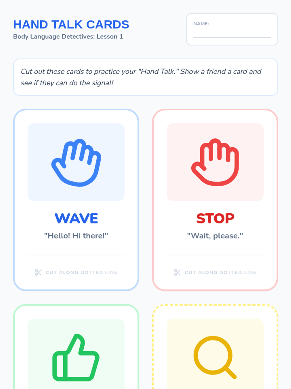 A comprehensive sequence for Pre-K students focused on interpreting non-verbal cues including hand gestures, body posture, and personal space boundaries. Students learn to become 'Body Language Detectives' to better understand their peers' feelings and intentions without words.