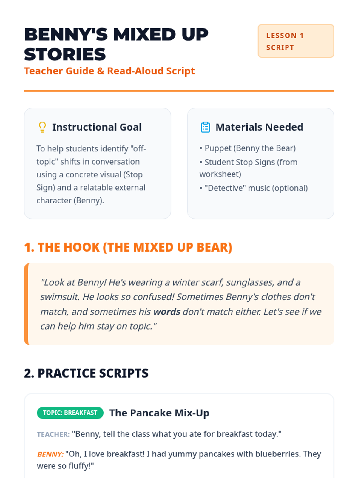 A foundational social communication sequence for Pre-K students to distinguish between on-topic and off-topic comments. Using puppet modeling and 'conversation detective' activities, students learn to identify and correct errors in topic maintenance in a low-anxiety environment.