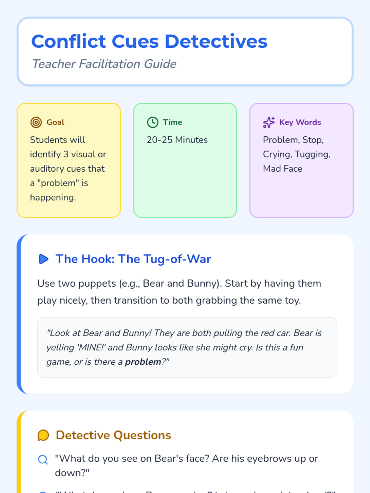 A 5-lesson sequence for Pre-K students focused on identifying social conflicts and using verbal strategies to resolve them. Students learn to recognize cues, self-regulate, use 'I' statements, distinguish intent, and seek help appropriately.
