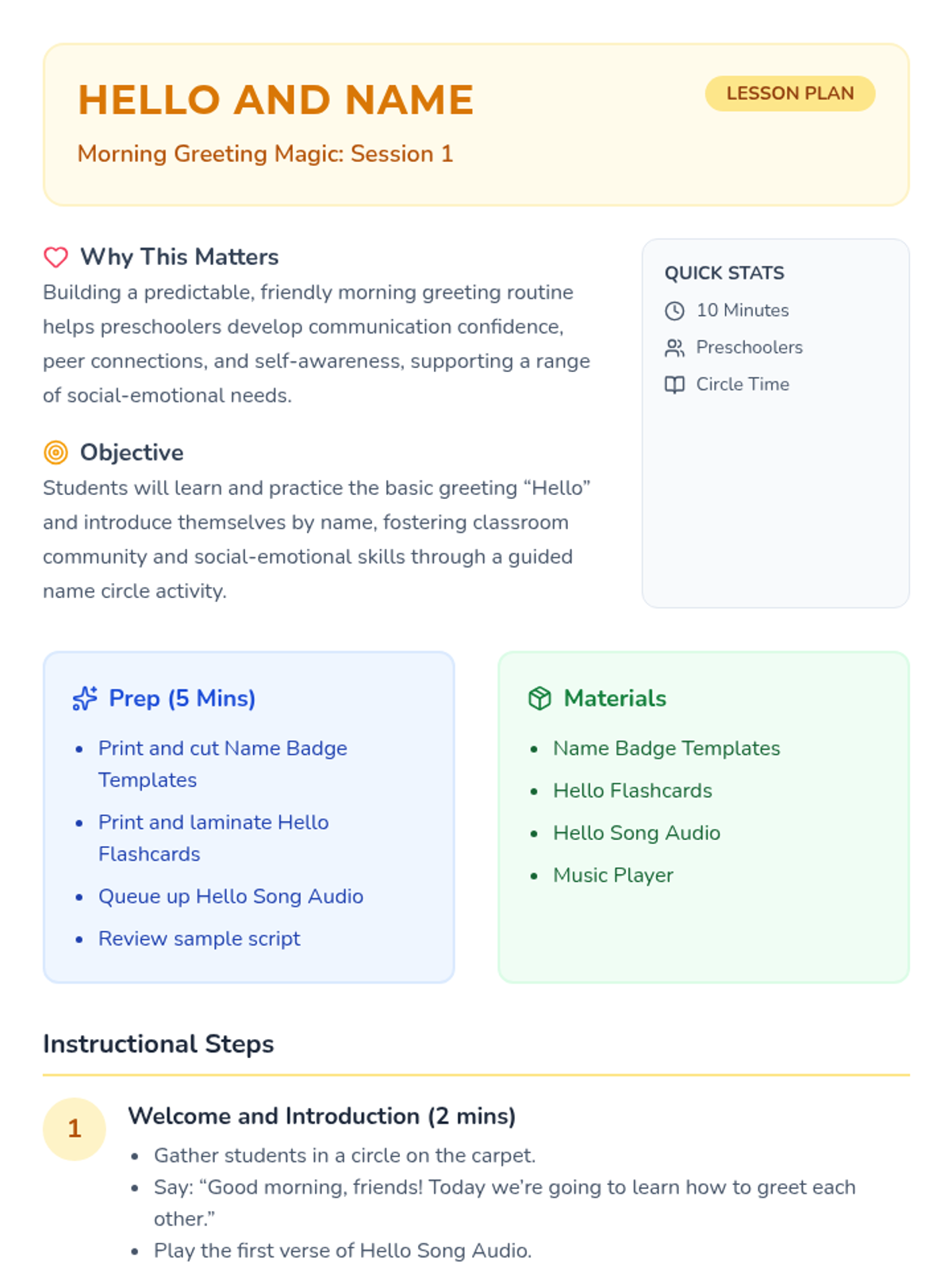 A 5-session preschool series focused on teaching friendly morning greetings to build social-emotional skills, classroom community, and communication confidence. Each 10-minute session introduces a new interactive greeting with modeling, scripts, and hands-on activities.