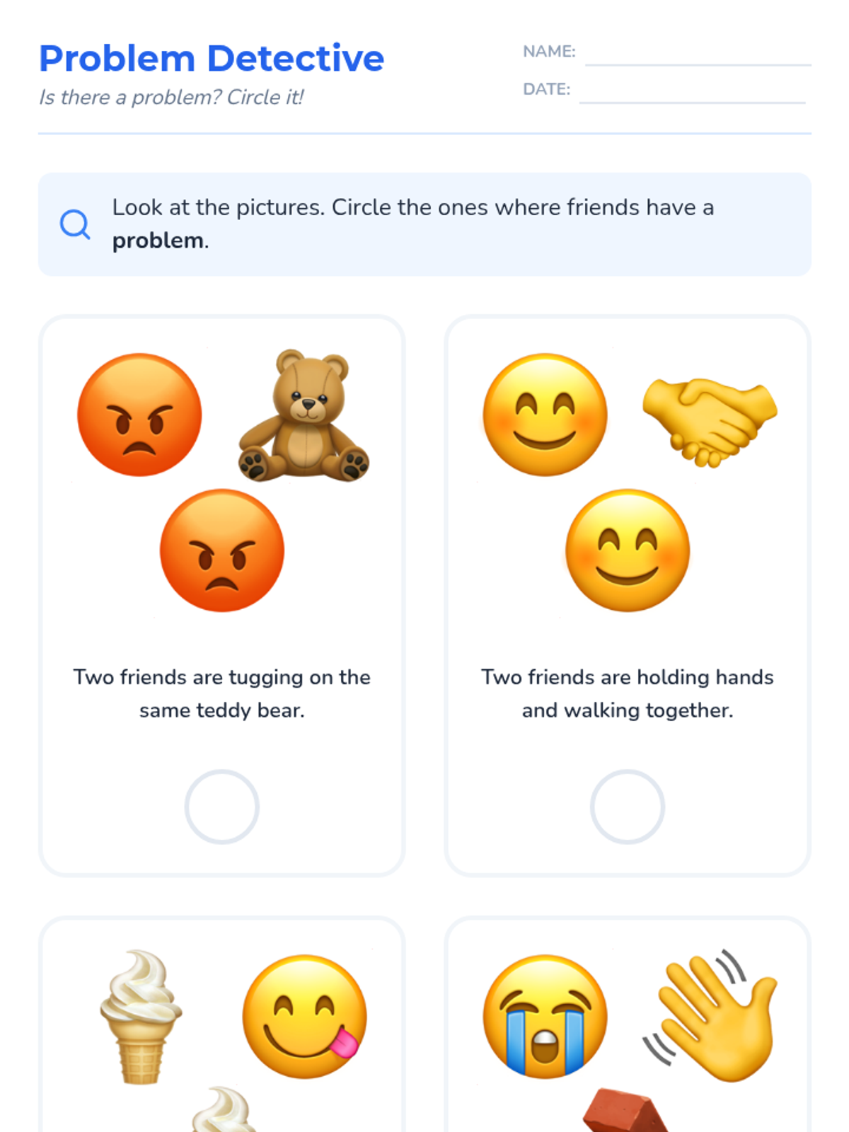 A Pre-K sequence focused on teaching specific social problem-solving strategies. Students learn to use a 'Solution Kit' of visual cards to navigate conflicts like sharing, trading, and taking turns through games, simulations, and creative brainstorming.