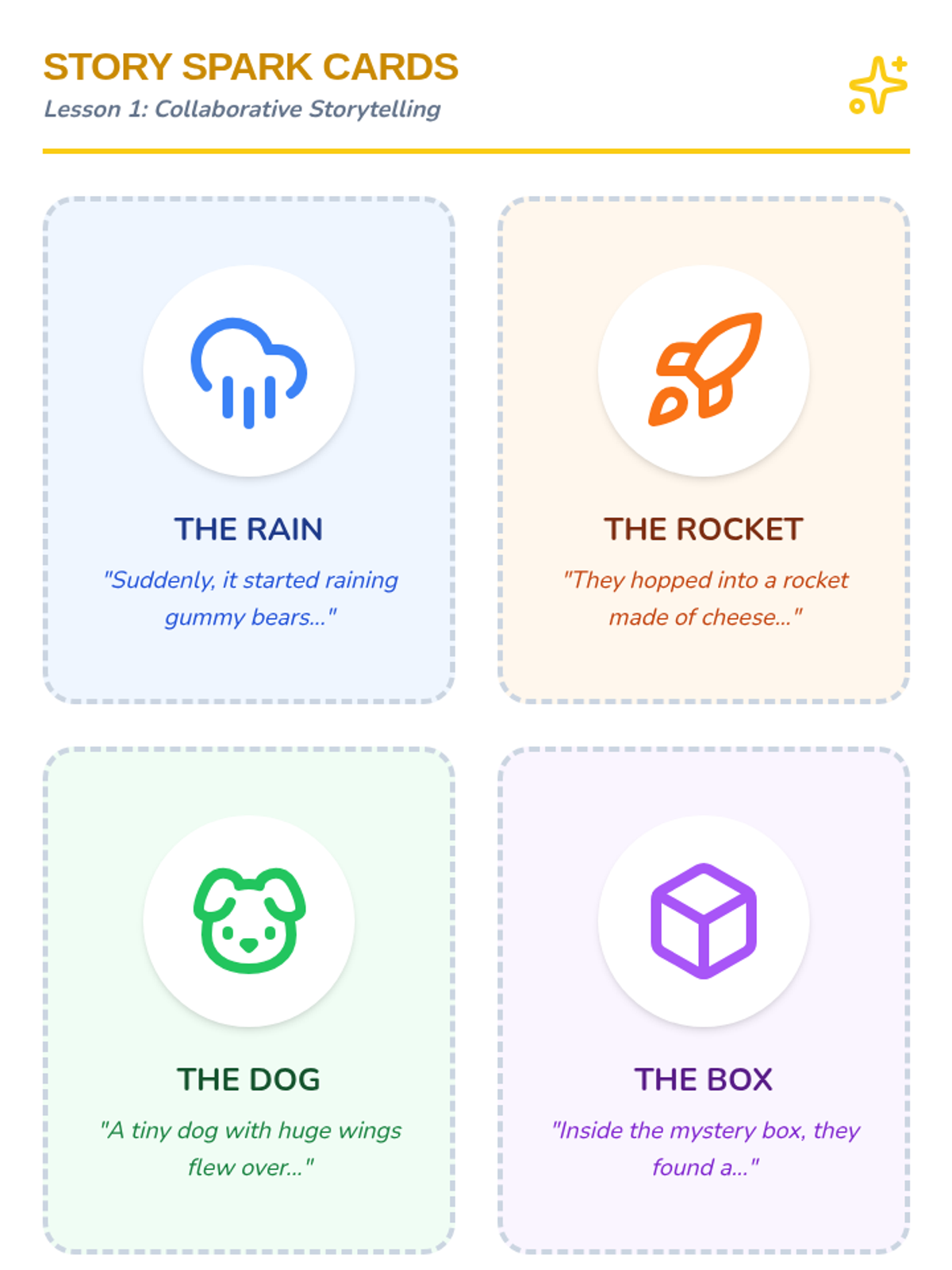 This sequence introduces collaborative idea generation, teaching Pre-K students that working together can produce more and better ideas than working alone. Through 'improv' style games and creative projects, students practice listening, adding to others' contributions, and building shared narratives.