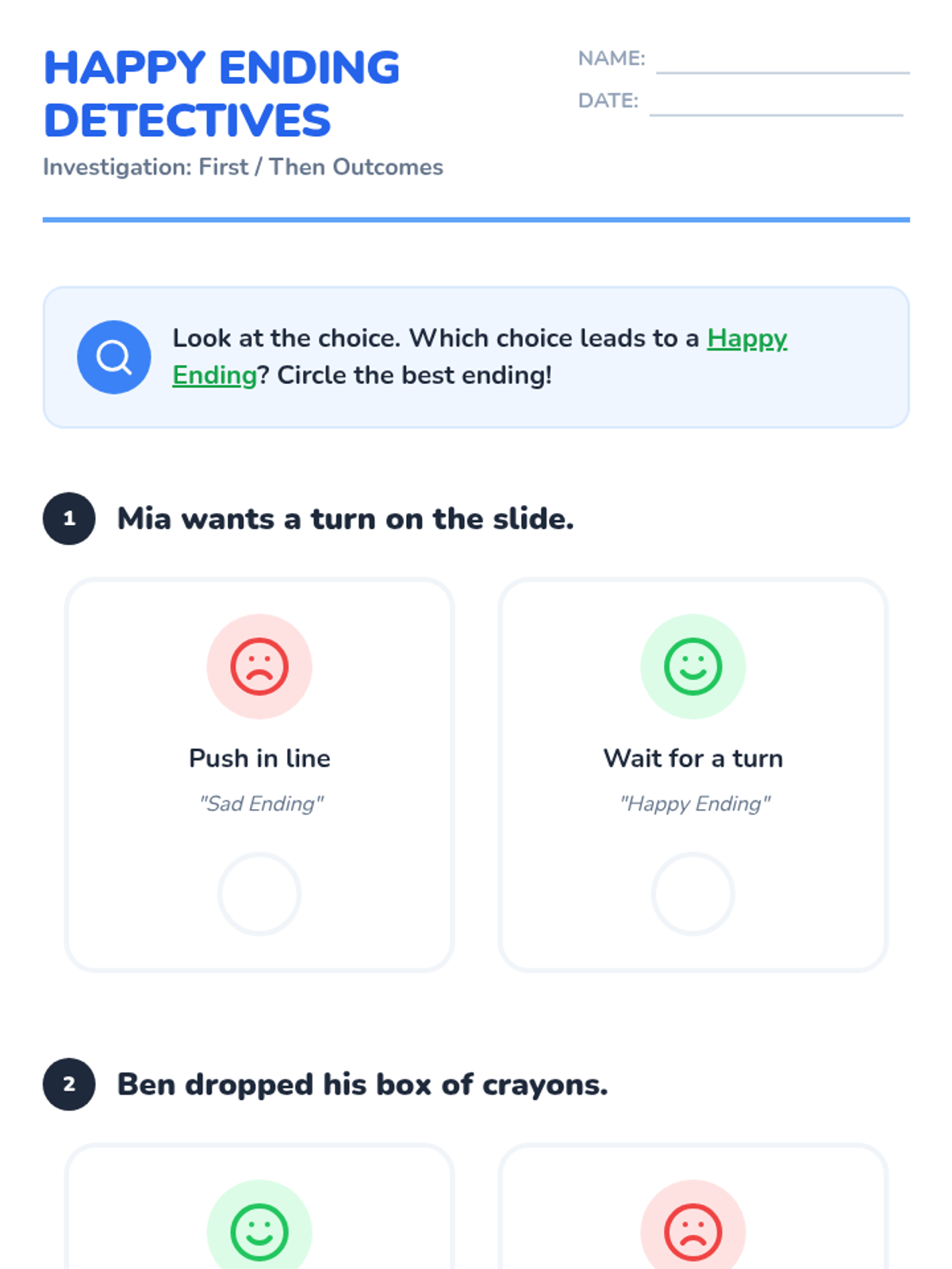 This sequence teaches Pre-K students how to evaluate the consequences of their social choices using a 'Green Choice' vs. 'Red Choice' framework. Students will learn to predict outcomes, understand the emotional impact of their actions on others, and practice repair strategies when mistakes are made.